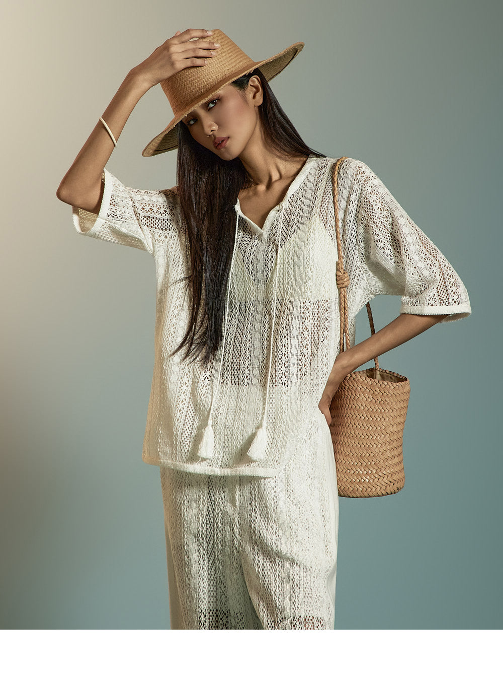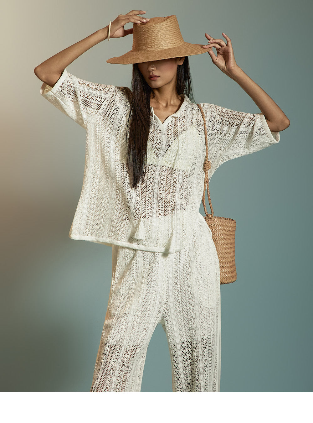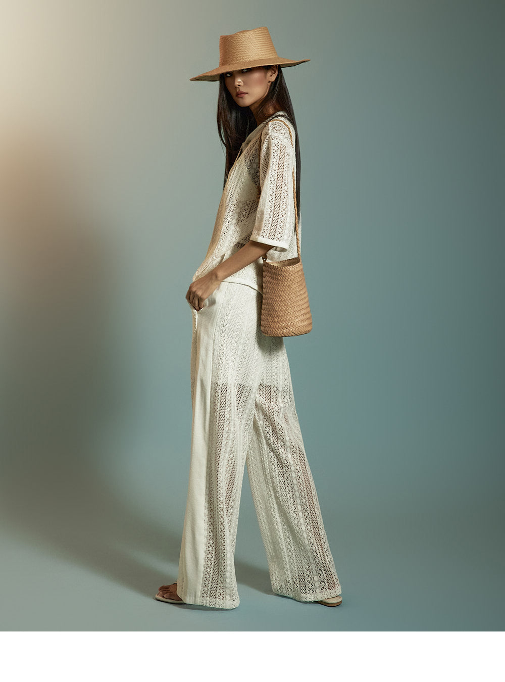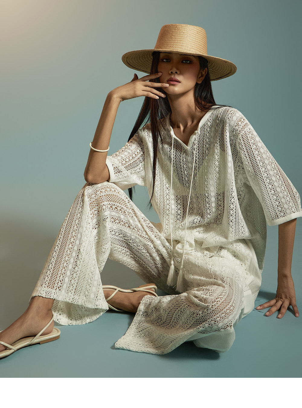 This is a pair of lace see-through pants with a relaxed, casual vibe.