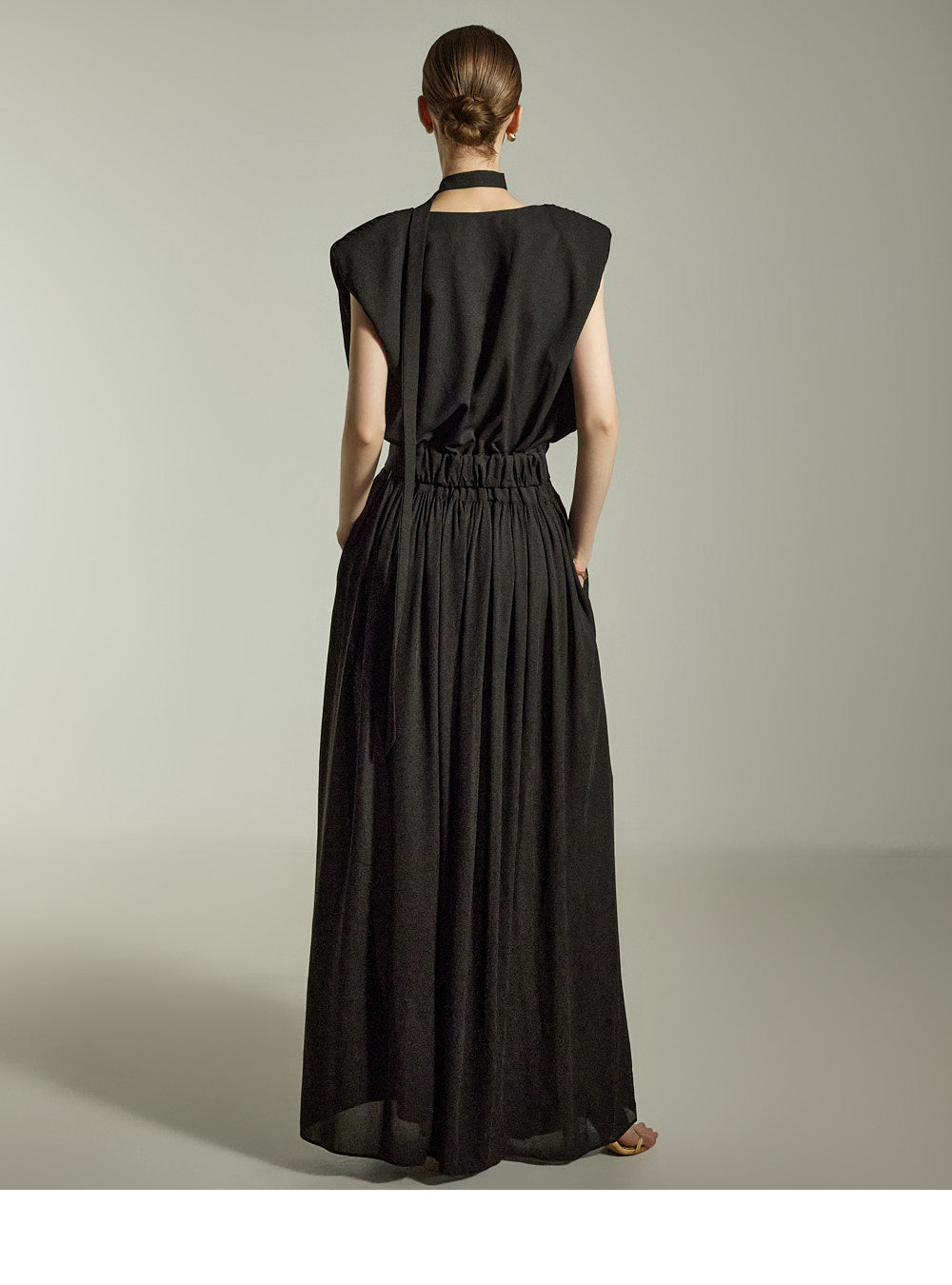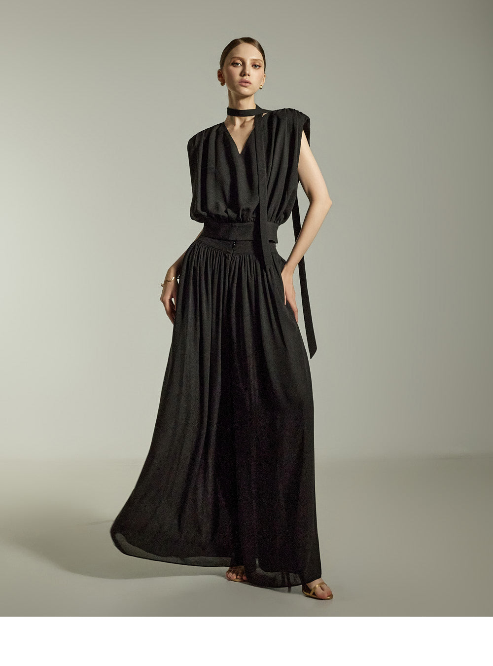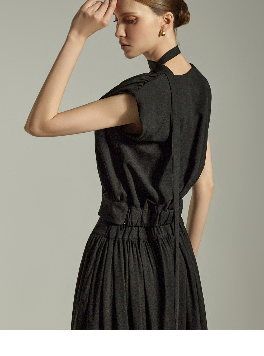 while the pleated details on the front and back add a soft, feminine touch.