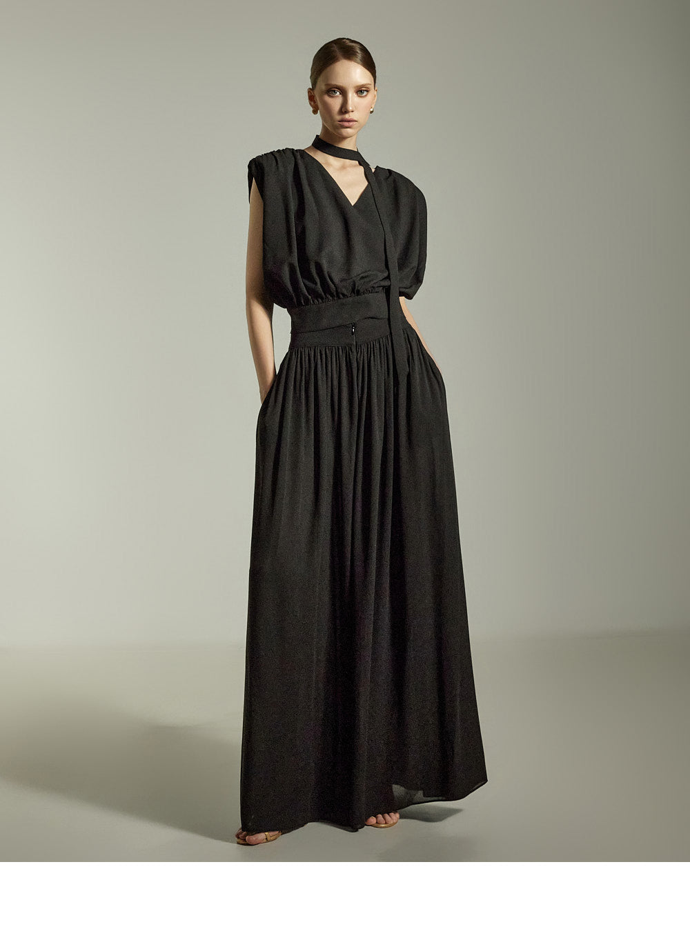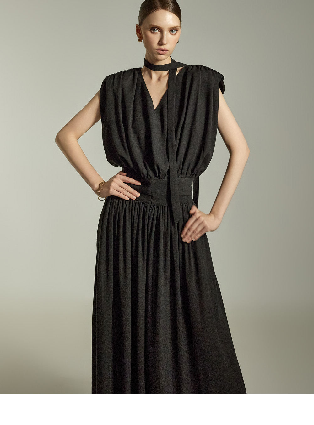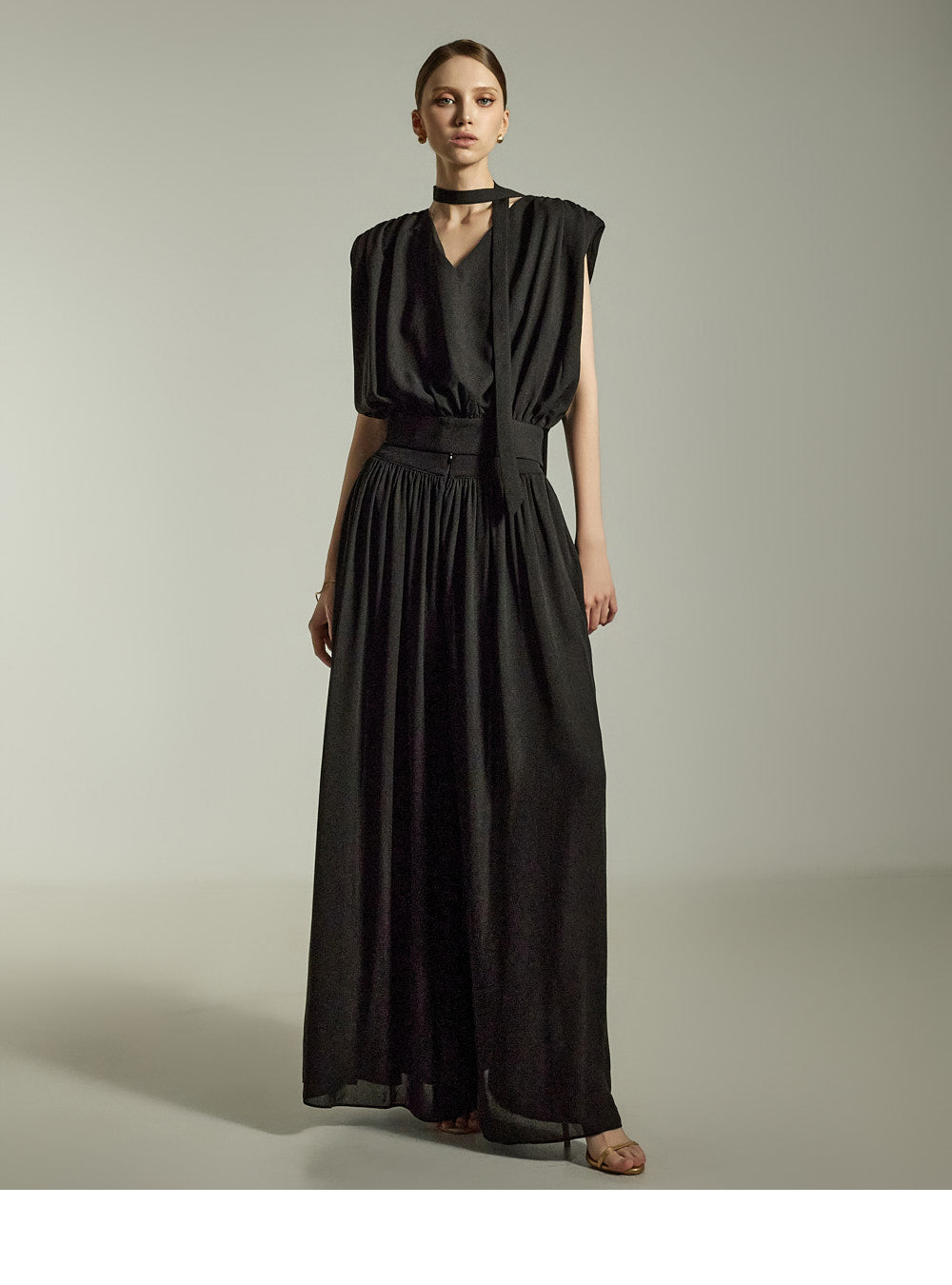 while the pleated details on the front and back add a soft, feminine touch.