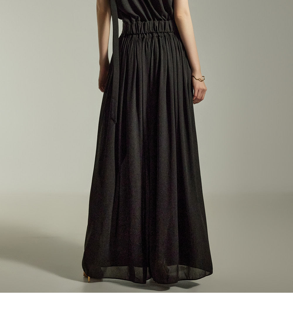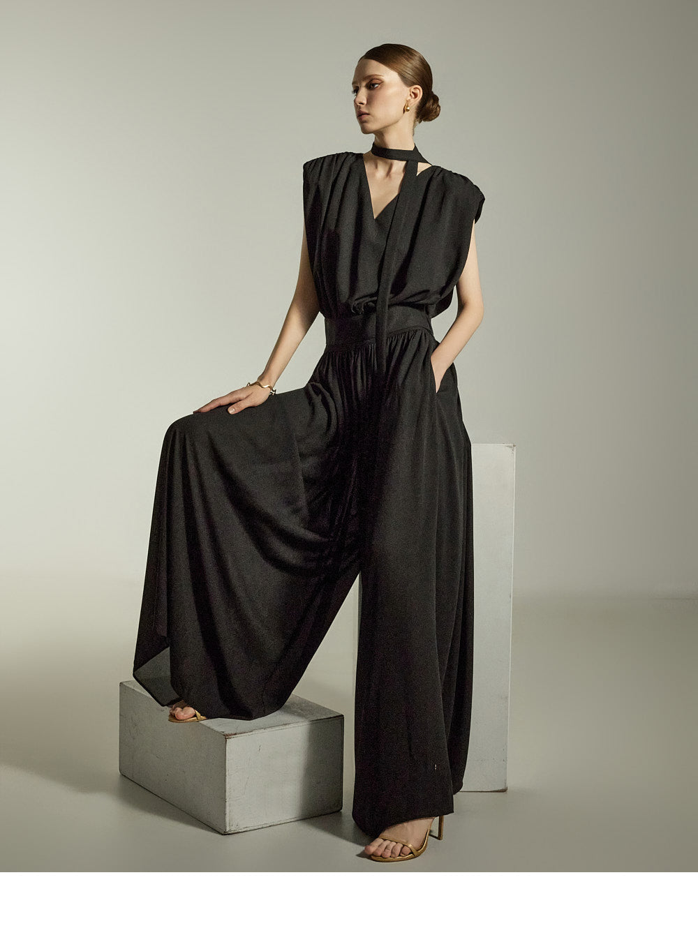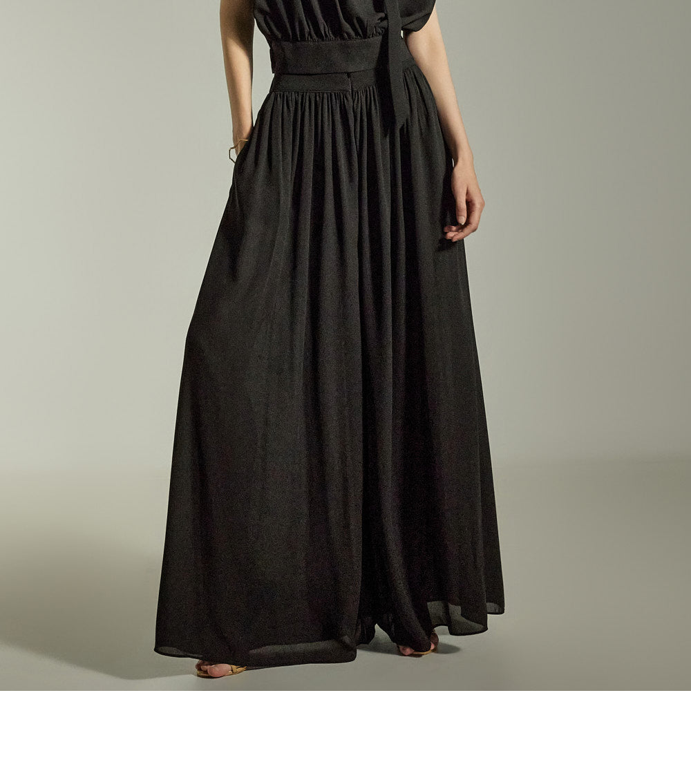 The loose wide-leg silhouette creates a graceful and stylish outline,