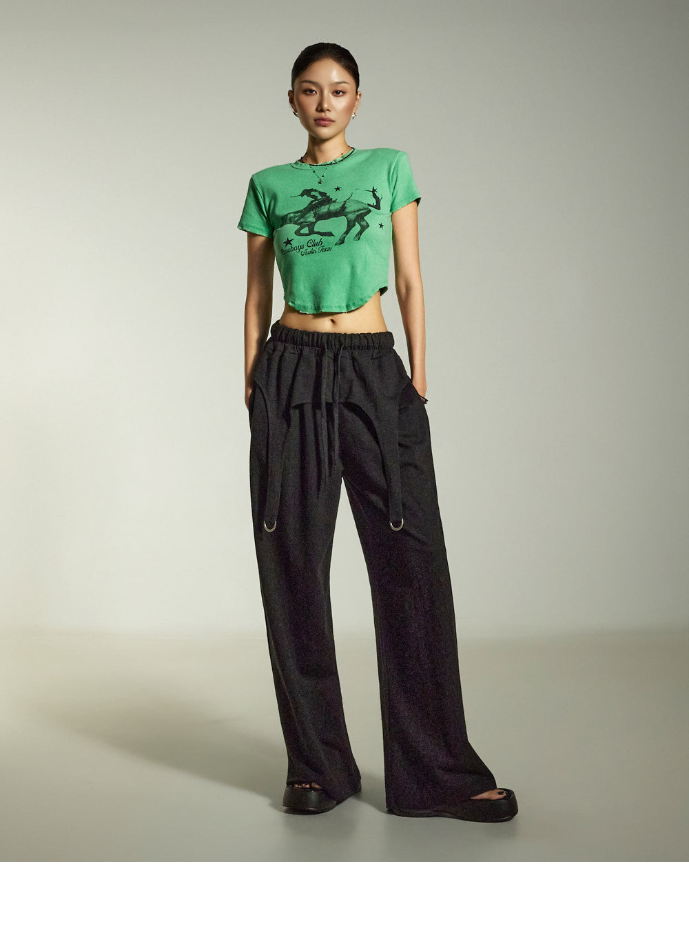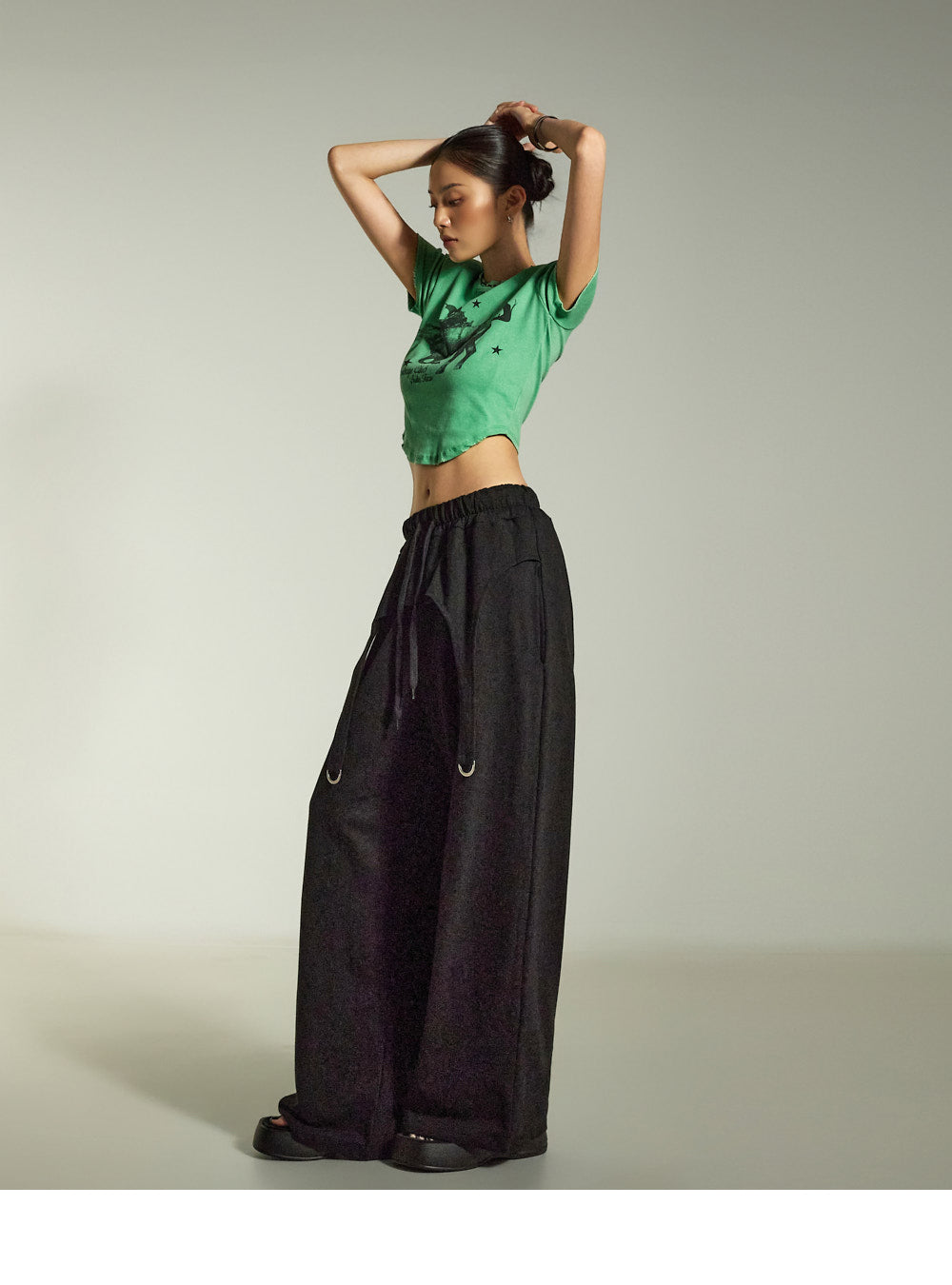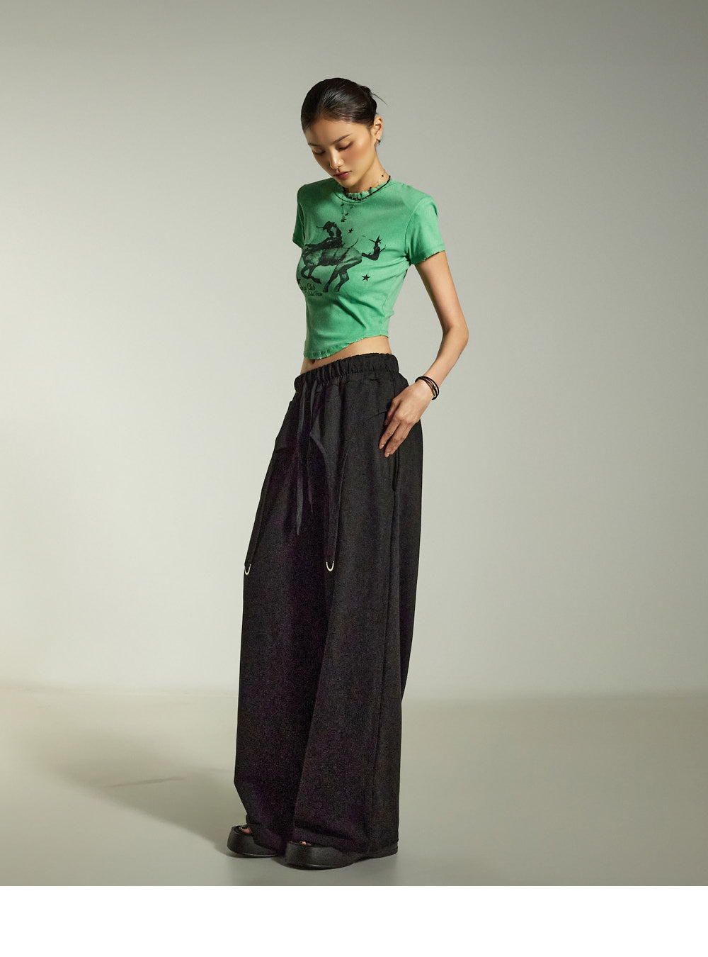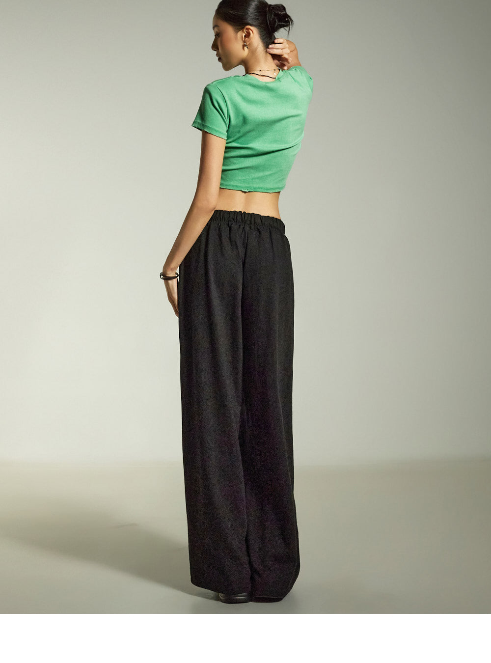 while the relaxed wide-leg silhouette naturally flatters the figure.