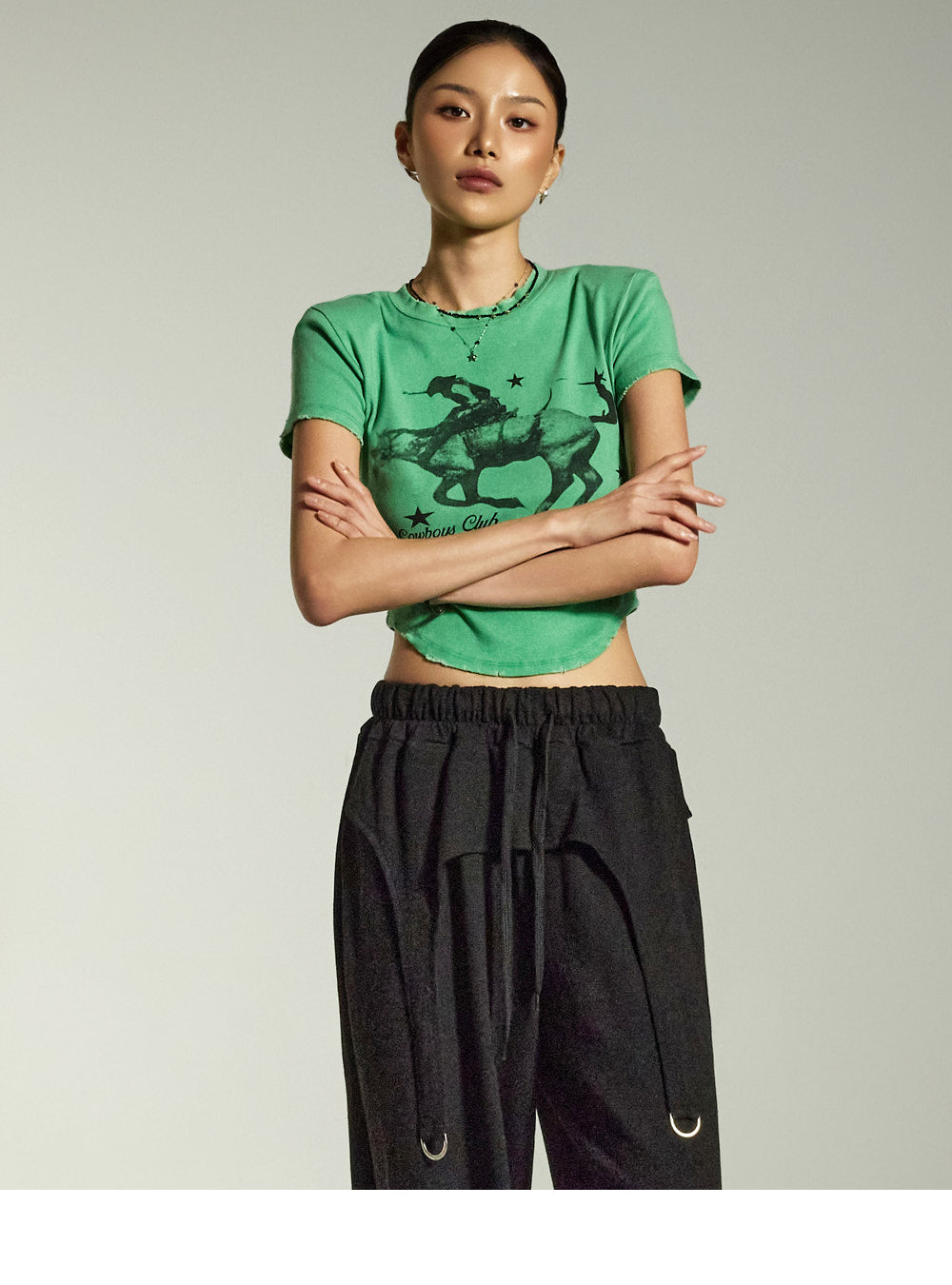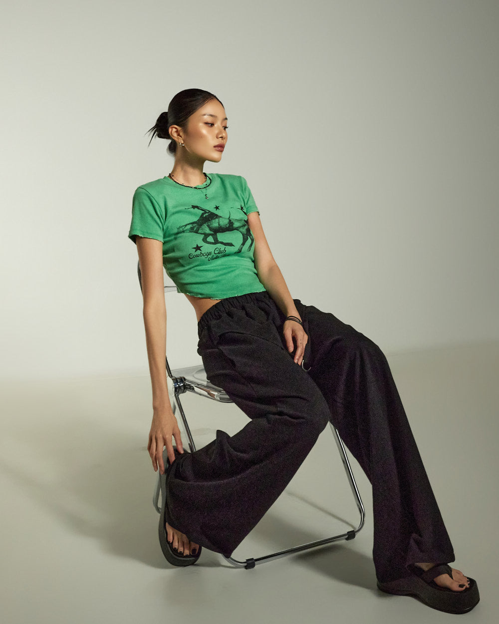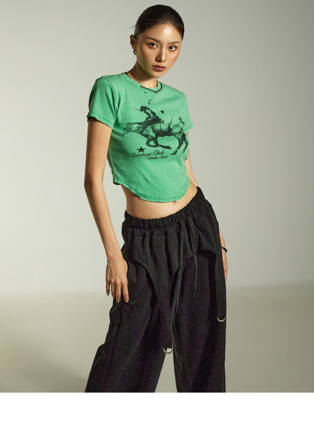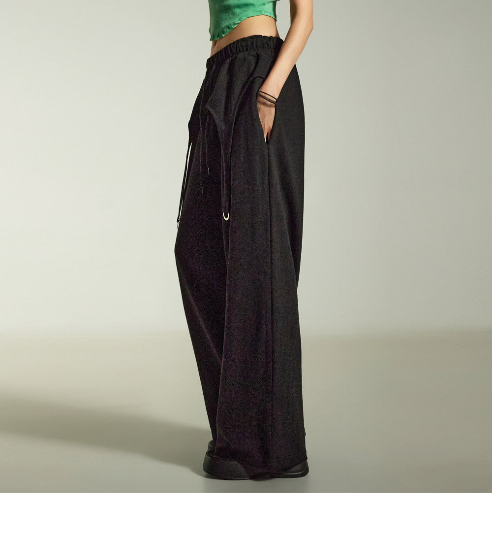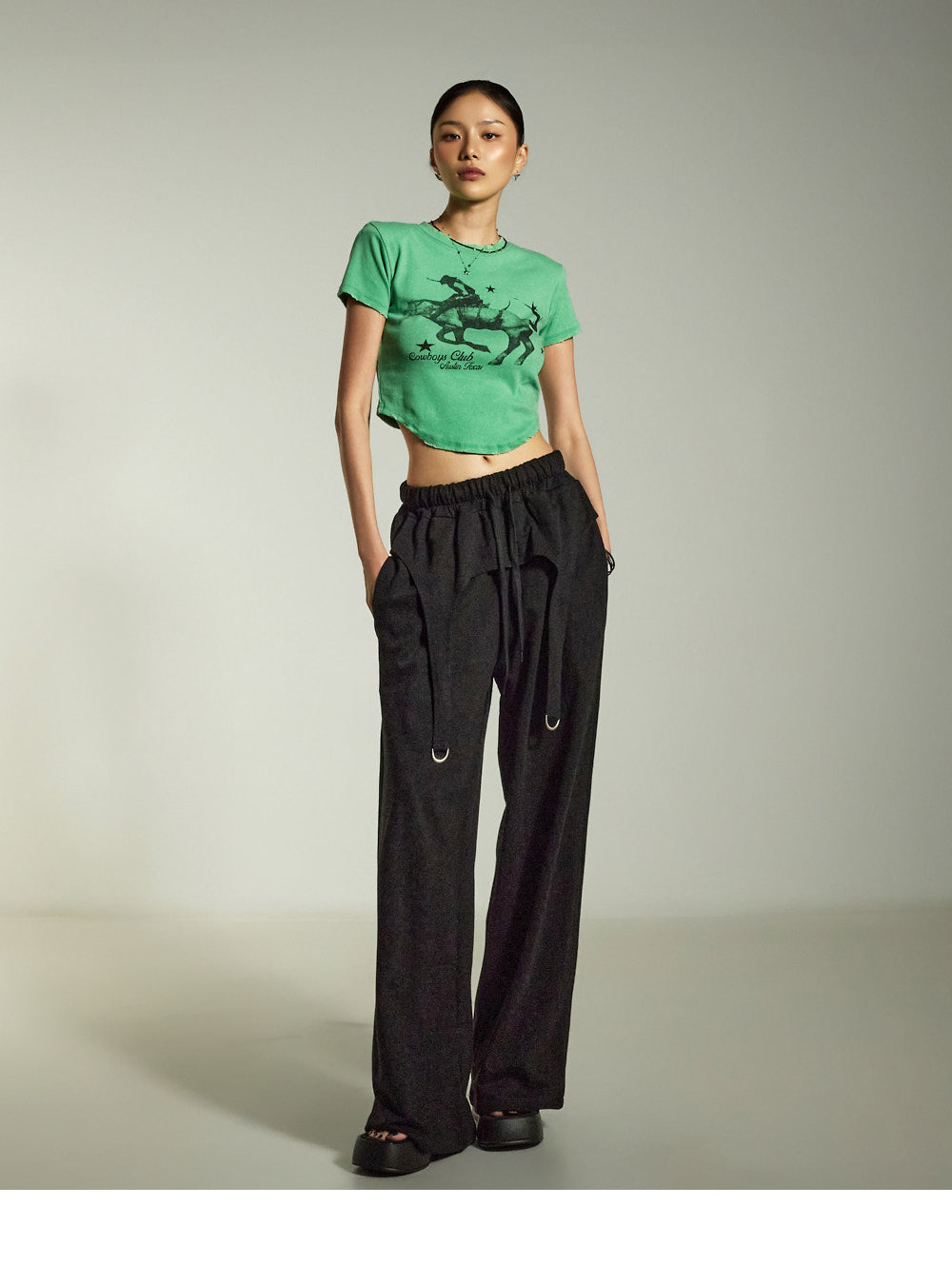 while the relaxed wide-leg silhouette naturally flatters the figure.