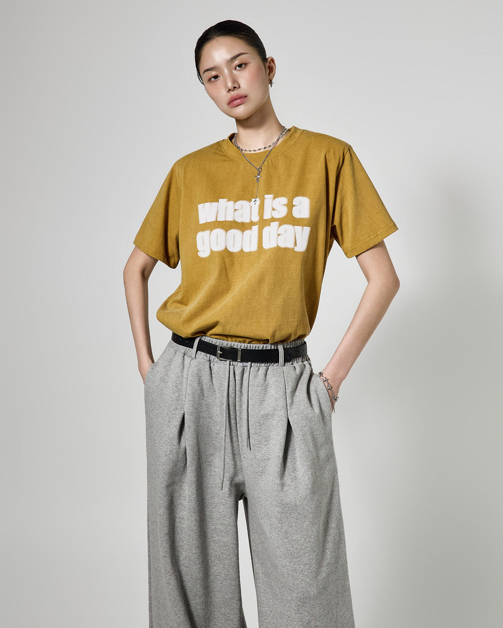 These wide pintuck training pants have a casual vibe.
