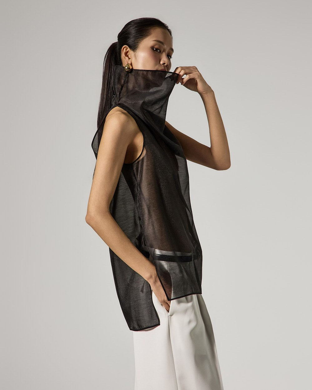 The hook and zipper closures ensure a clean look, while the side pockets and back pocket details add practicality.