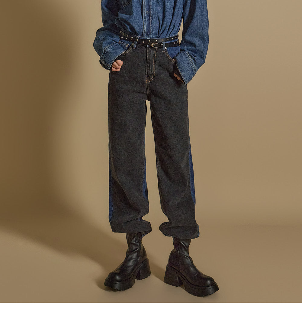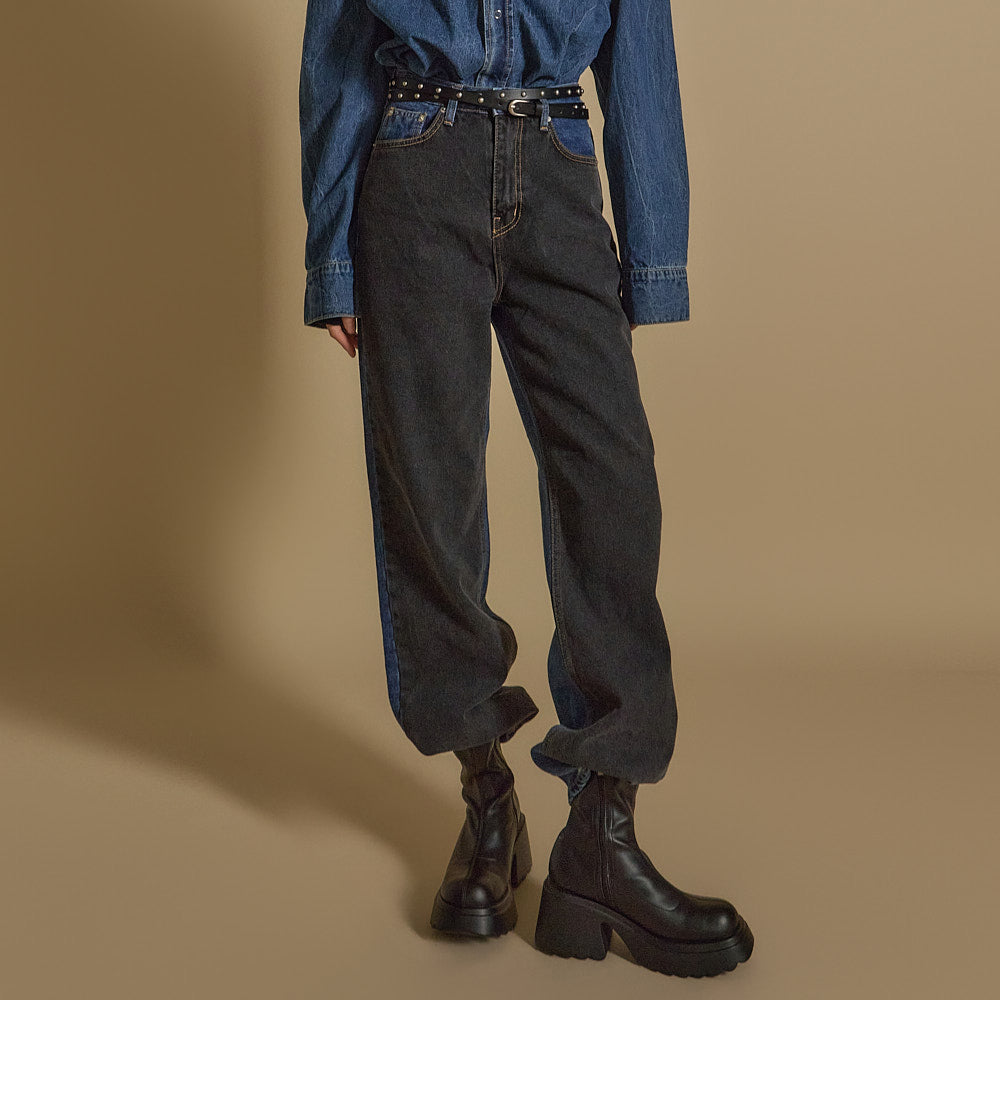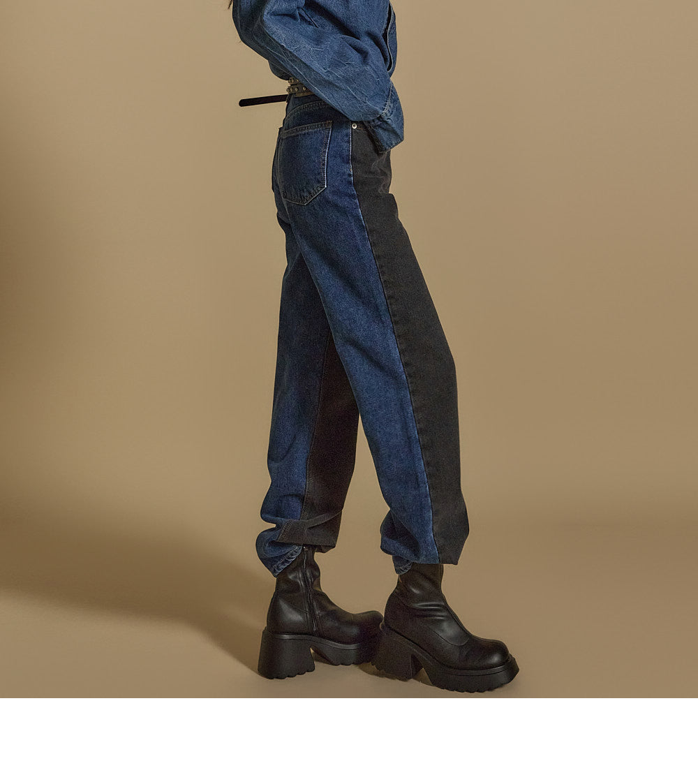 These are stylish color-blocked jeans.