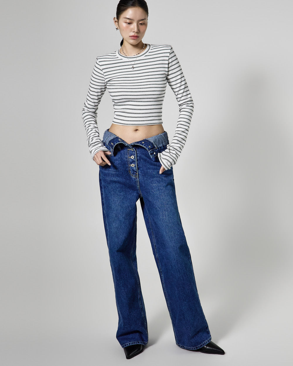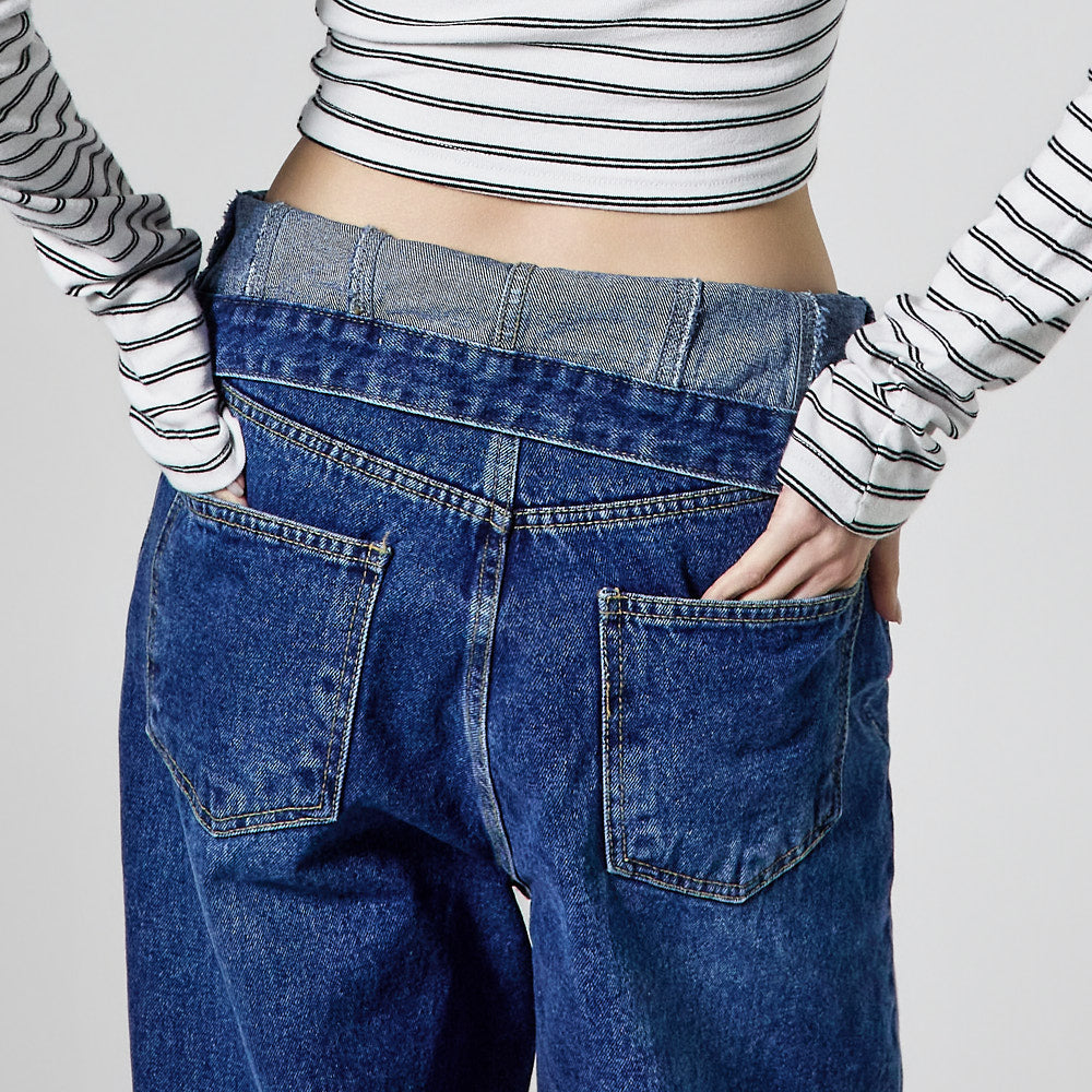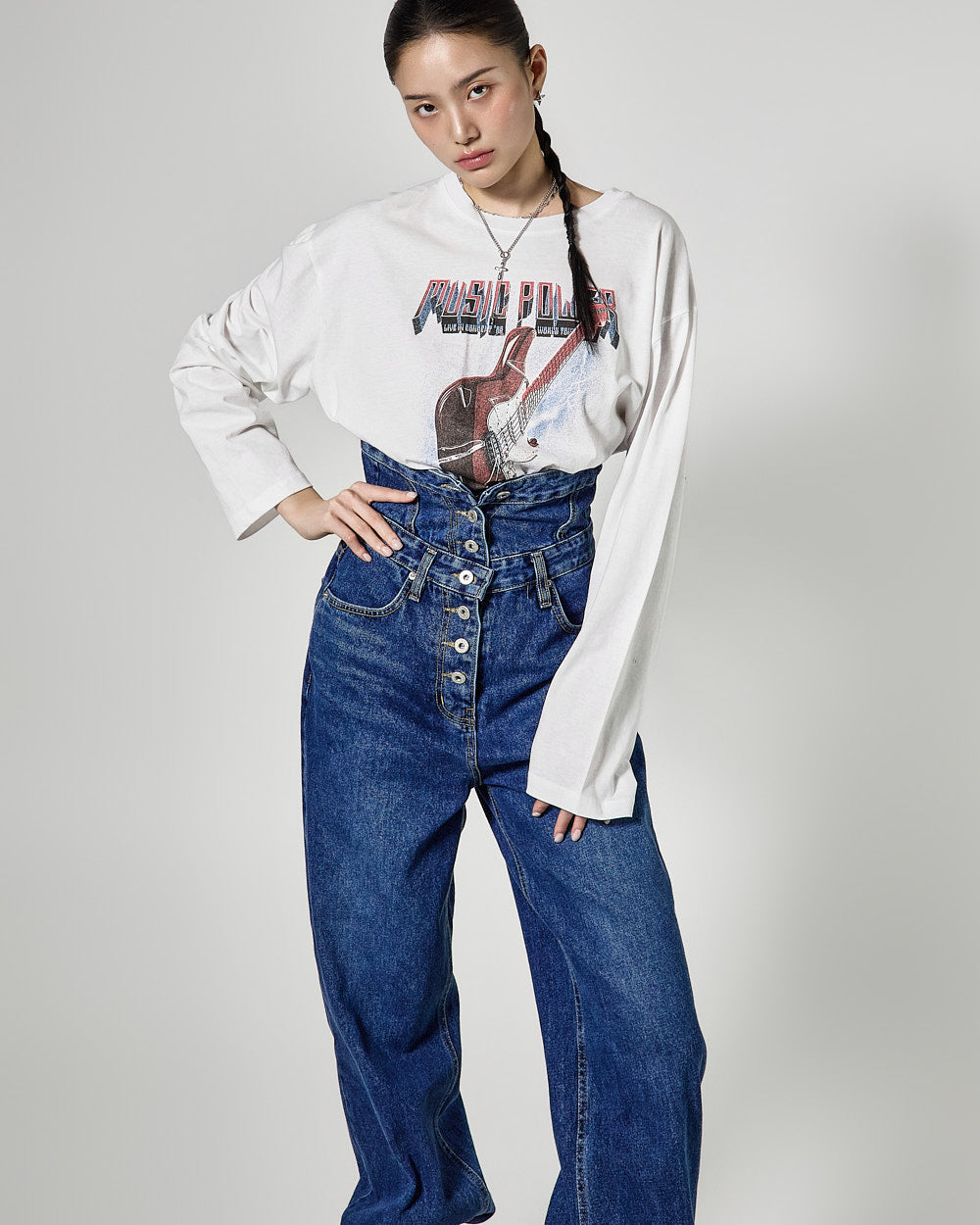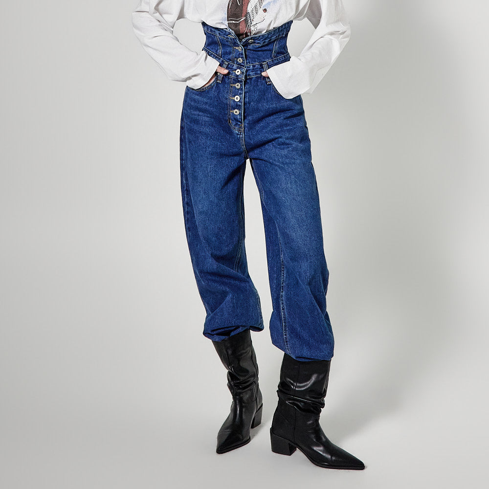 The high-waisted button detail and wide fit combine to create a classic yet unique silhouette,