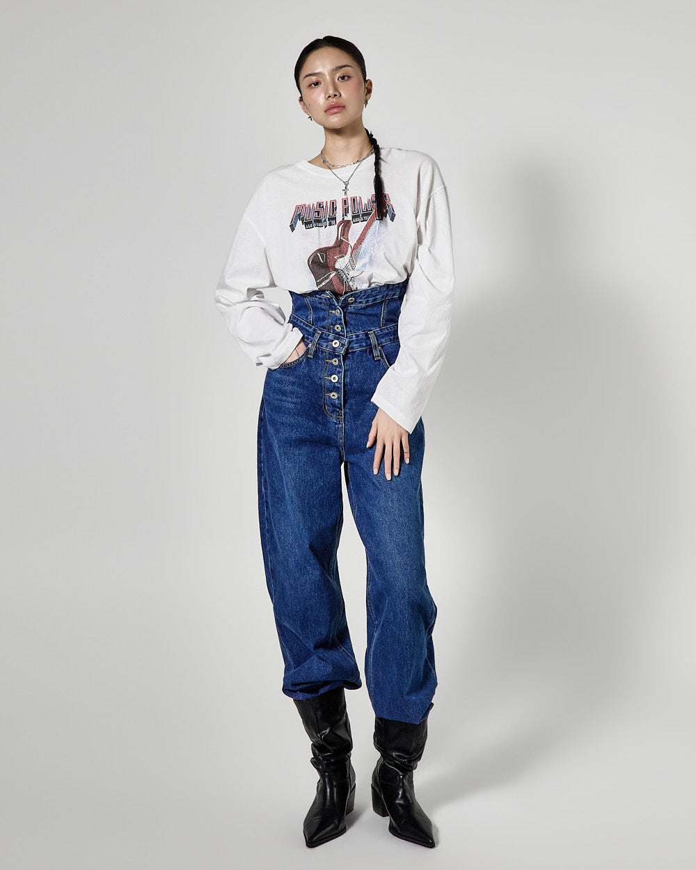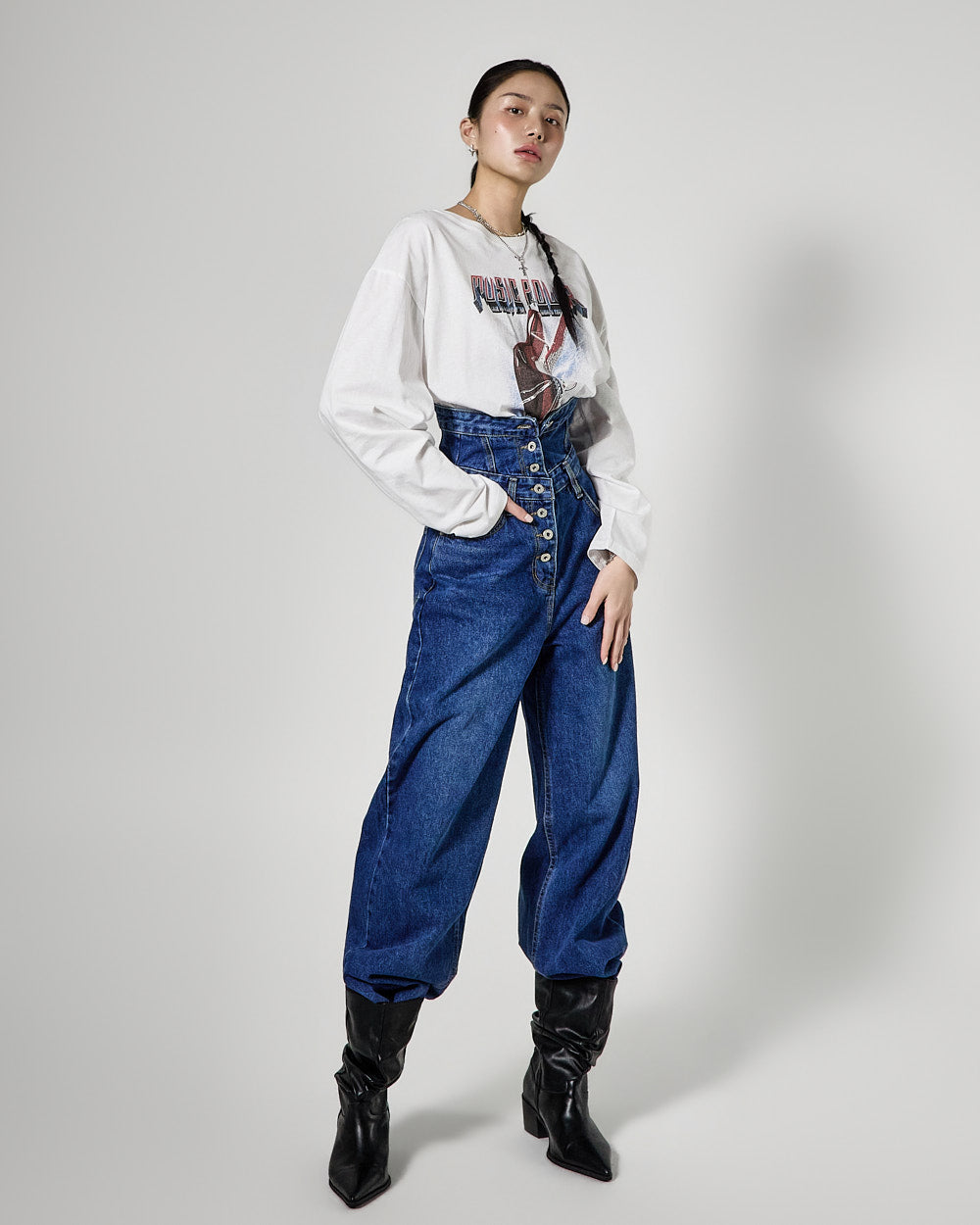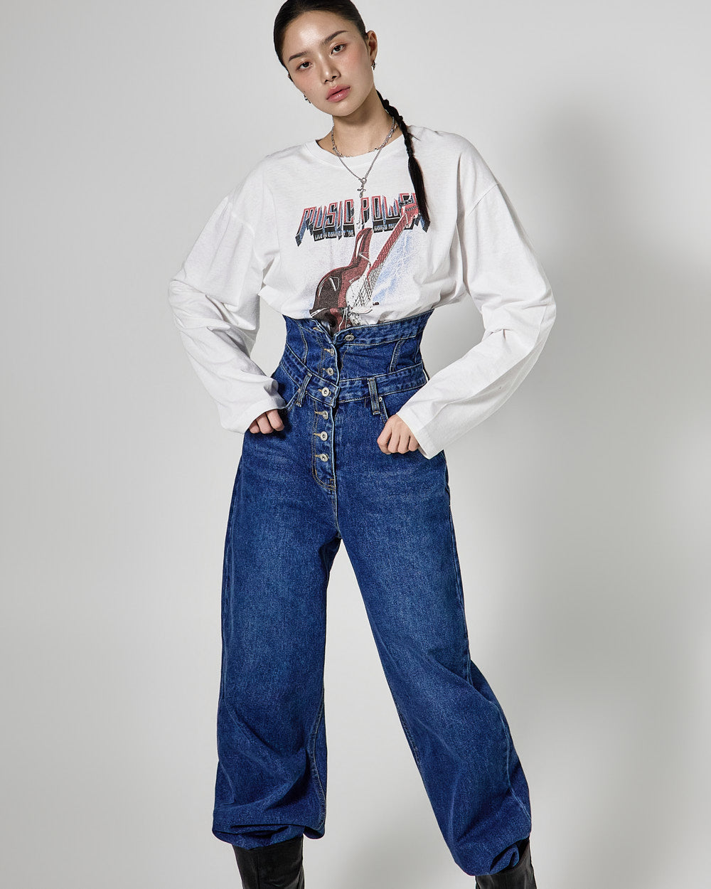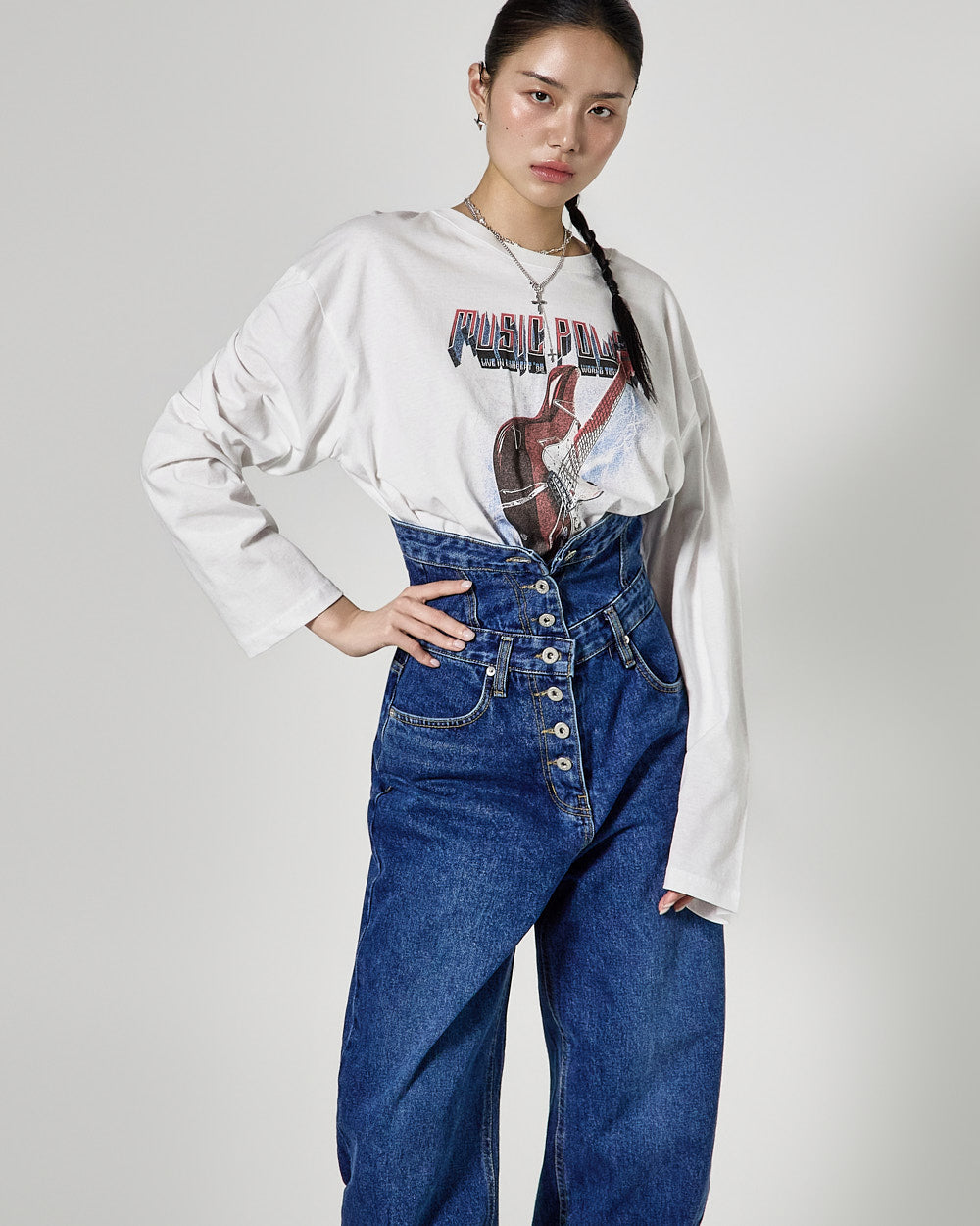 The high-waisted button detail and wide fit combine to create a classic yet unique silhouette,