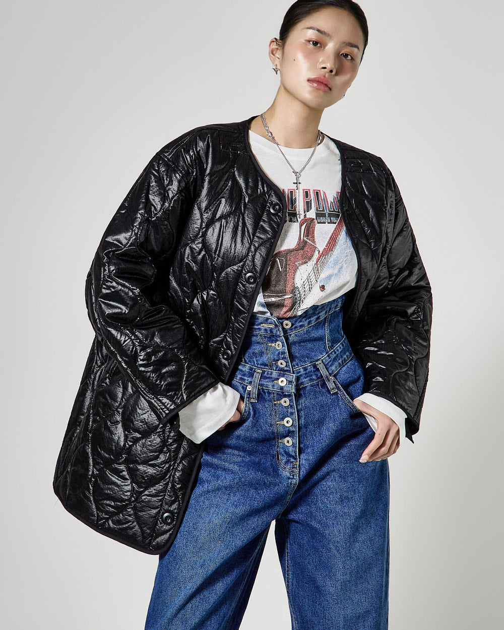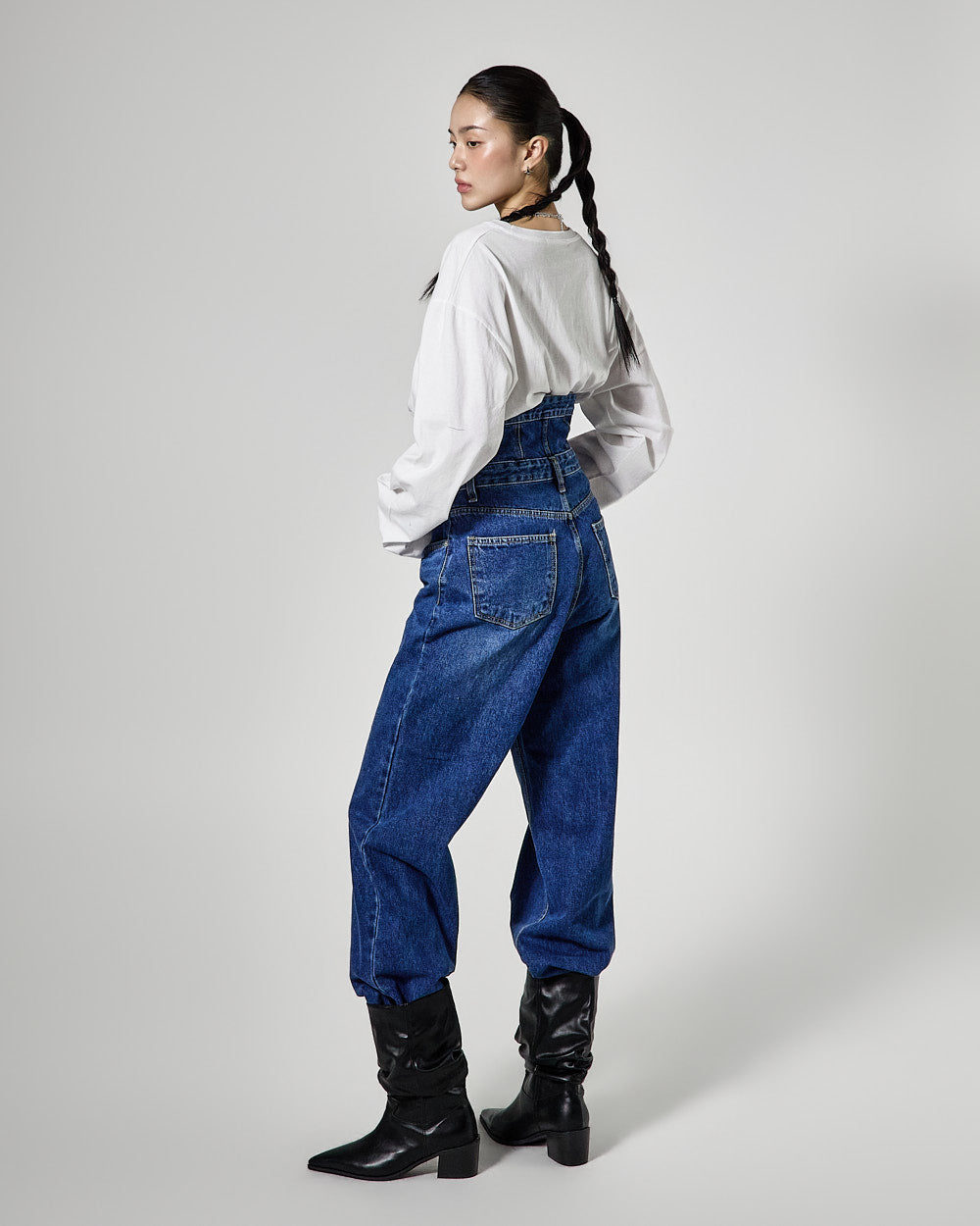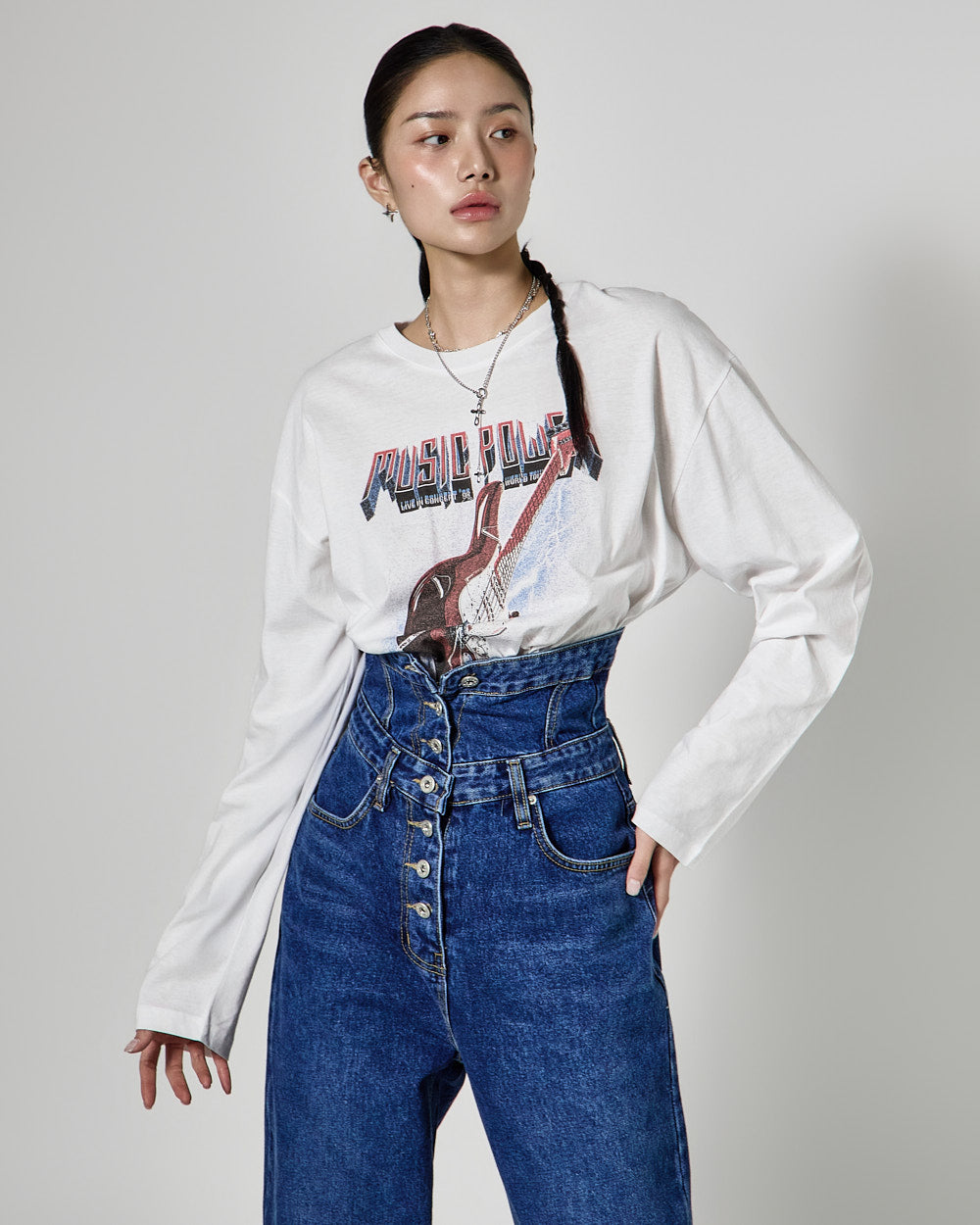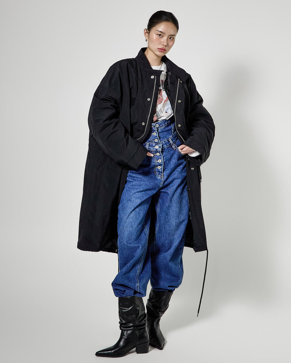 The high-waisted button detail and wide fit combine to create a classic yet unique silhouette,