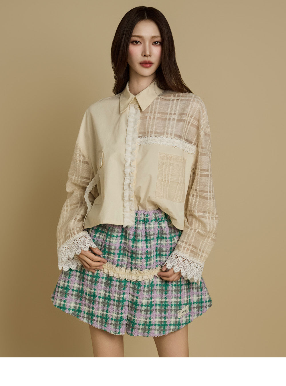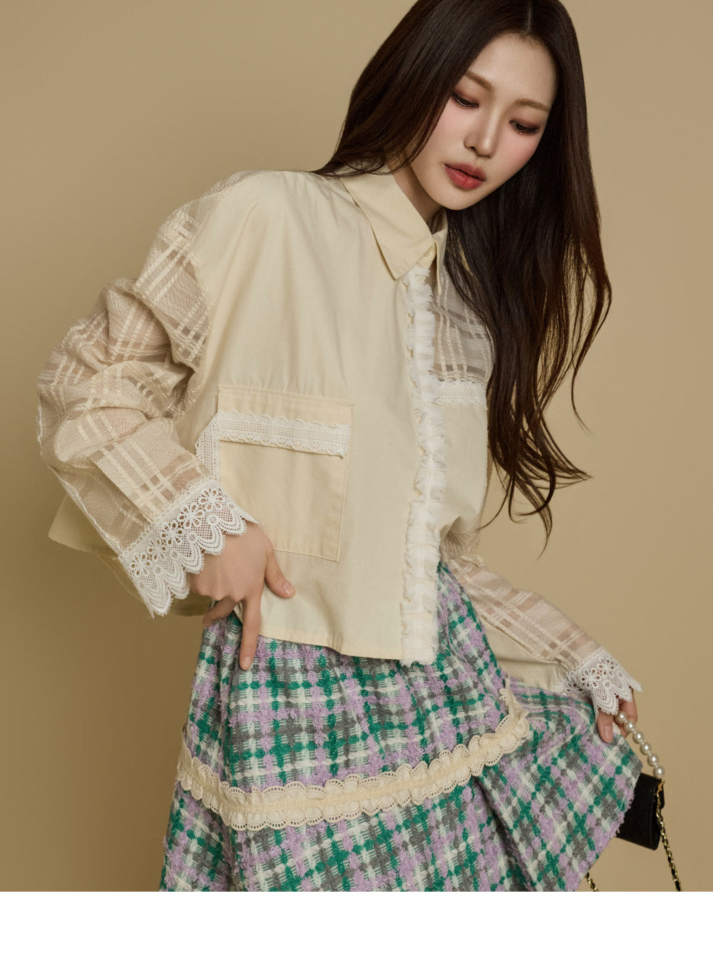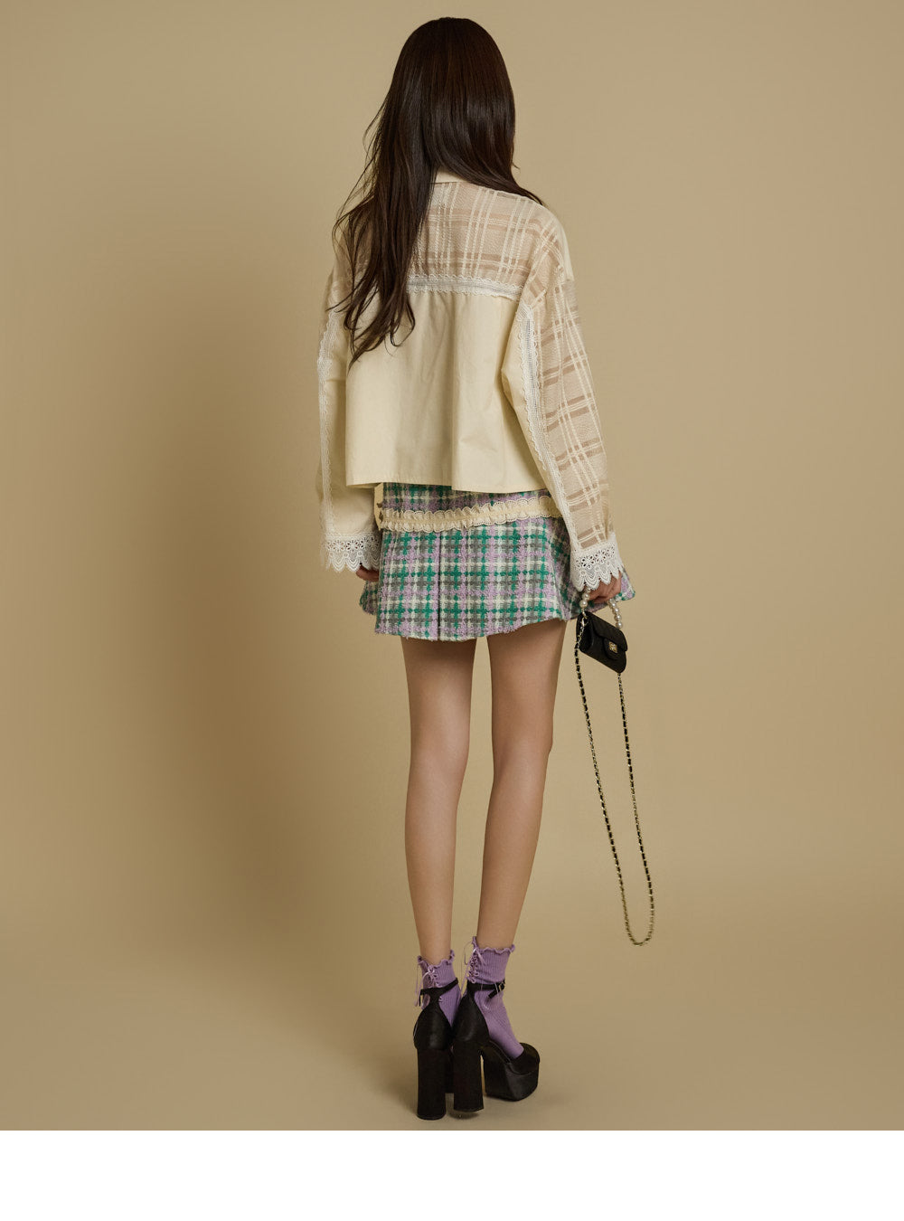 while the check pattern and lace accents add a unique touch.