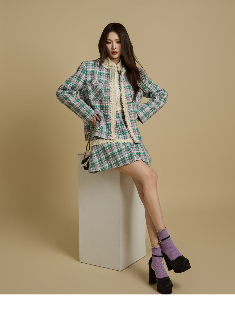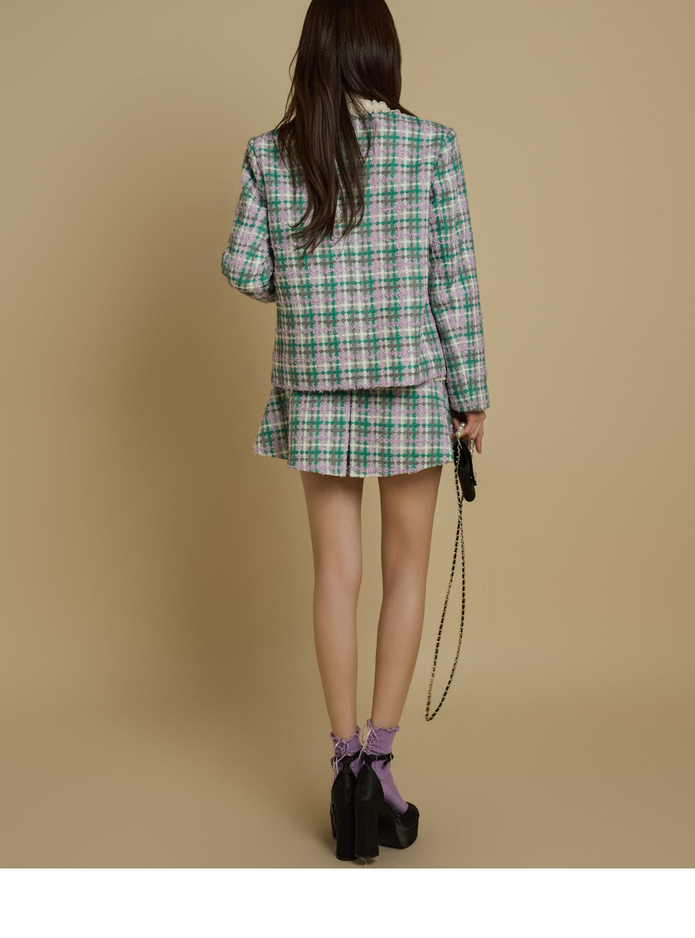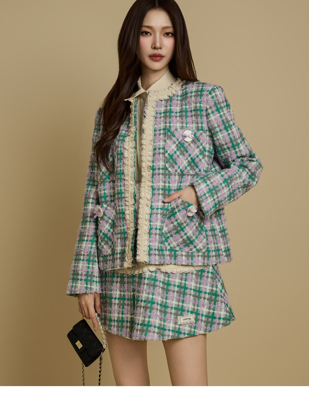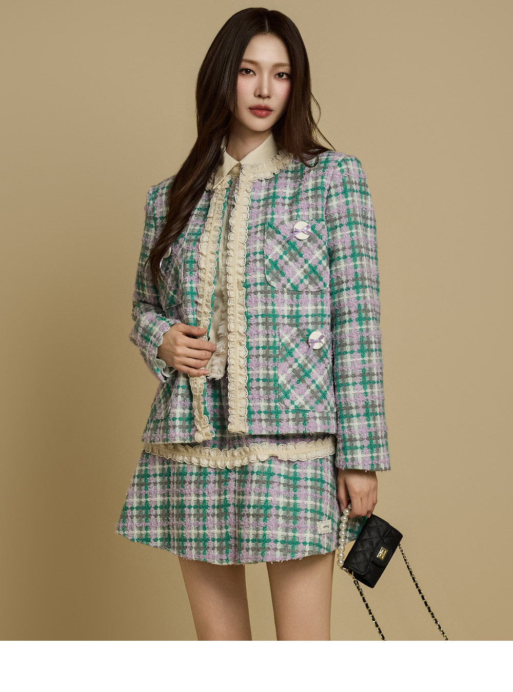 while the check pattern and lace accents add a unique touch.