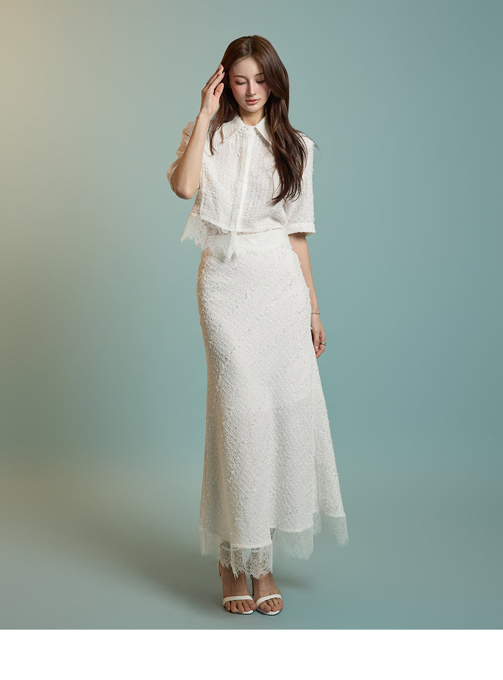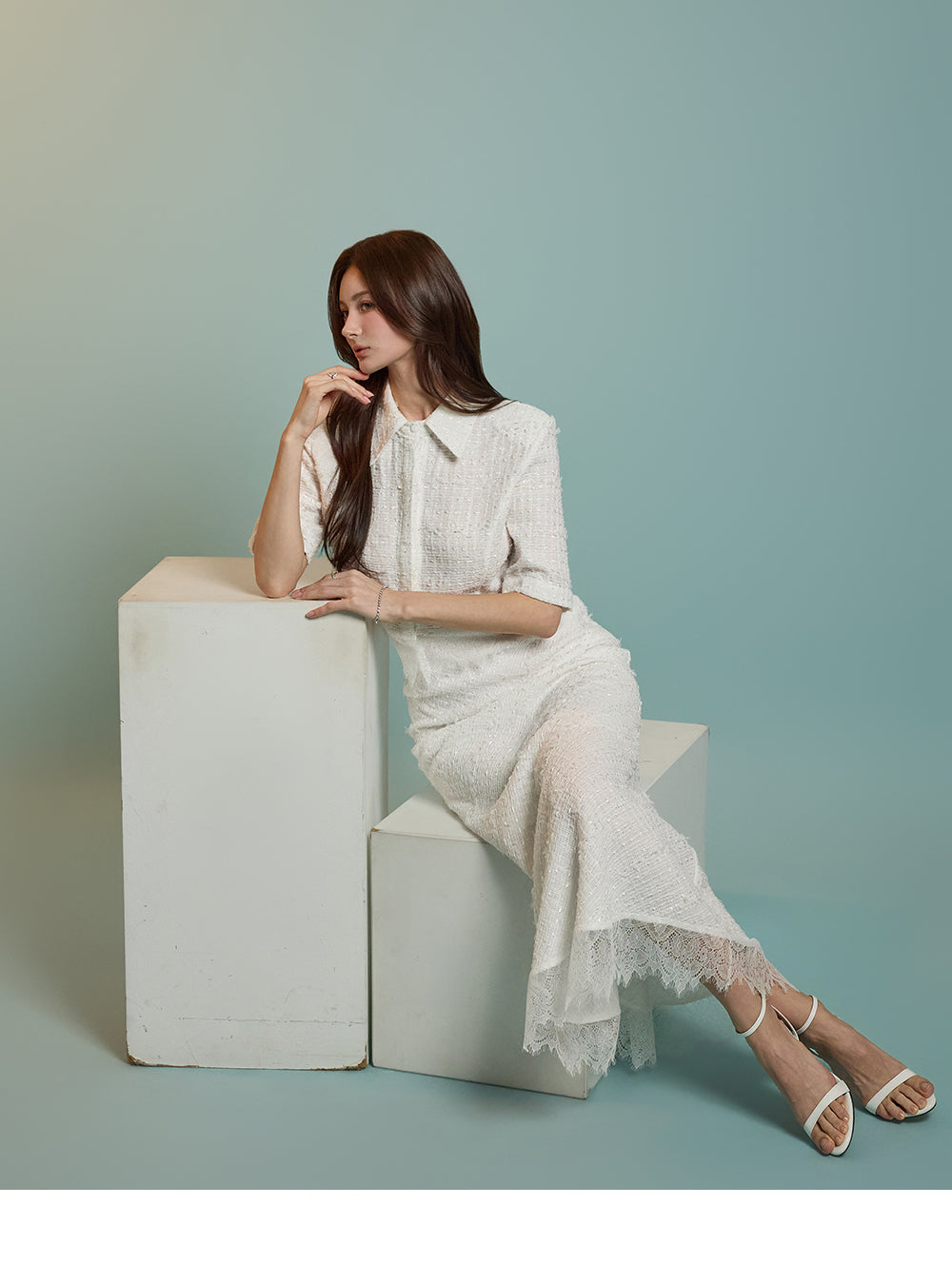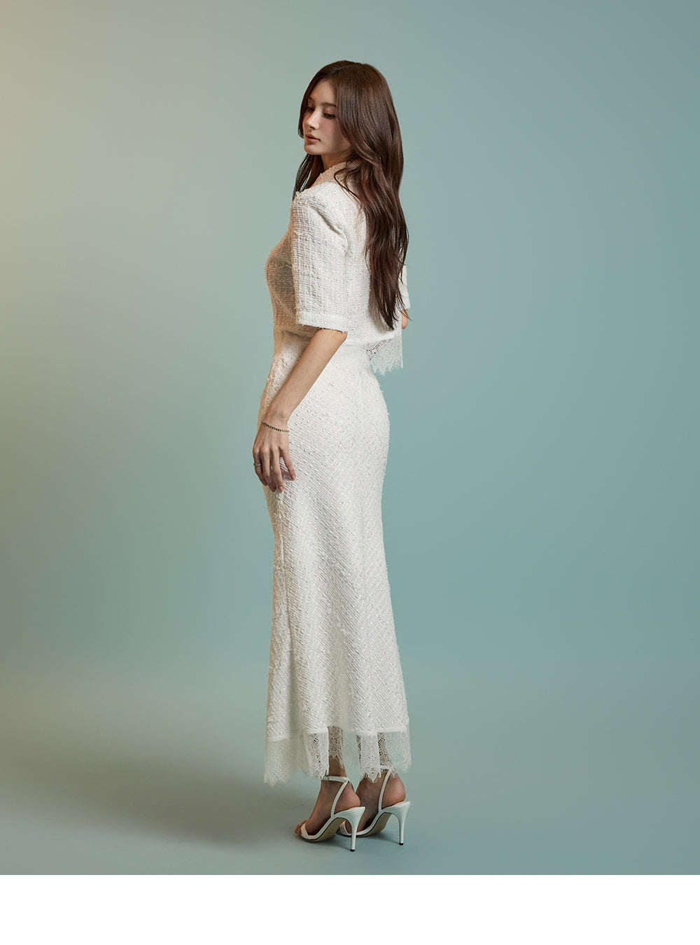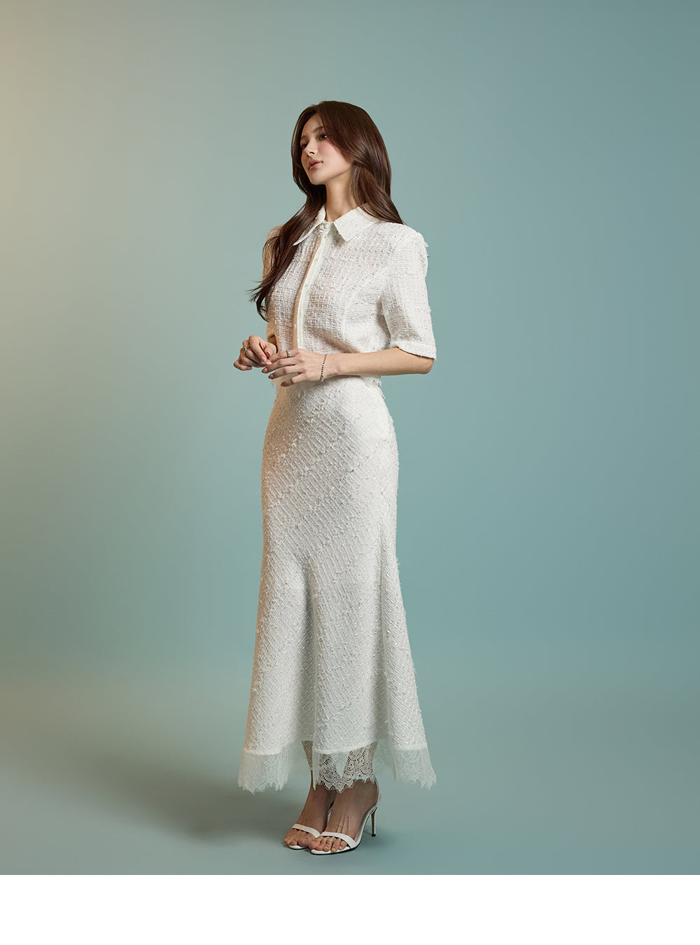The slim waistline flows into a flared silhouette, naturally creating a feminine look.