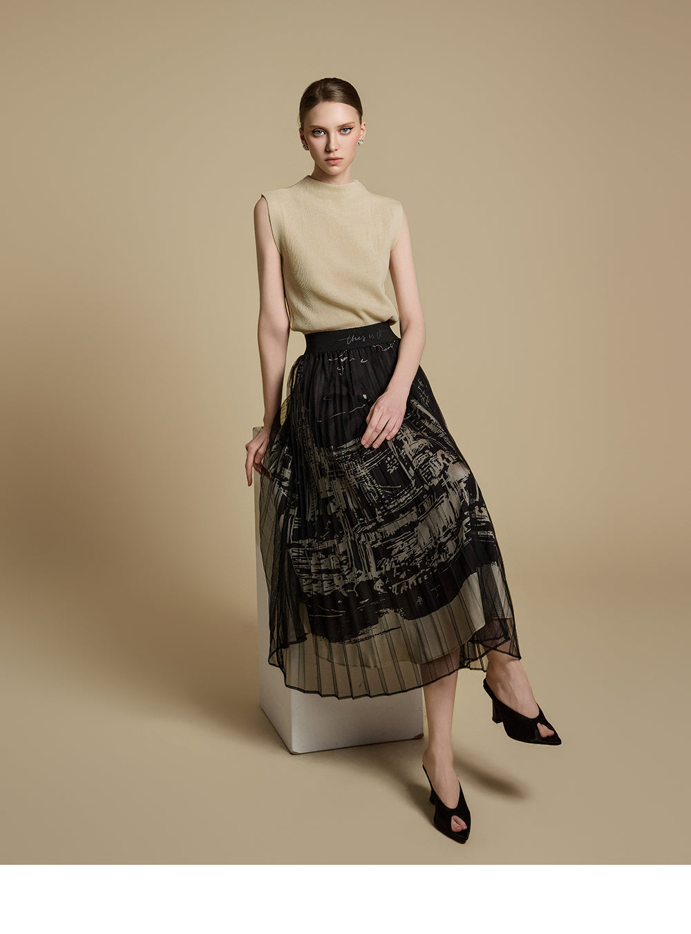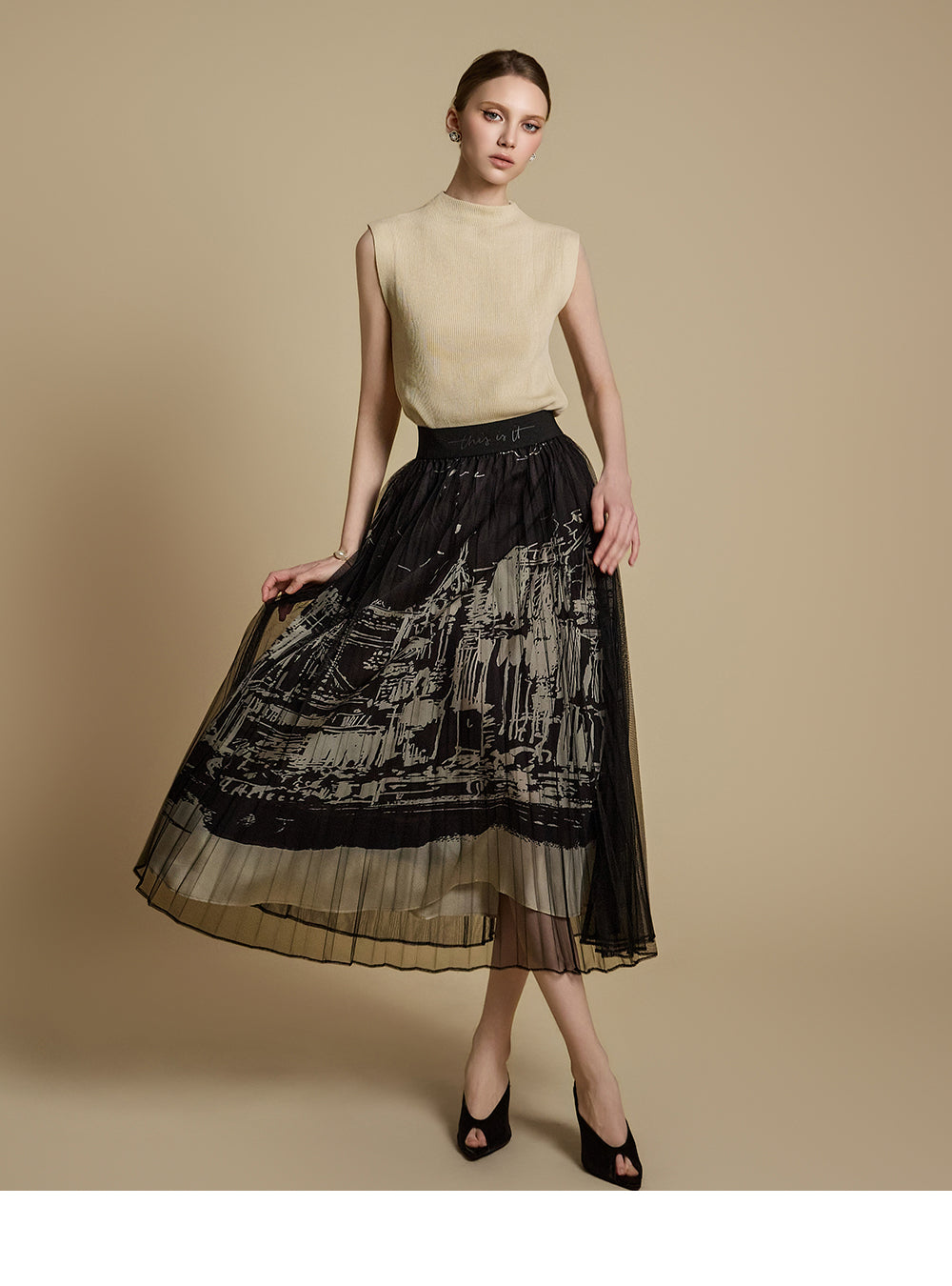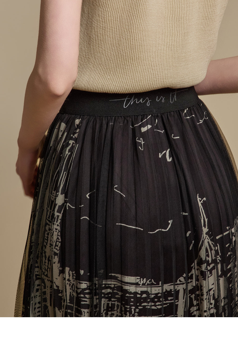 This printed pleated skirt offers a refined and stylish look.