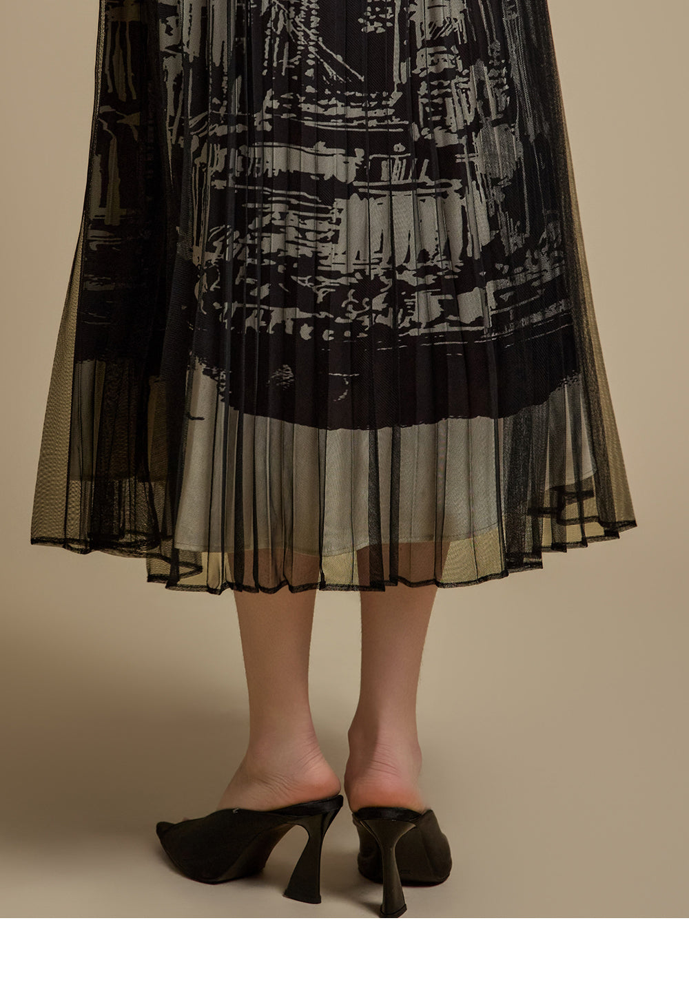 The full pleated silhouette is layered with sheer fabric,