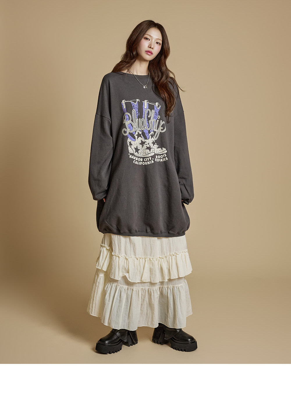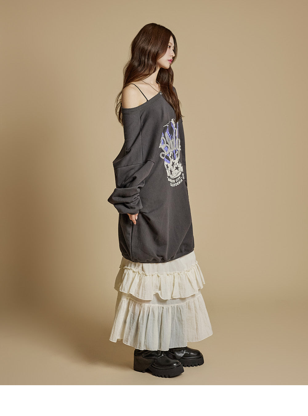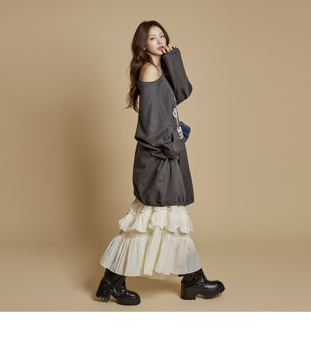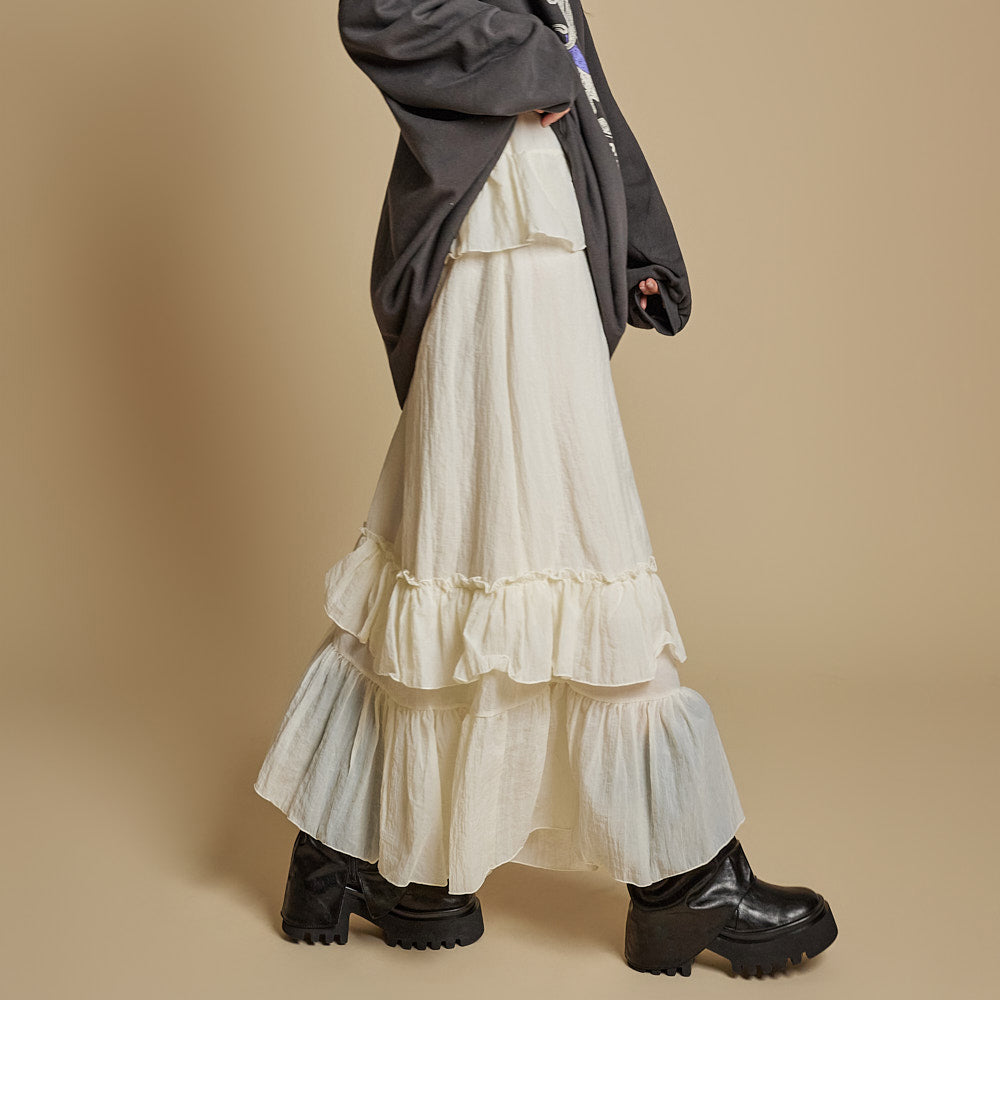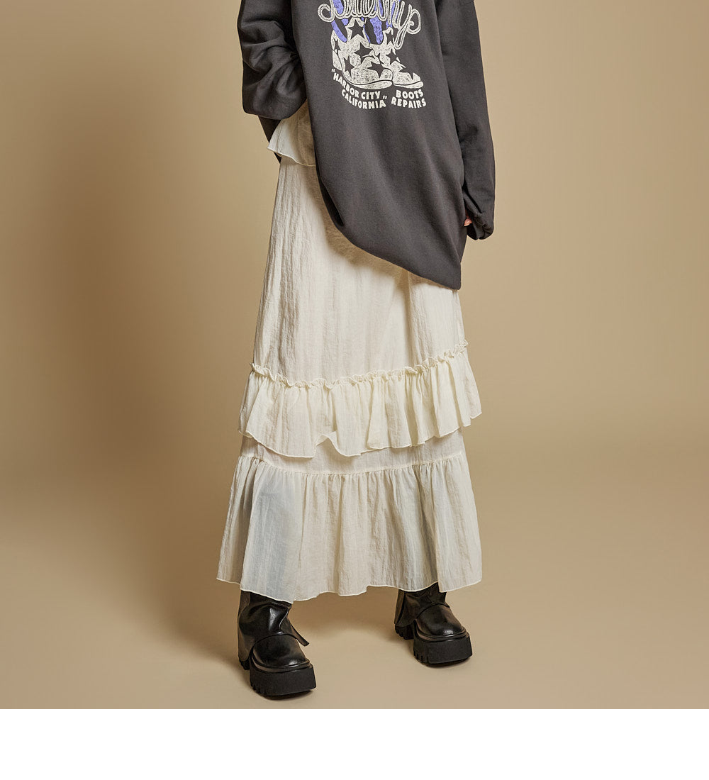 This is a casual-style tiered ruffle maxi skirt.