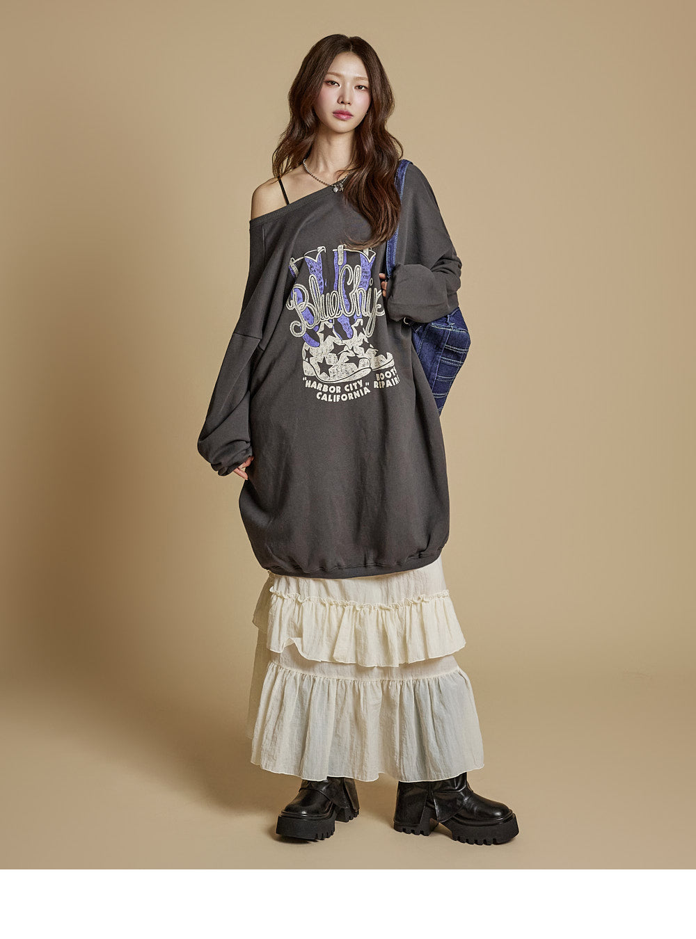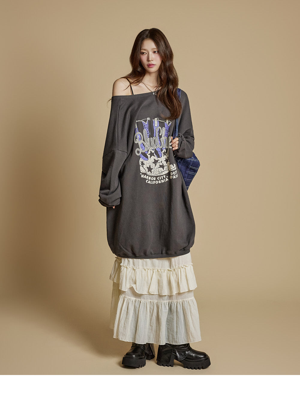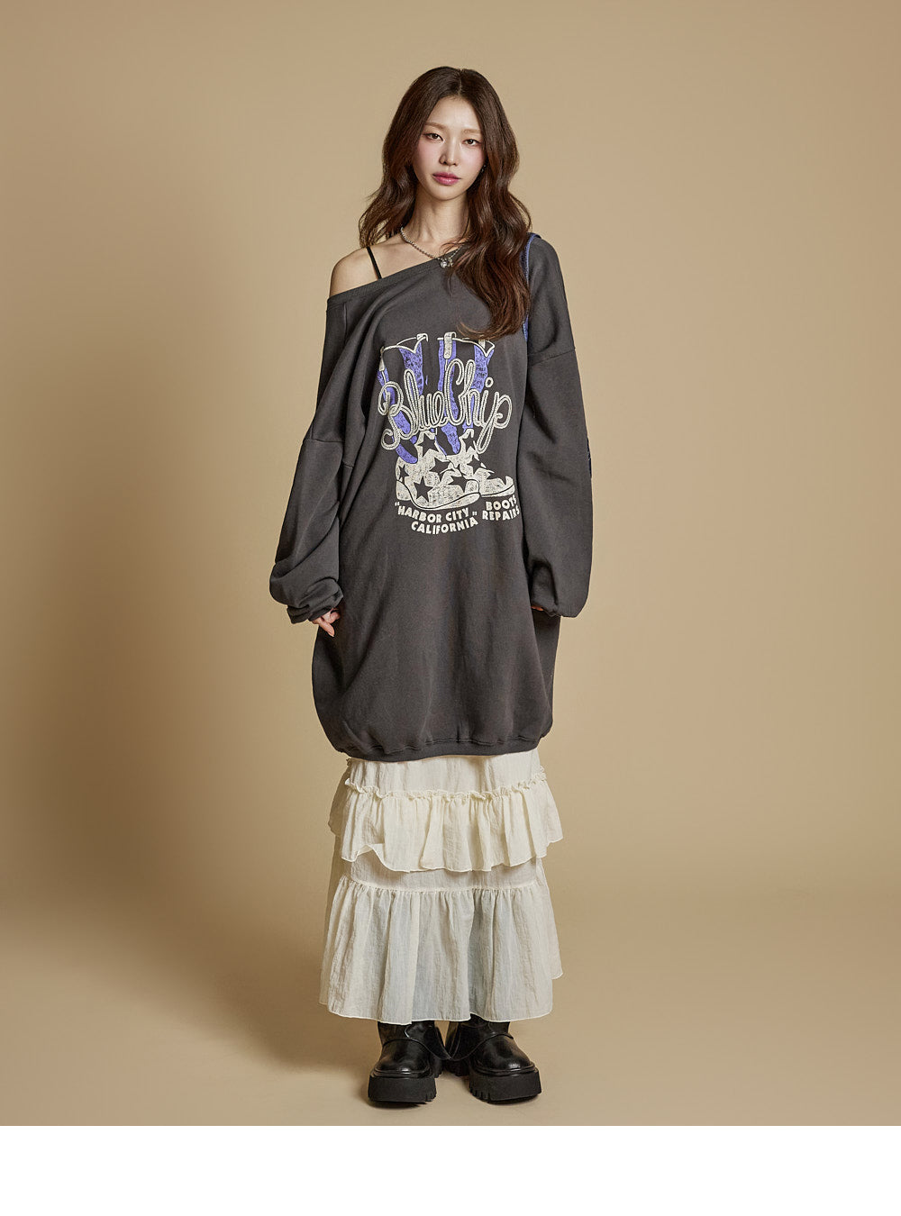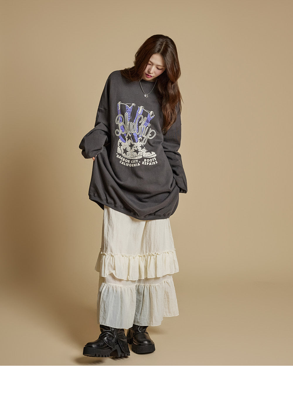 This is a casual-style tiered ruffle maxi skirt.