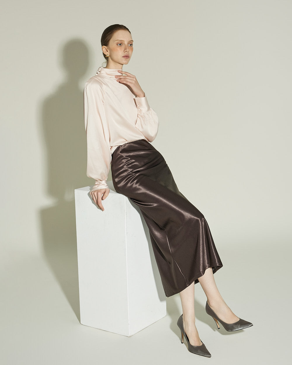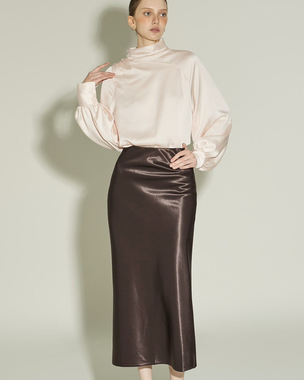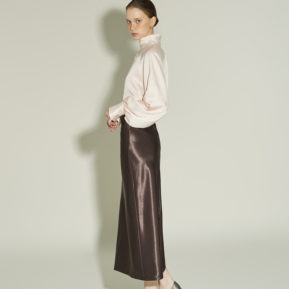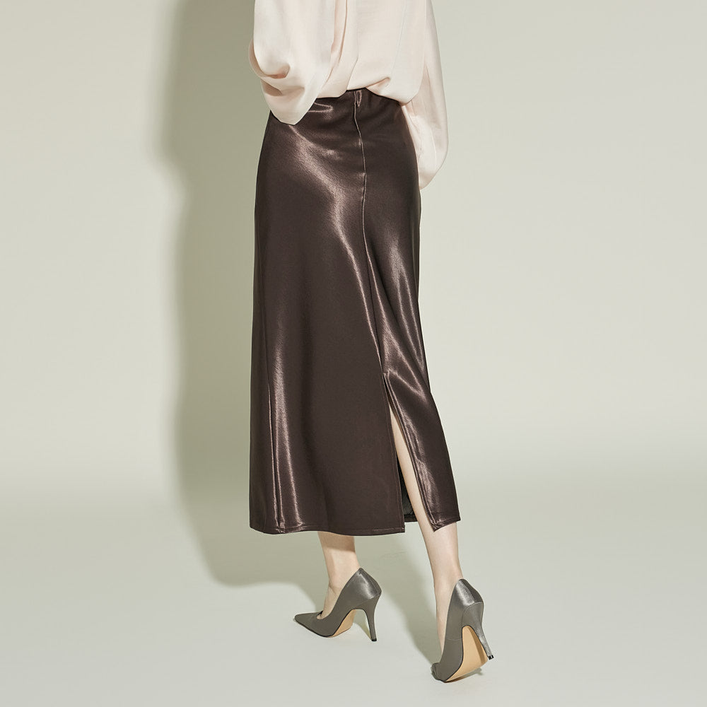 This glossy skirt exudes a feminine vibe.