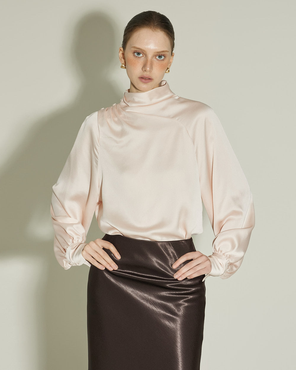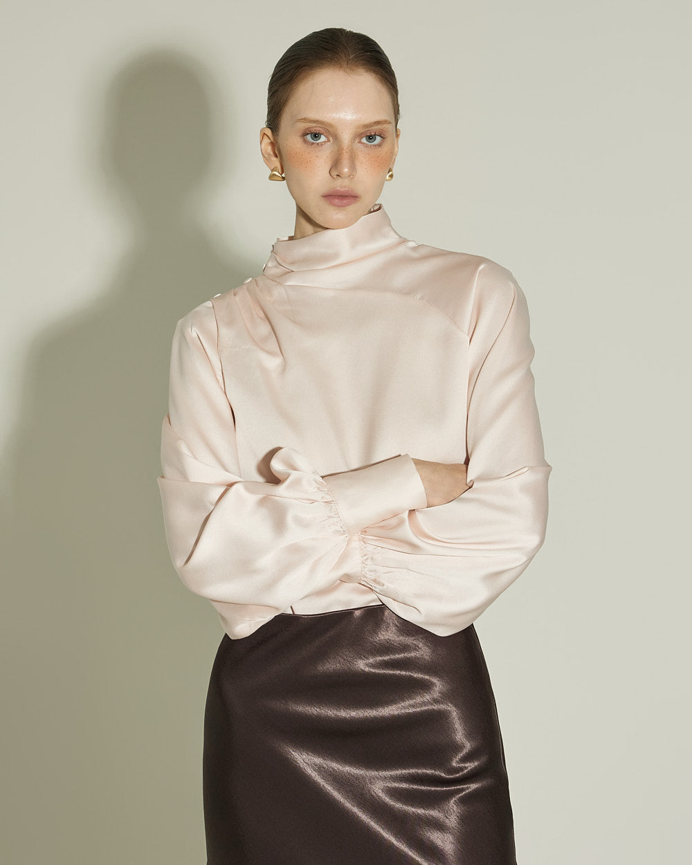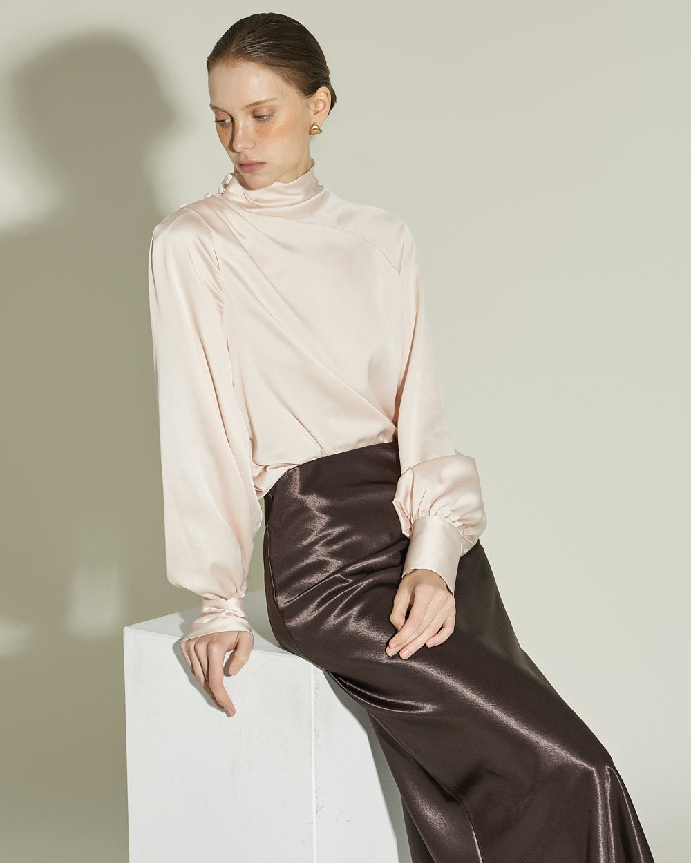 This glossy skirt exudes a feminine vibe.