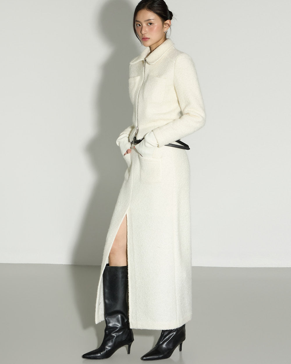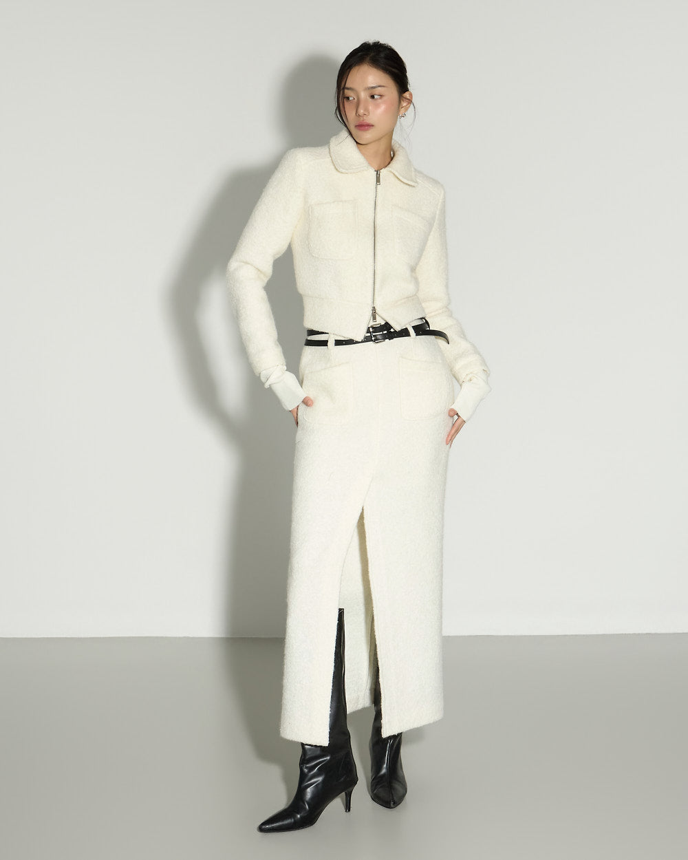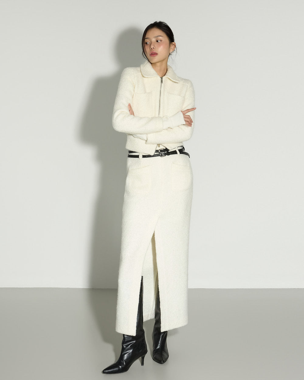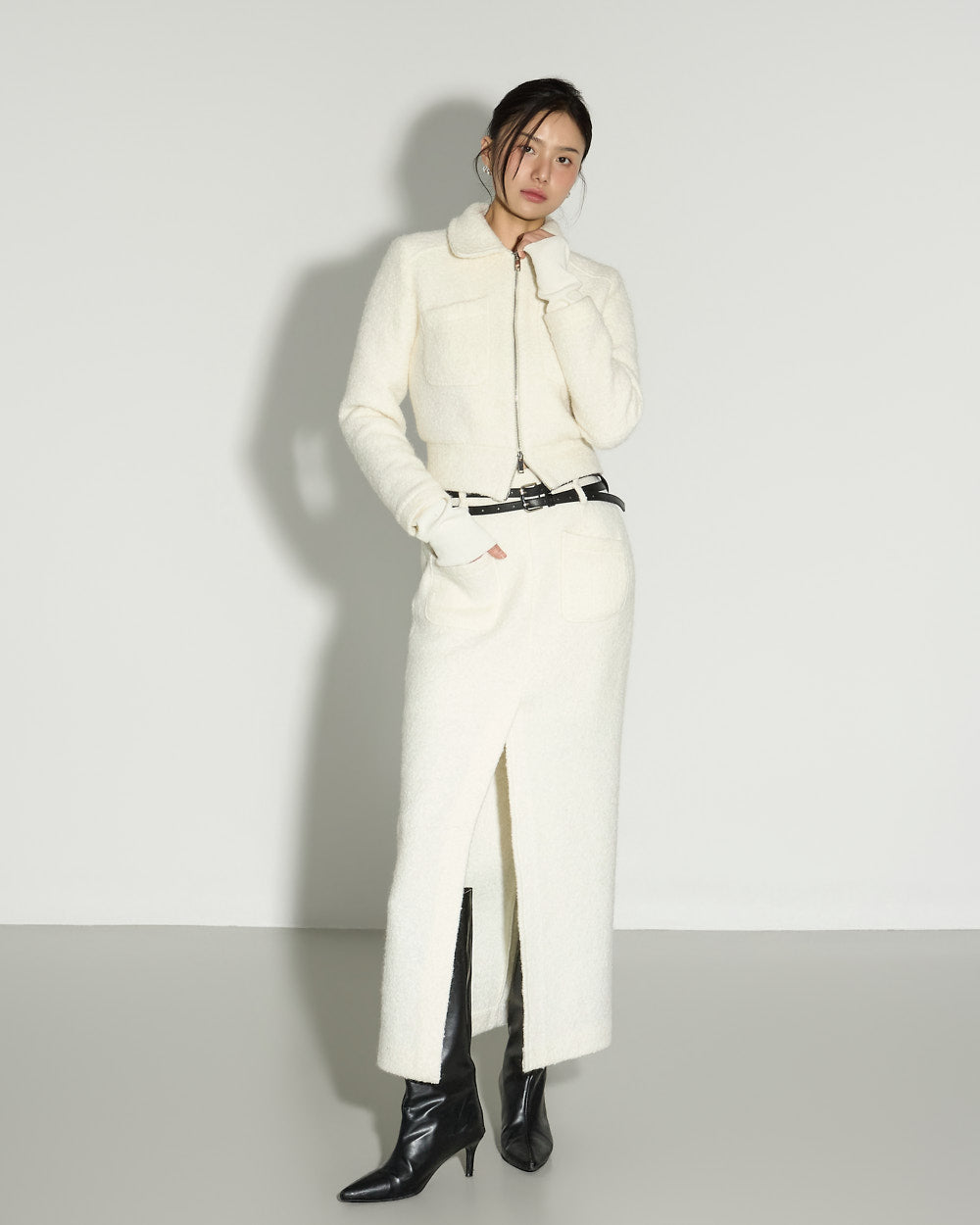 A minimalist terry wool slit skirt with a clean, refined mood.
