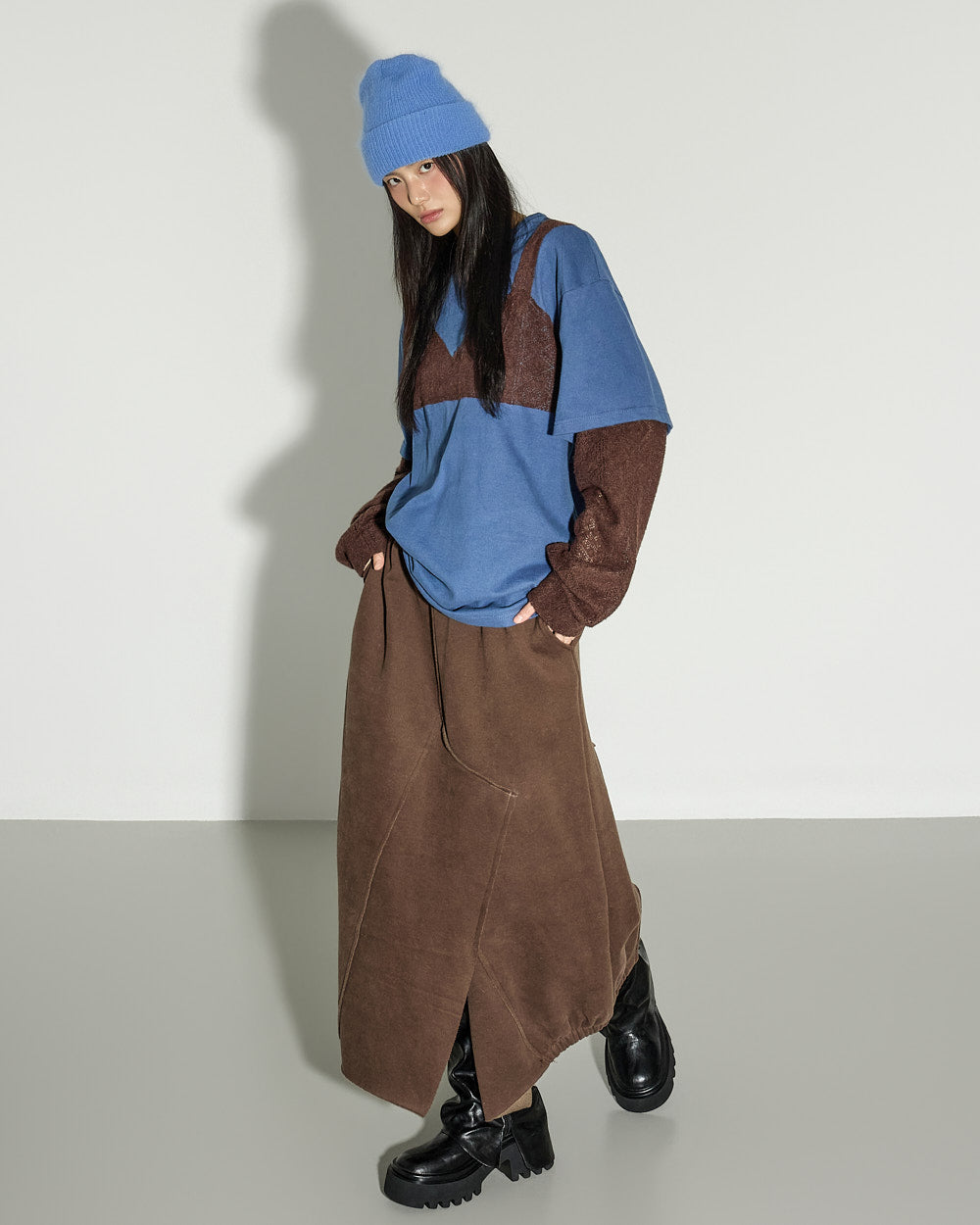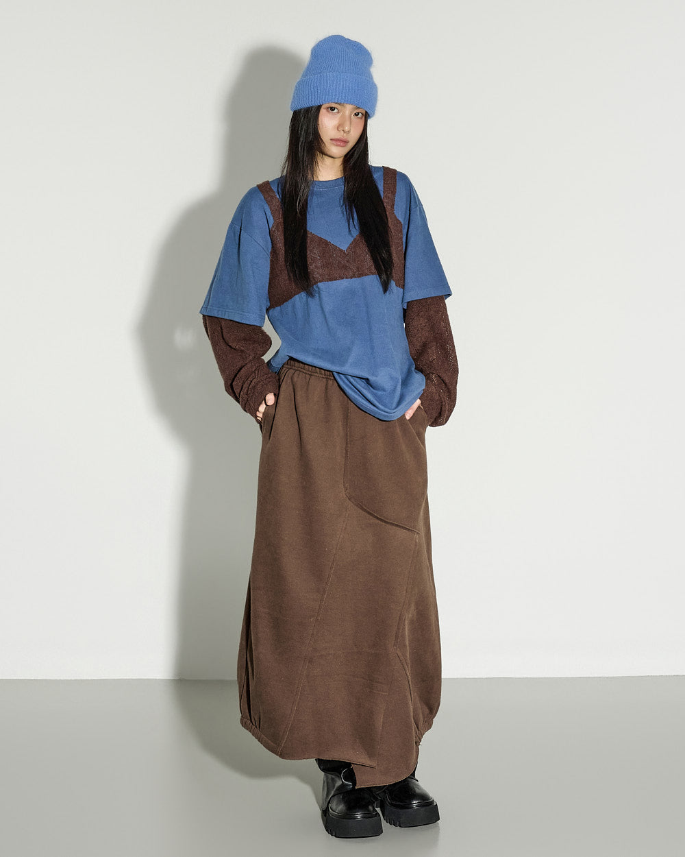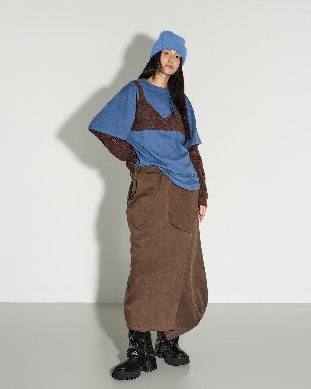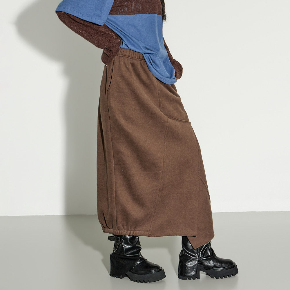 A casual asymmetric fleece-lined skirt with a relaxed mood.