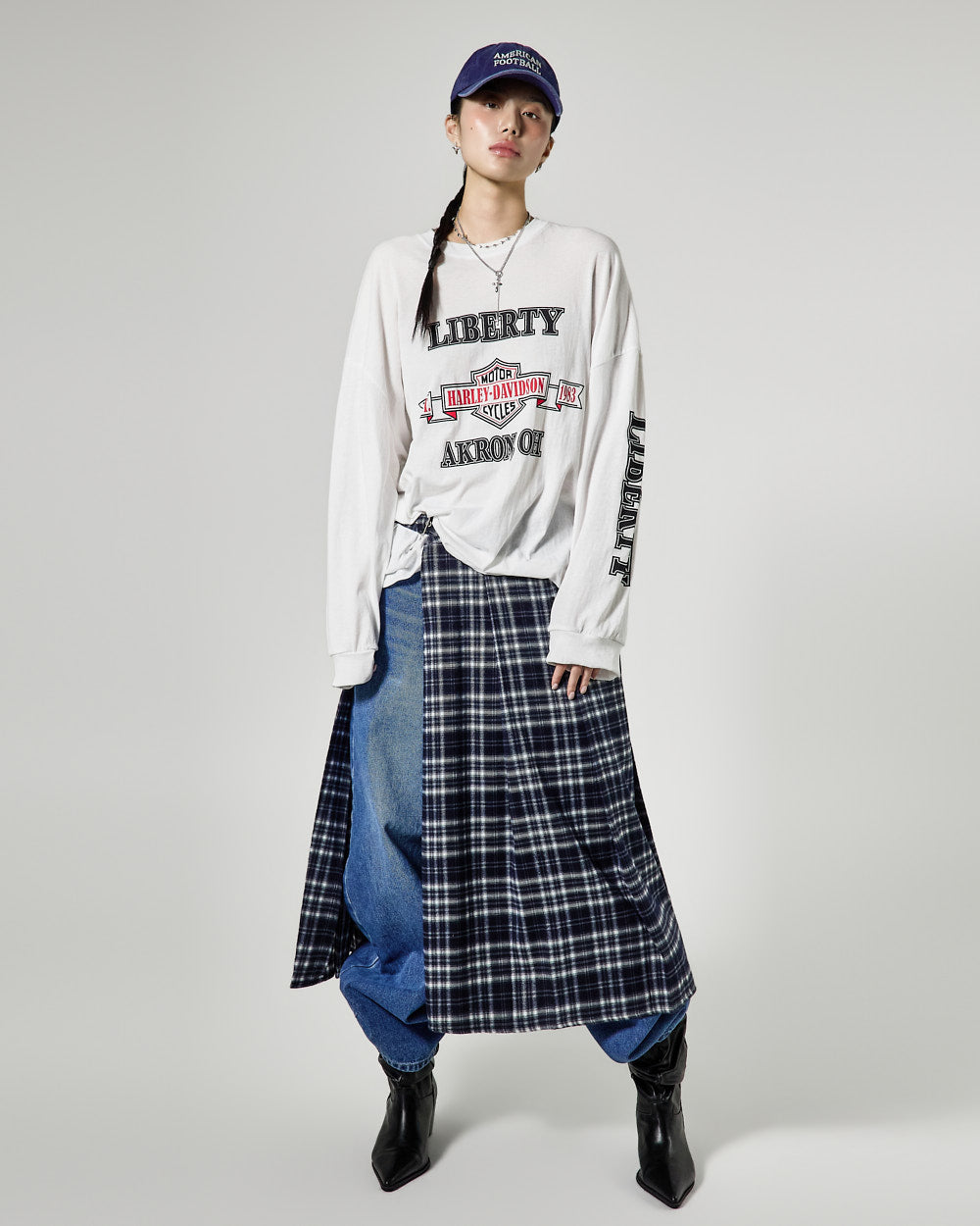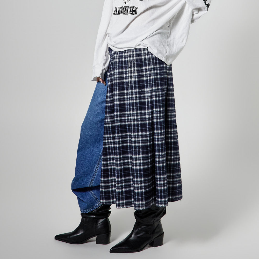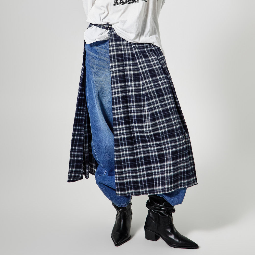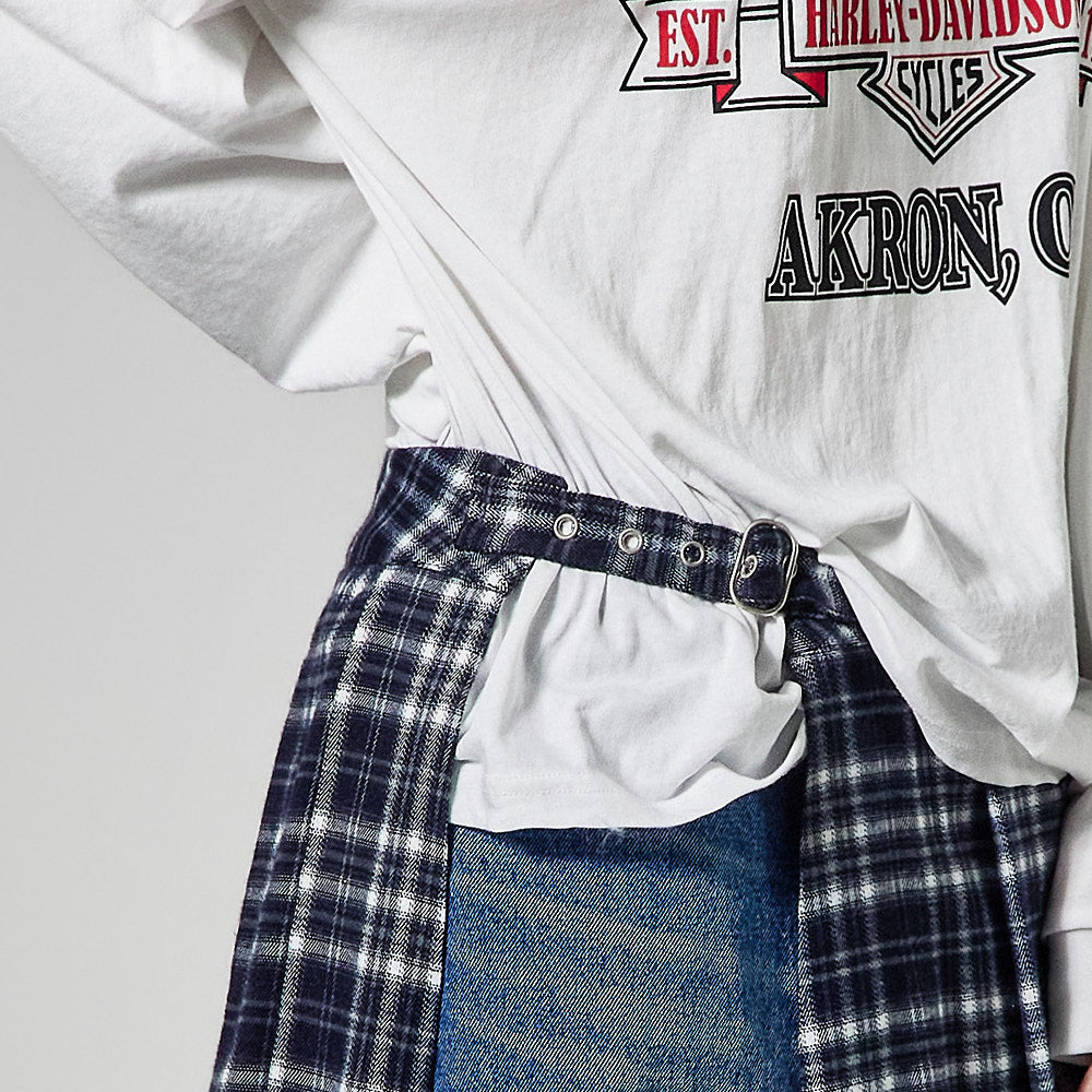 The check pattern and pleated details combine to create a classic yet unique silhouette.