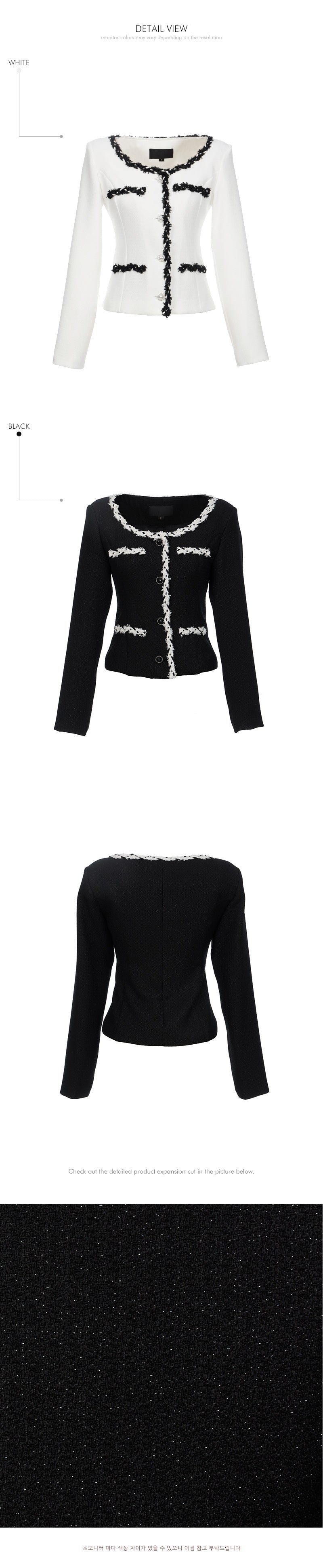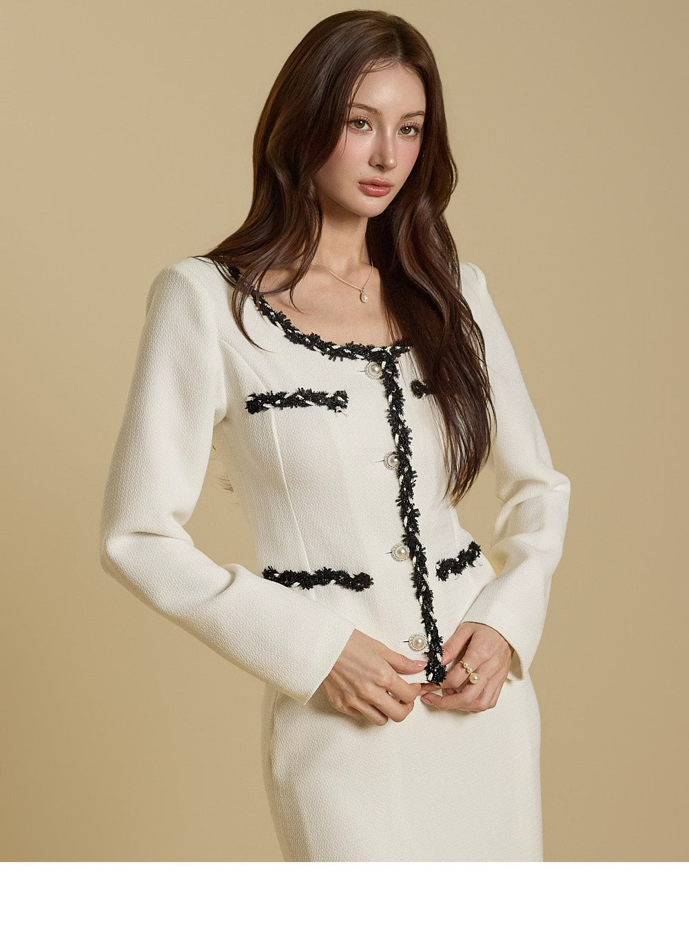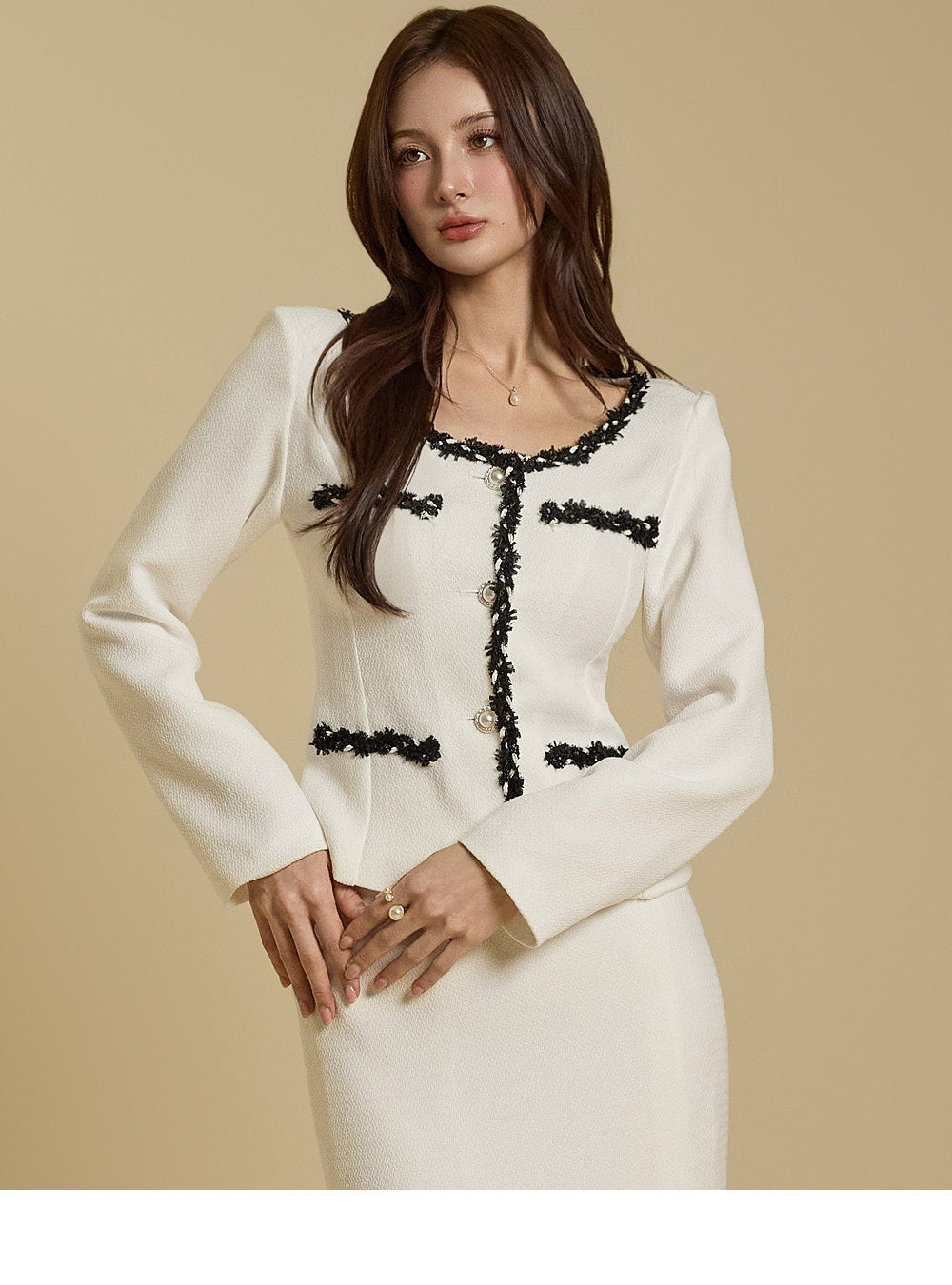 and tweed taping details throughout the jacket add an elegant touch.
