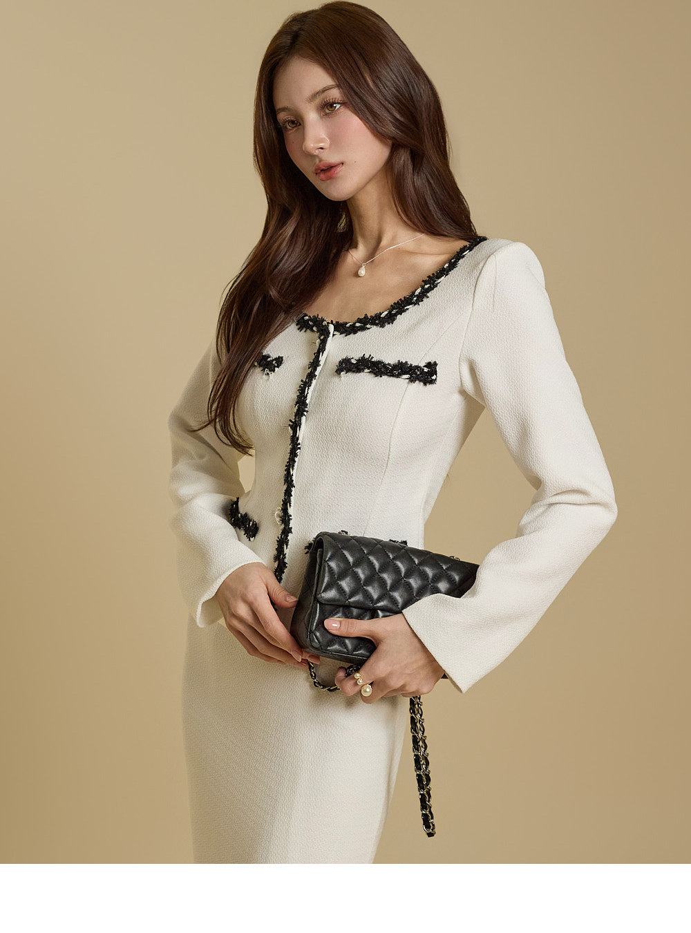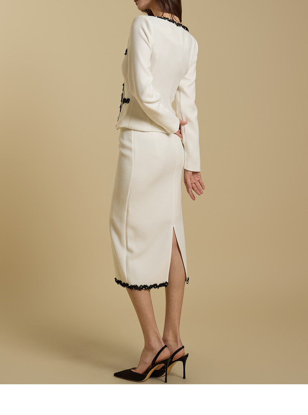 Matching tweed taping at the hem mirrors the jacket design,