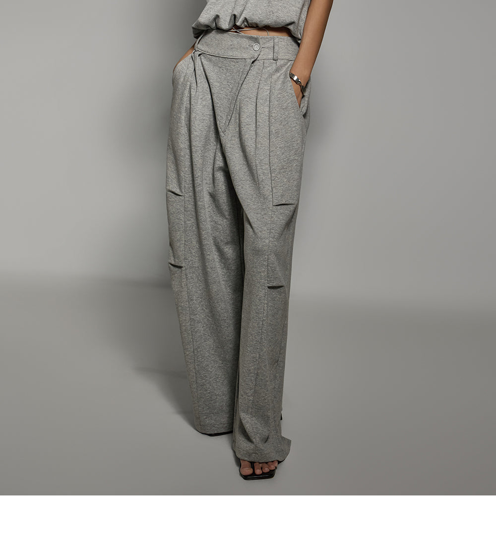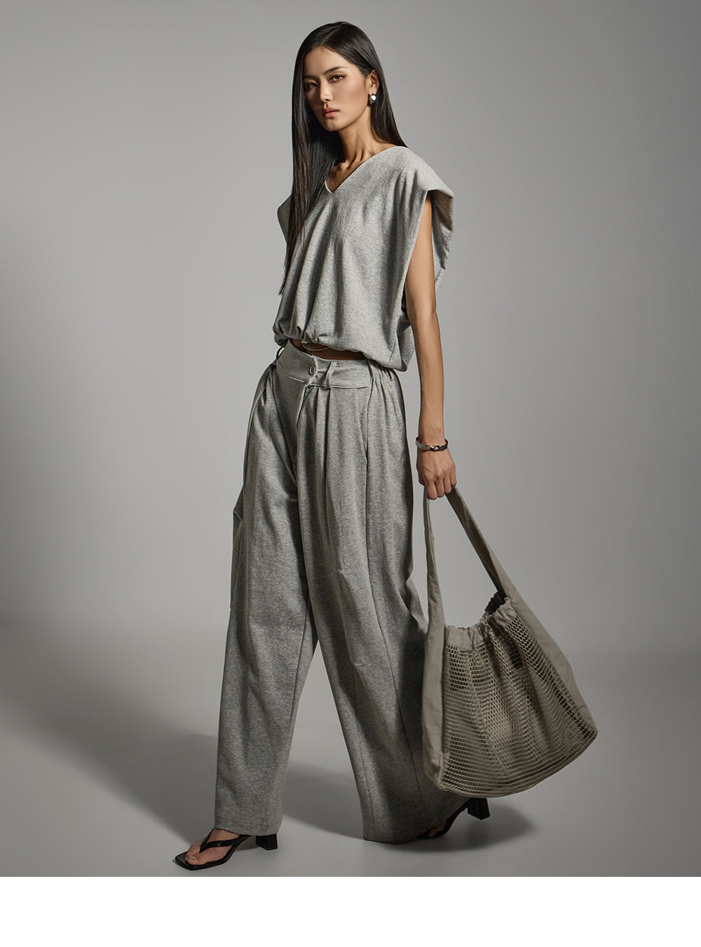 The pants have a wide-leg silhouette that naturally covers the body shape,