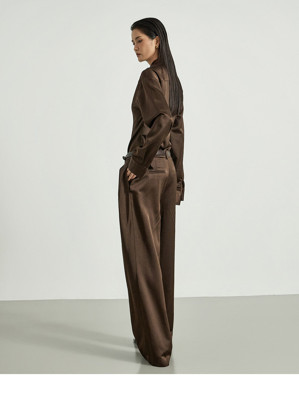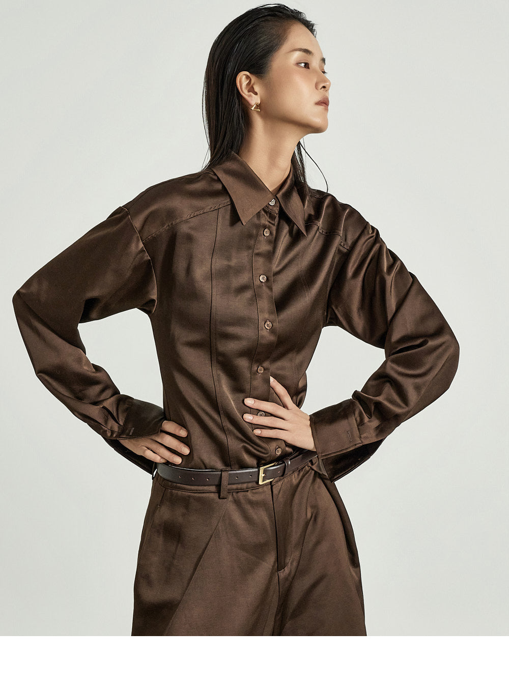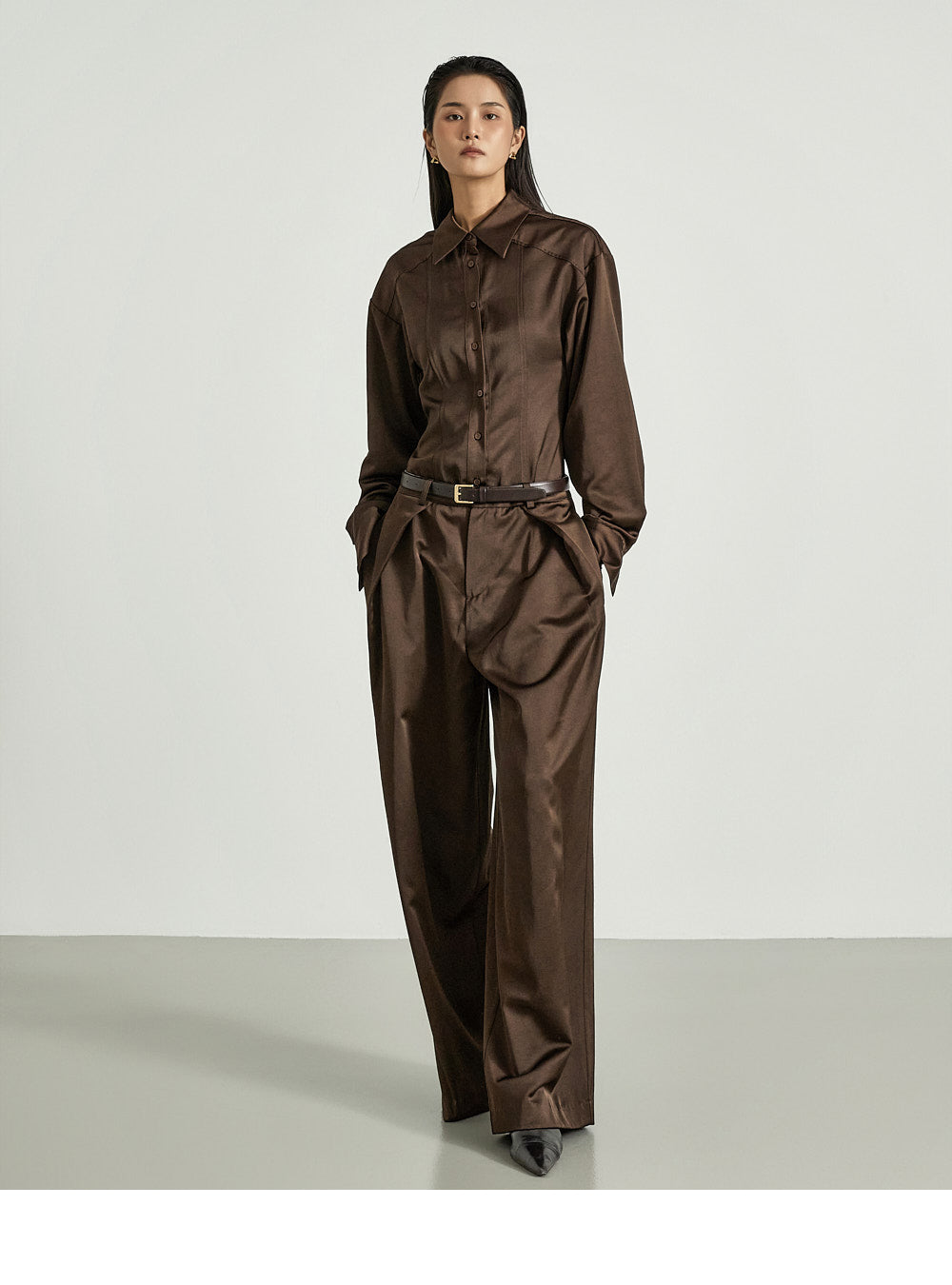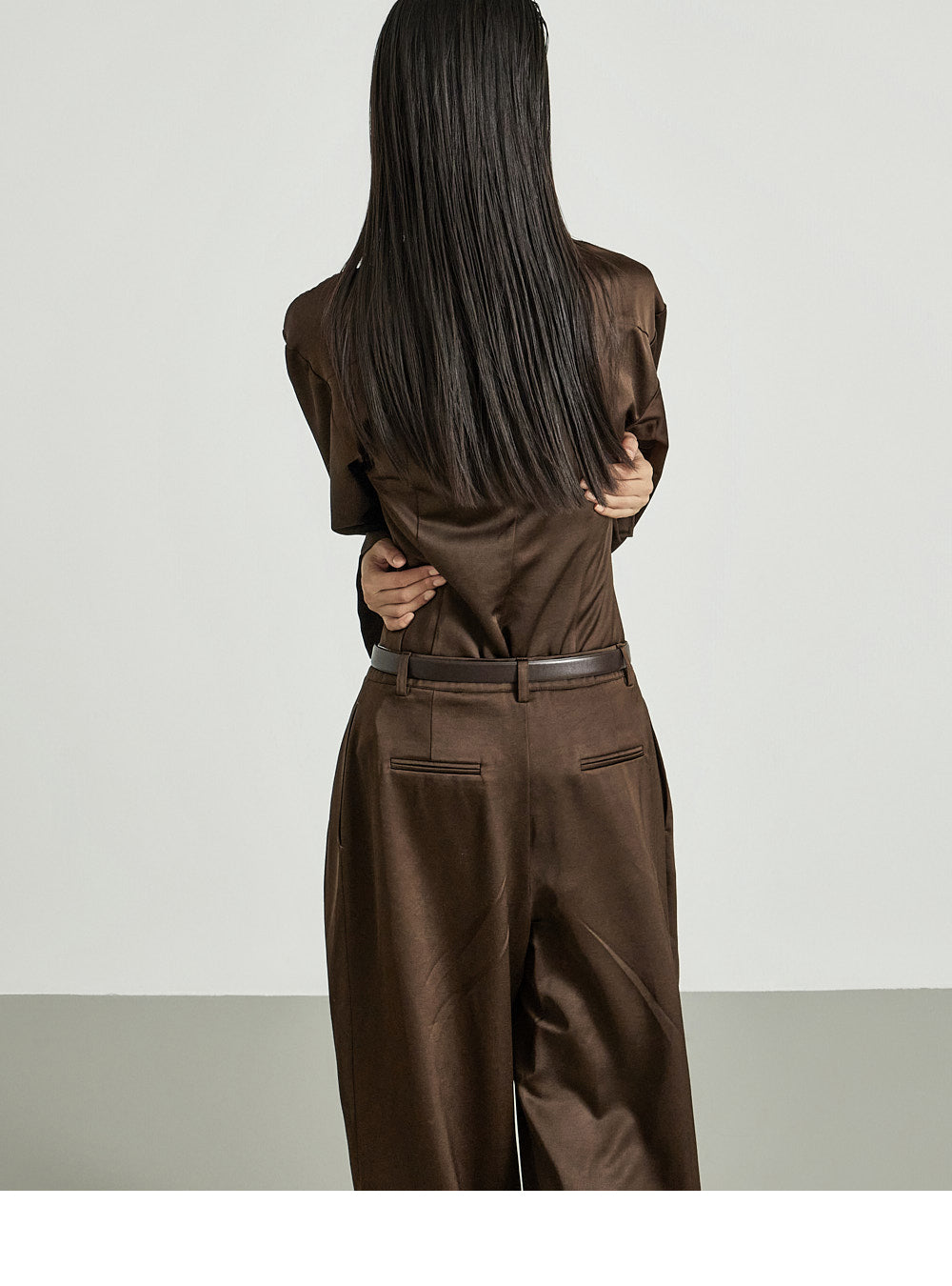 Model is 173cm and wearing a size ONE shirt and size S slacks. Dark Brown.