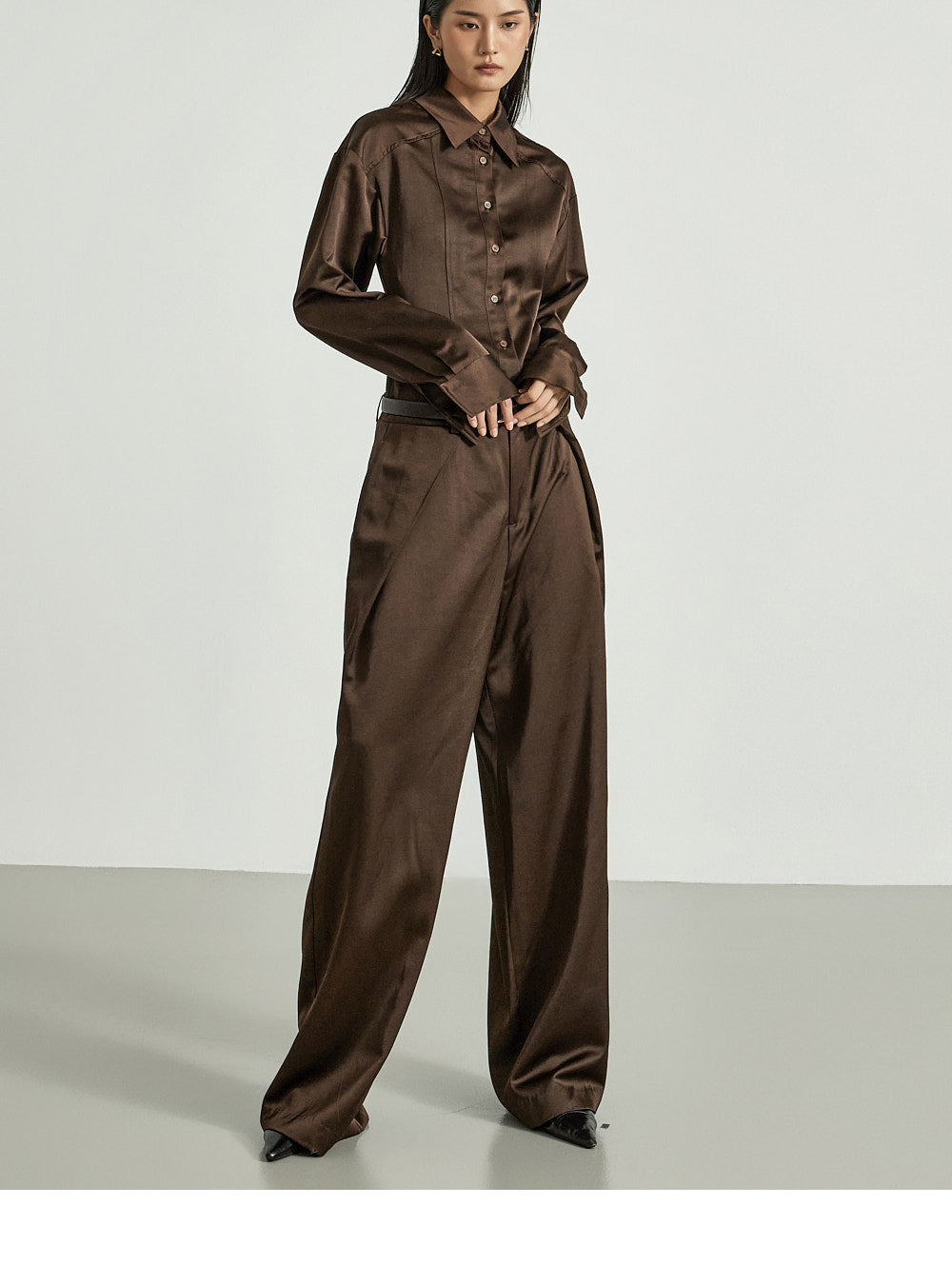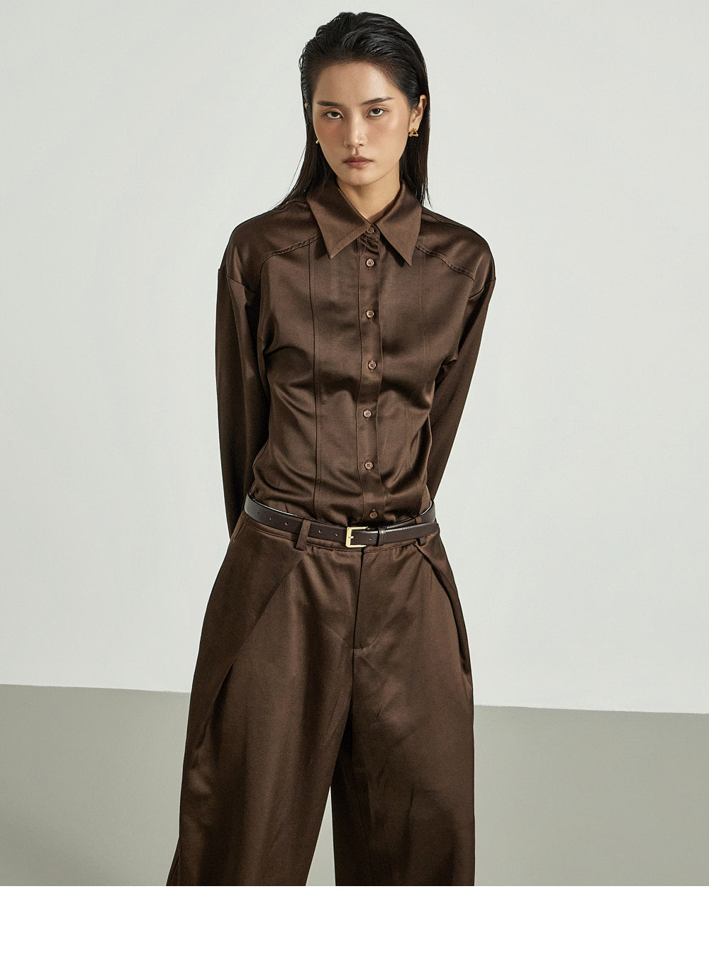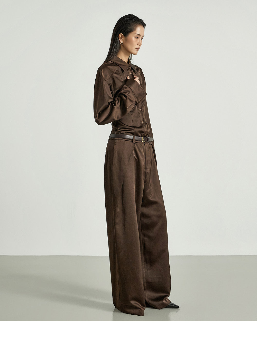 Model is 173cm and wearing a size ONE shirt and size S slacks. Dark Brown.
