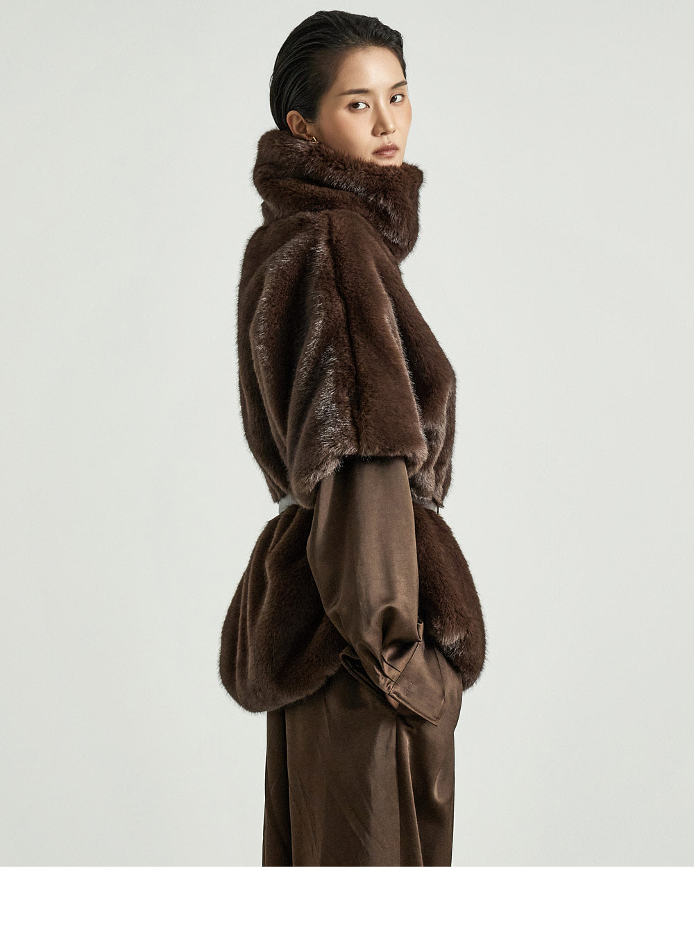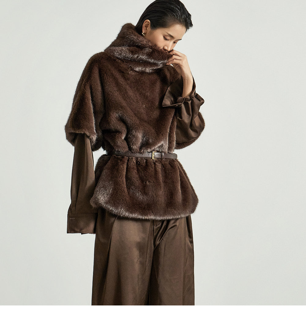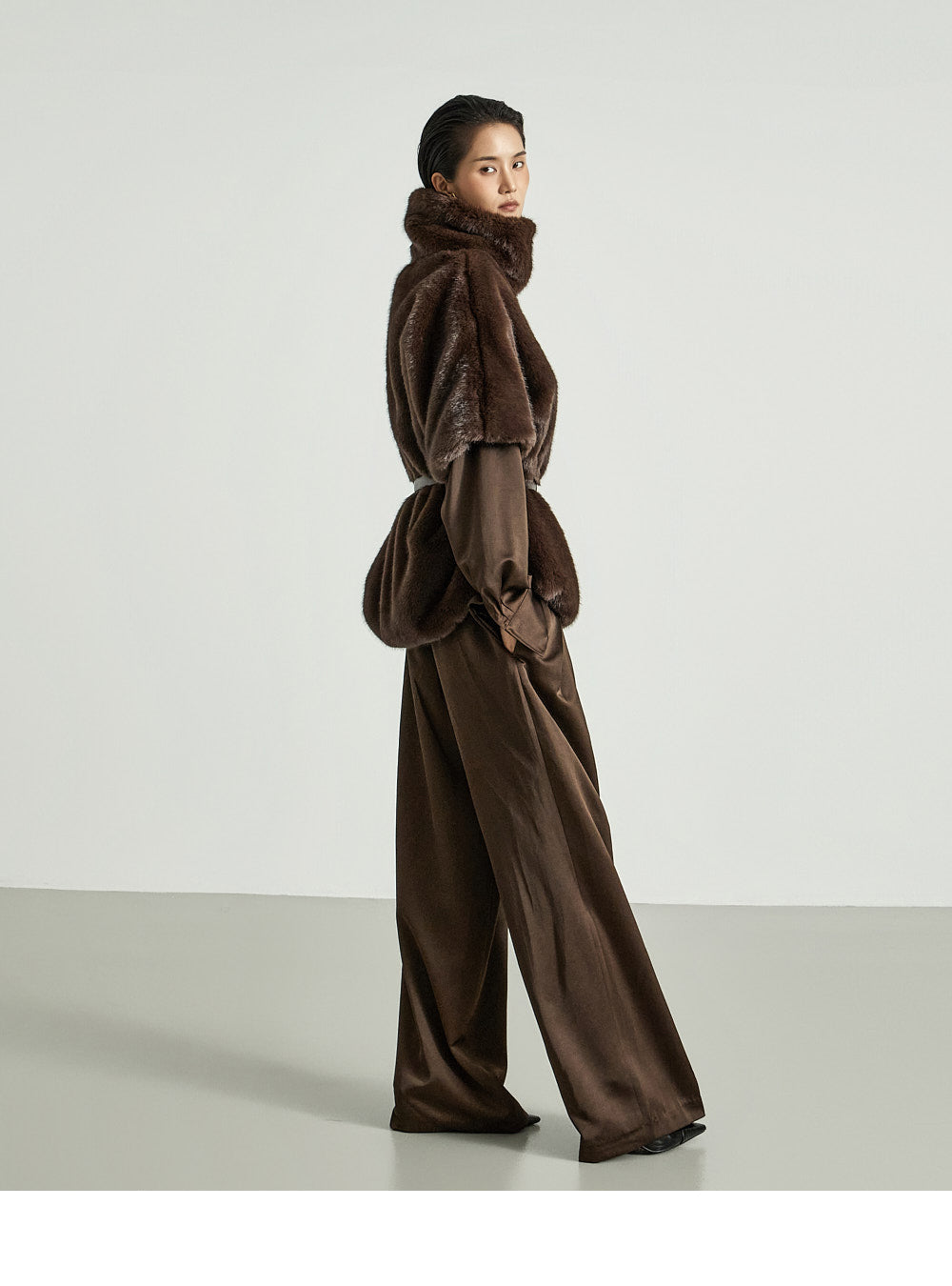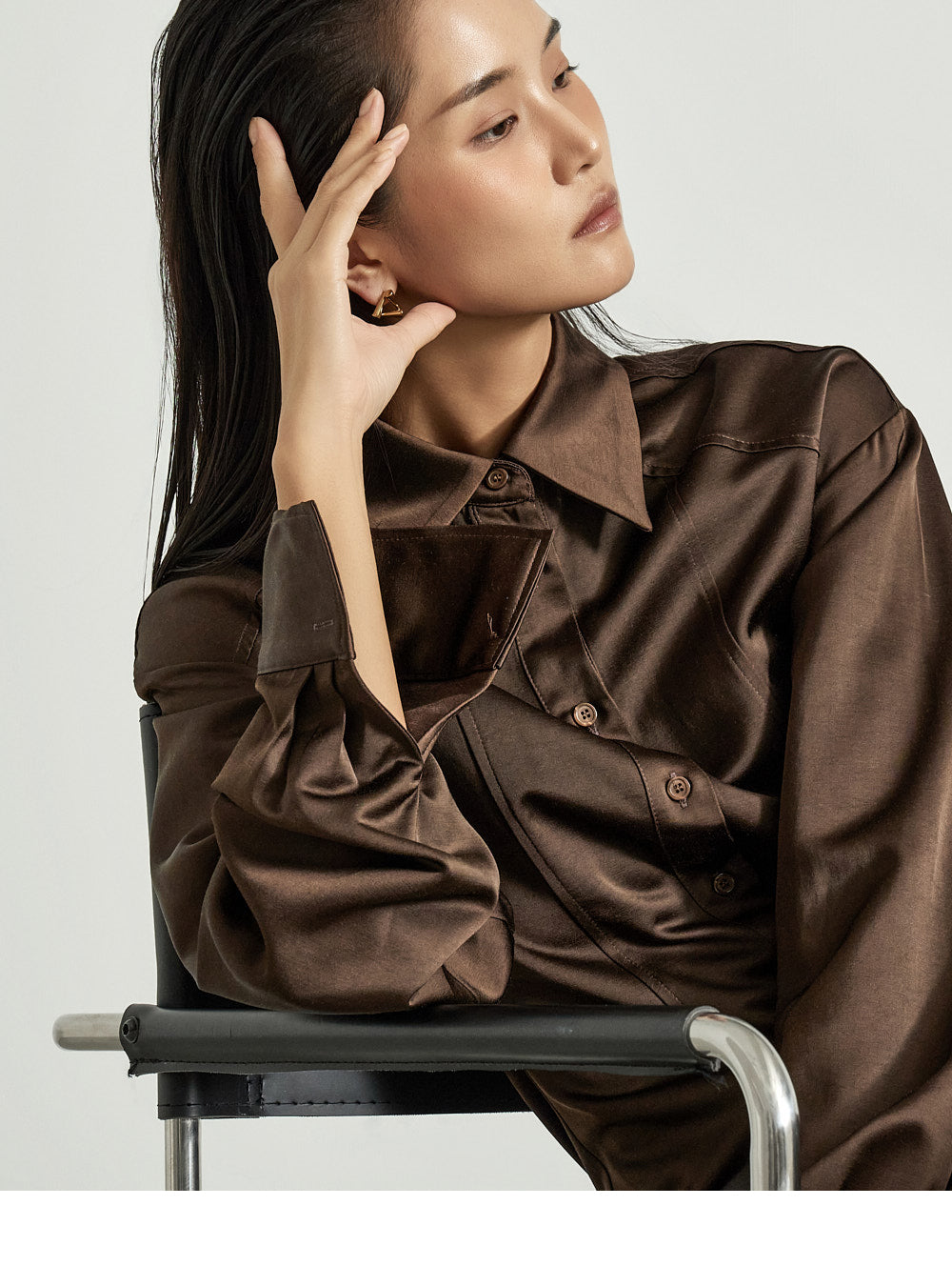 Model is 173cm and wearing a size ONE shirt and size S slacks. Dark Brown.