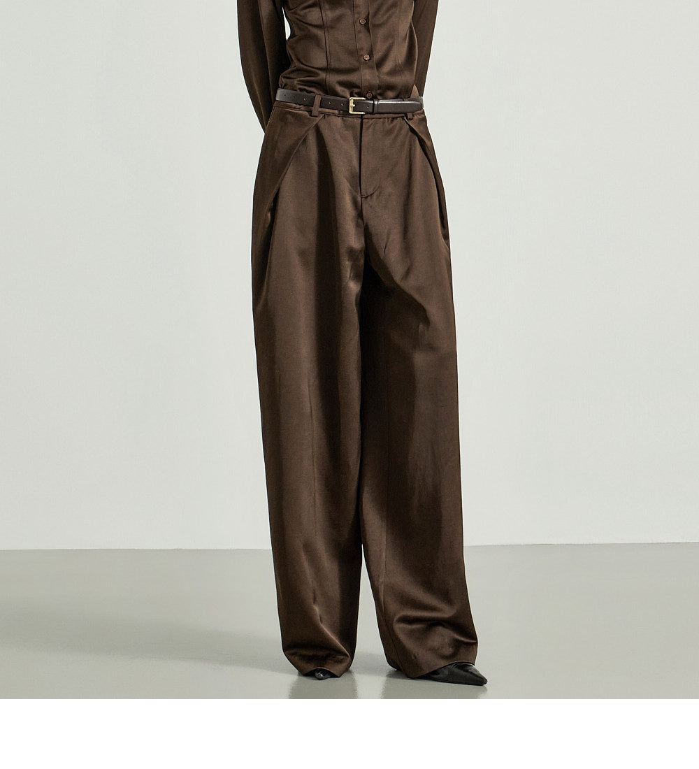 The slacks feature a wide fit and pin-tuck detailing at the hips, creating a unique silhouette.