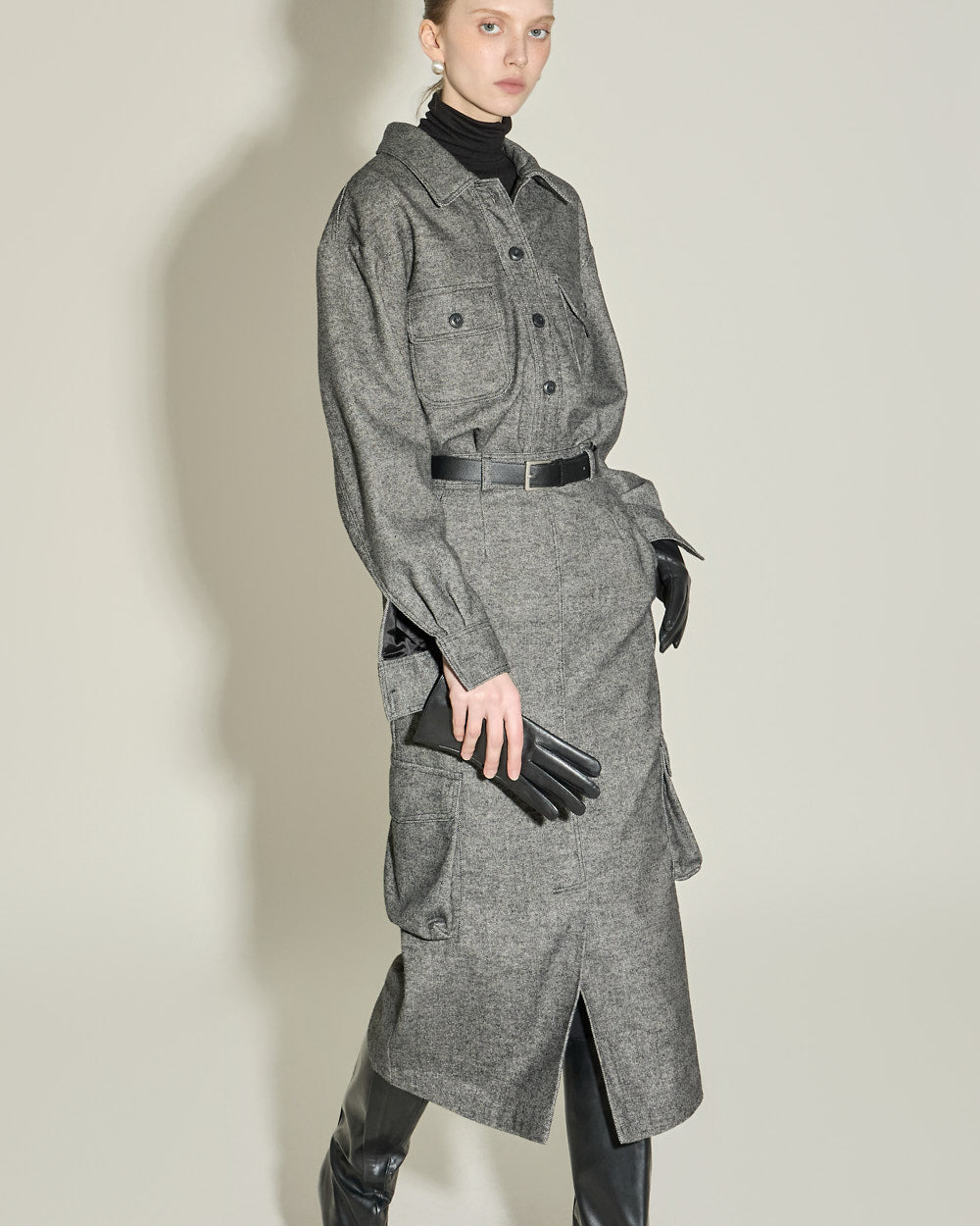 The shirt features a modern, minimal design in a wool blend,