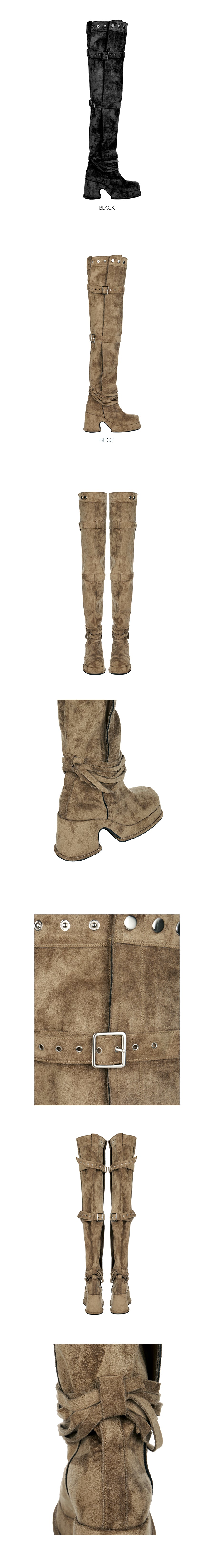 These thigh-high boots have a unique style.