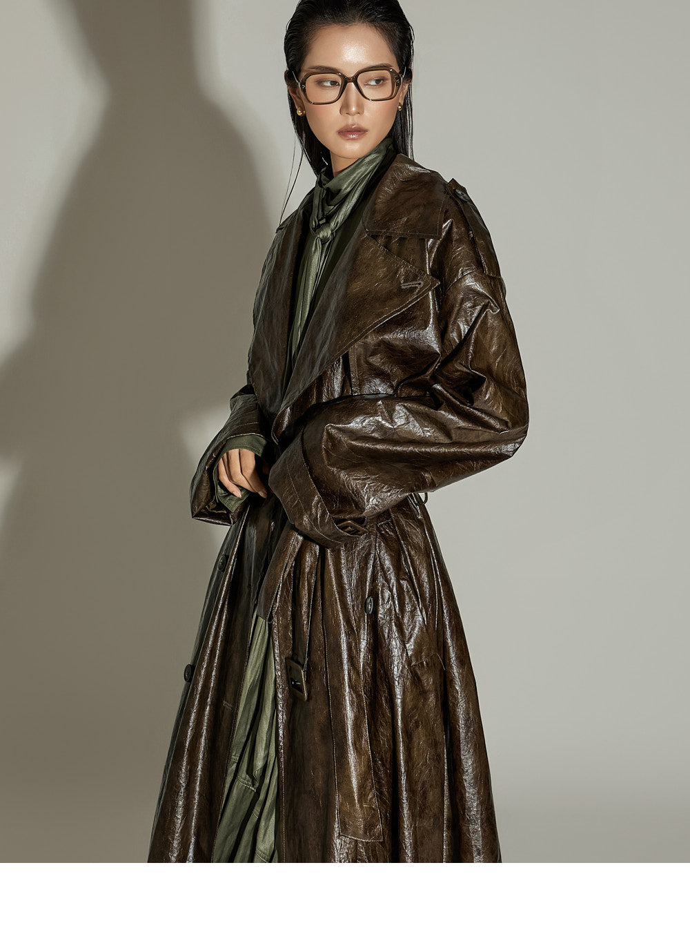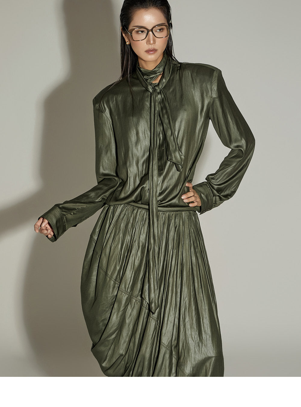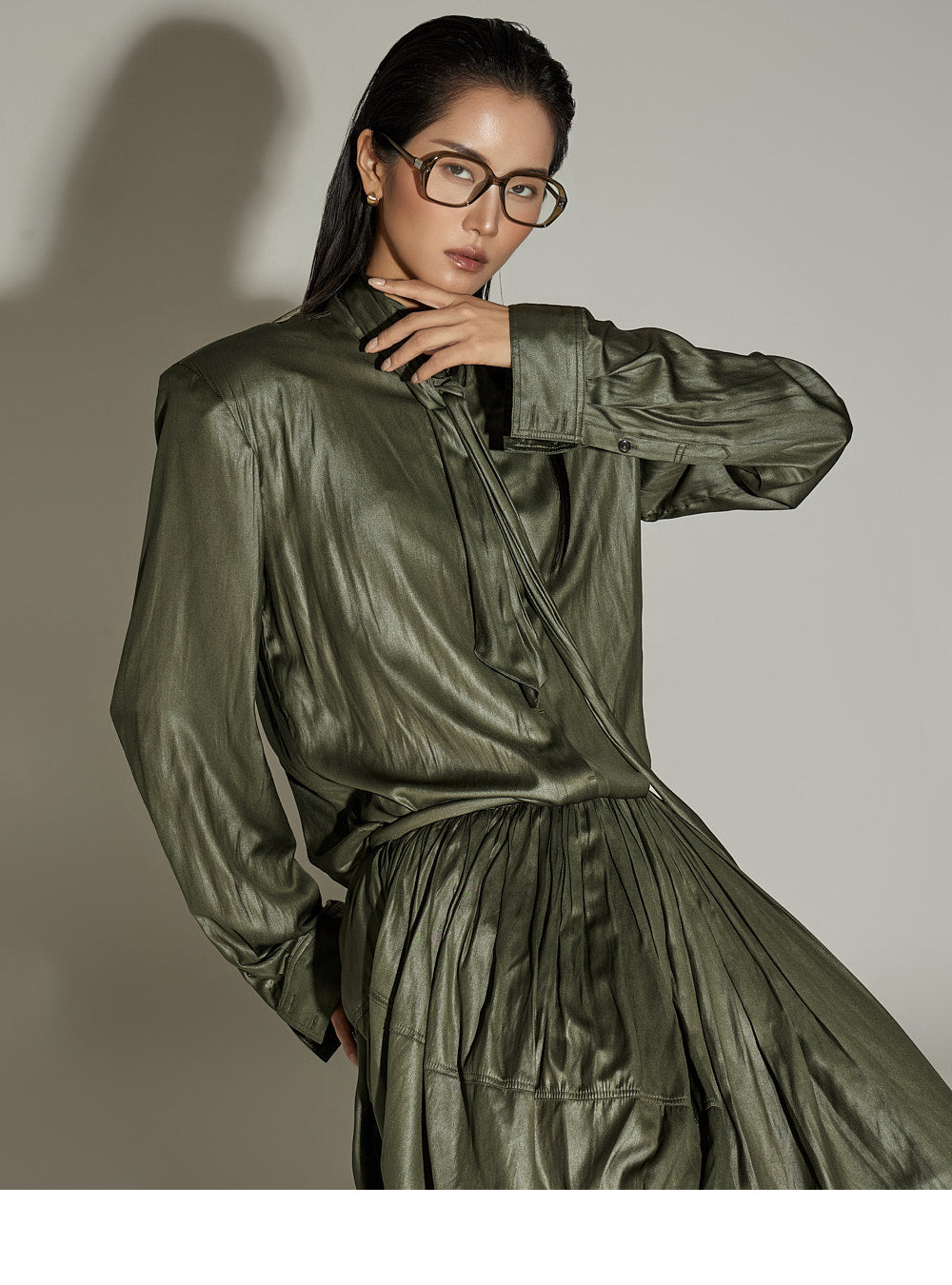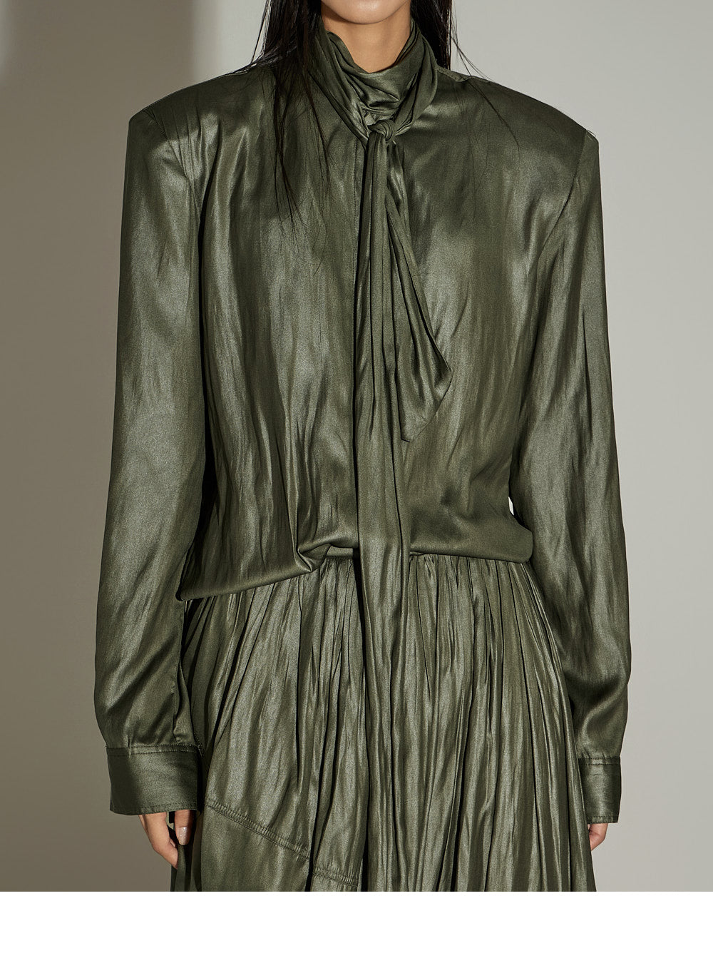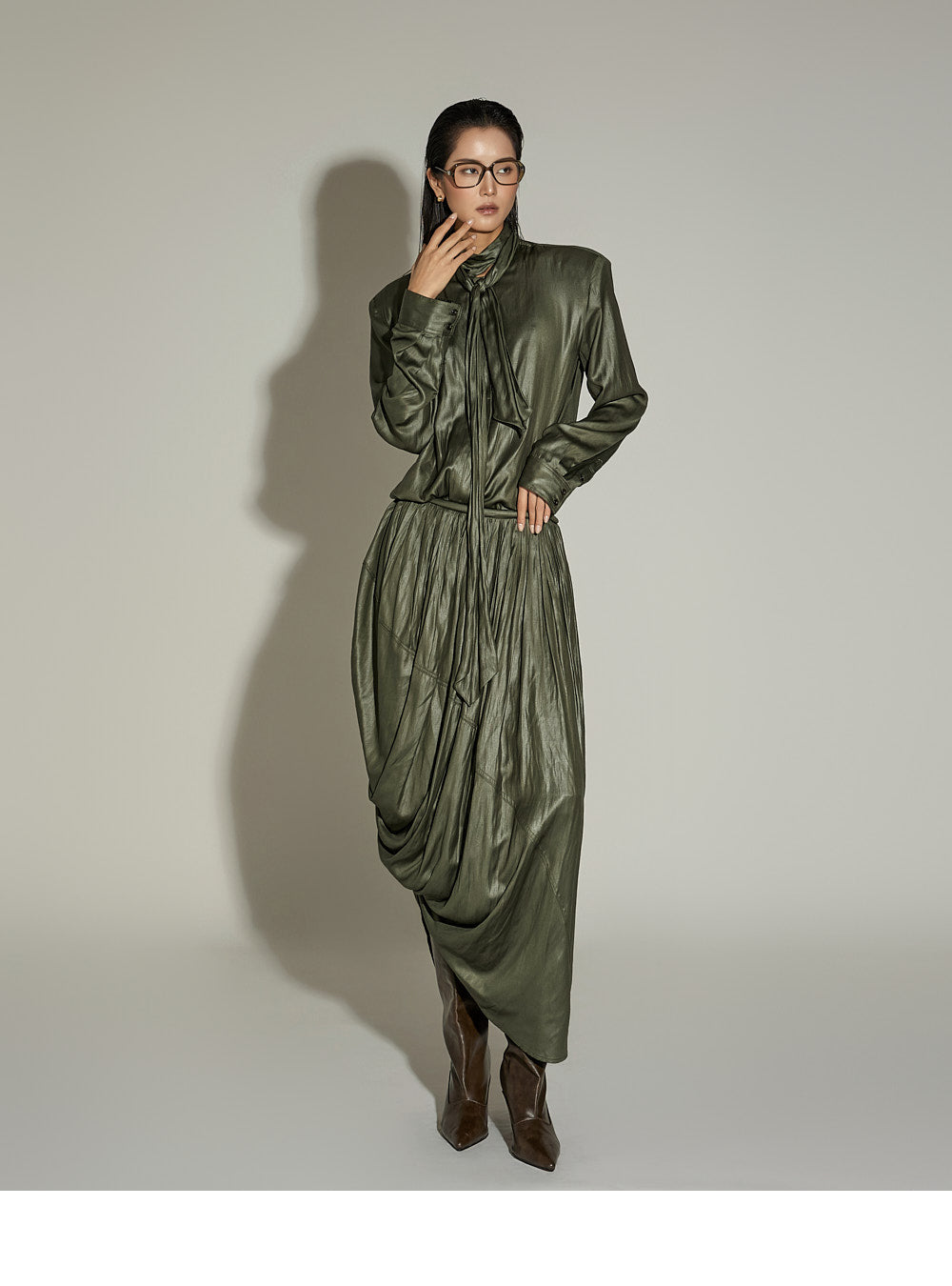 creates a stylish silhouette, and the integrated scarf detail at the neck