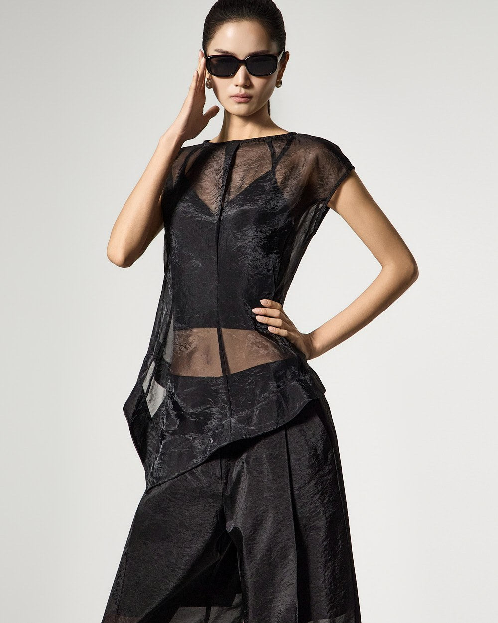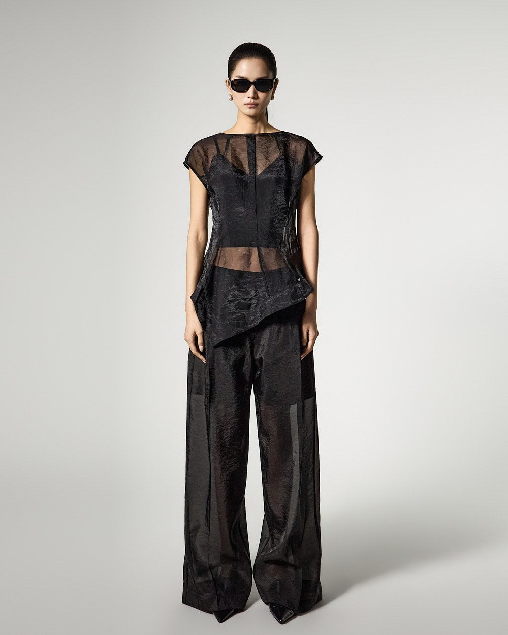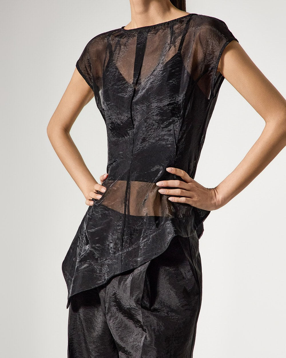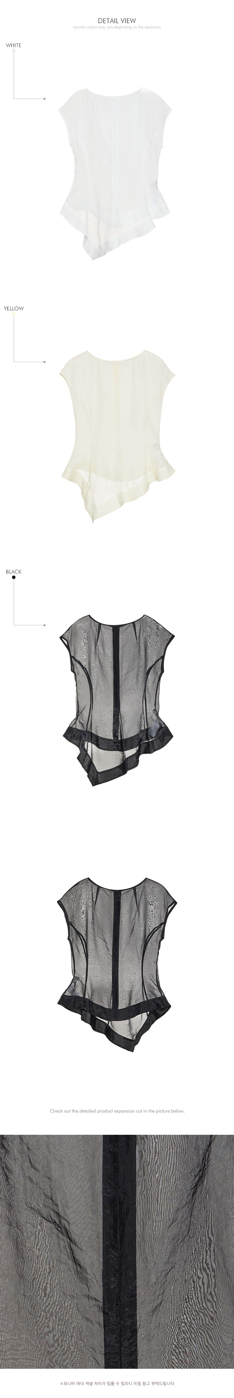 現代的なムードのオーガンジーアシンメトリーブラウスです。