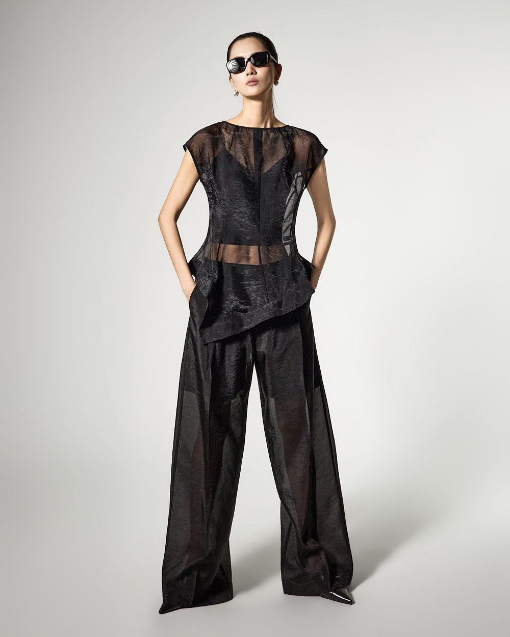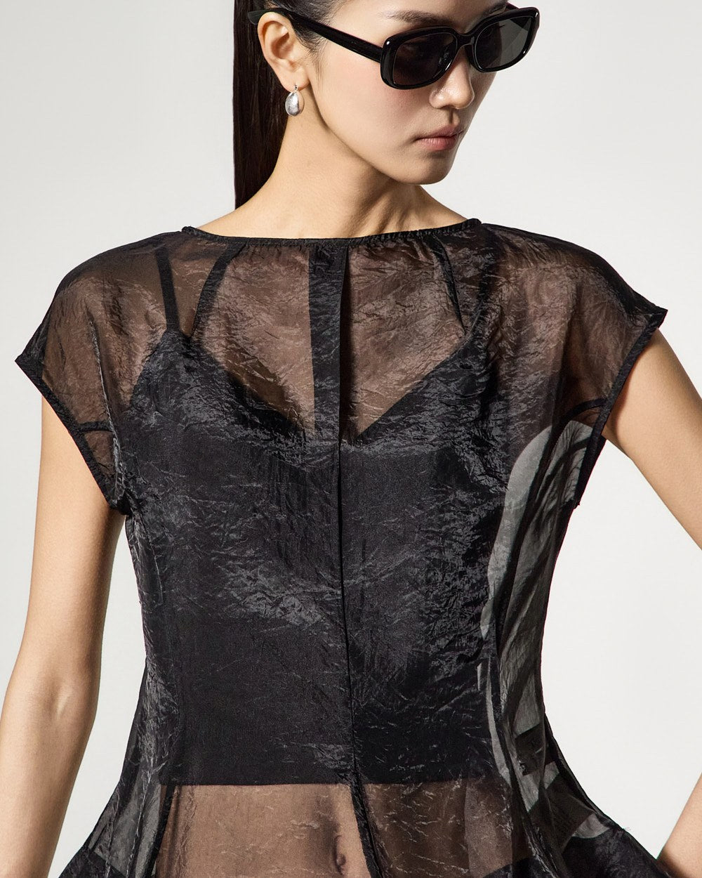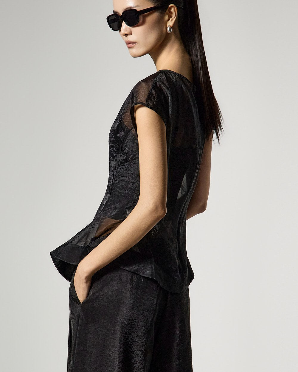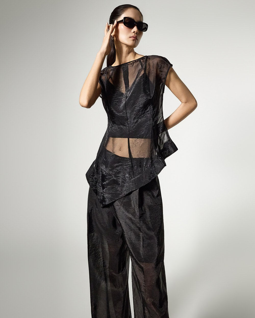現代的なムードのオーガンジーアシンメトリーブラウスです。