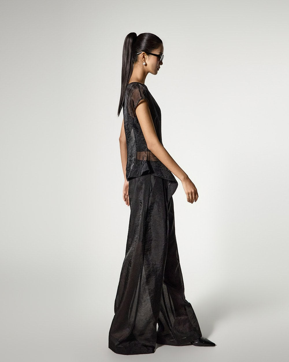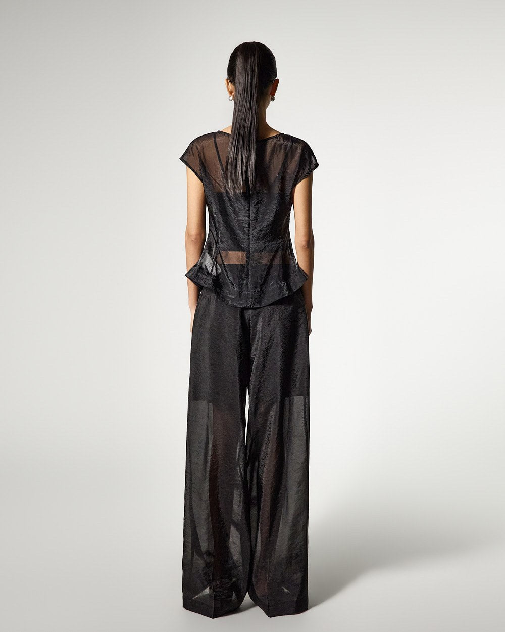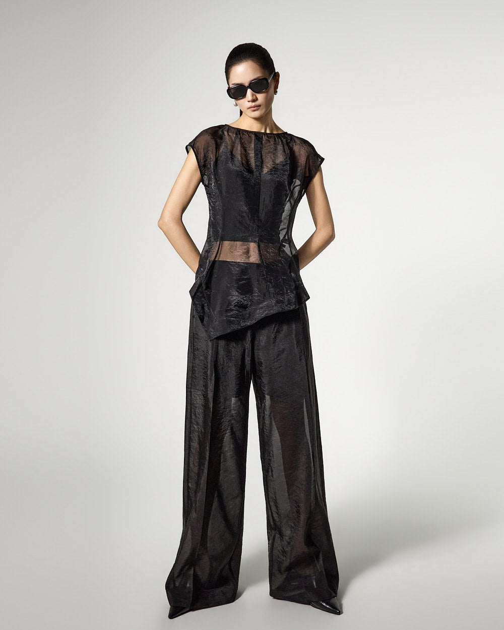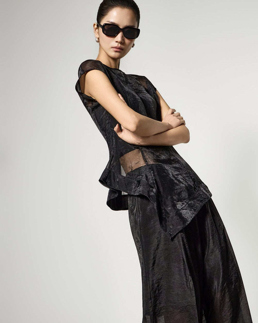 現代的なムードのオーガンジーアシンメトリーブラウスです。