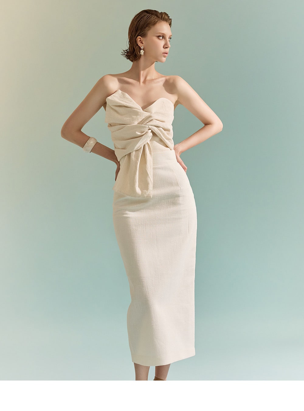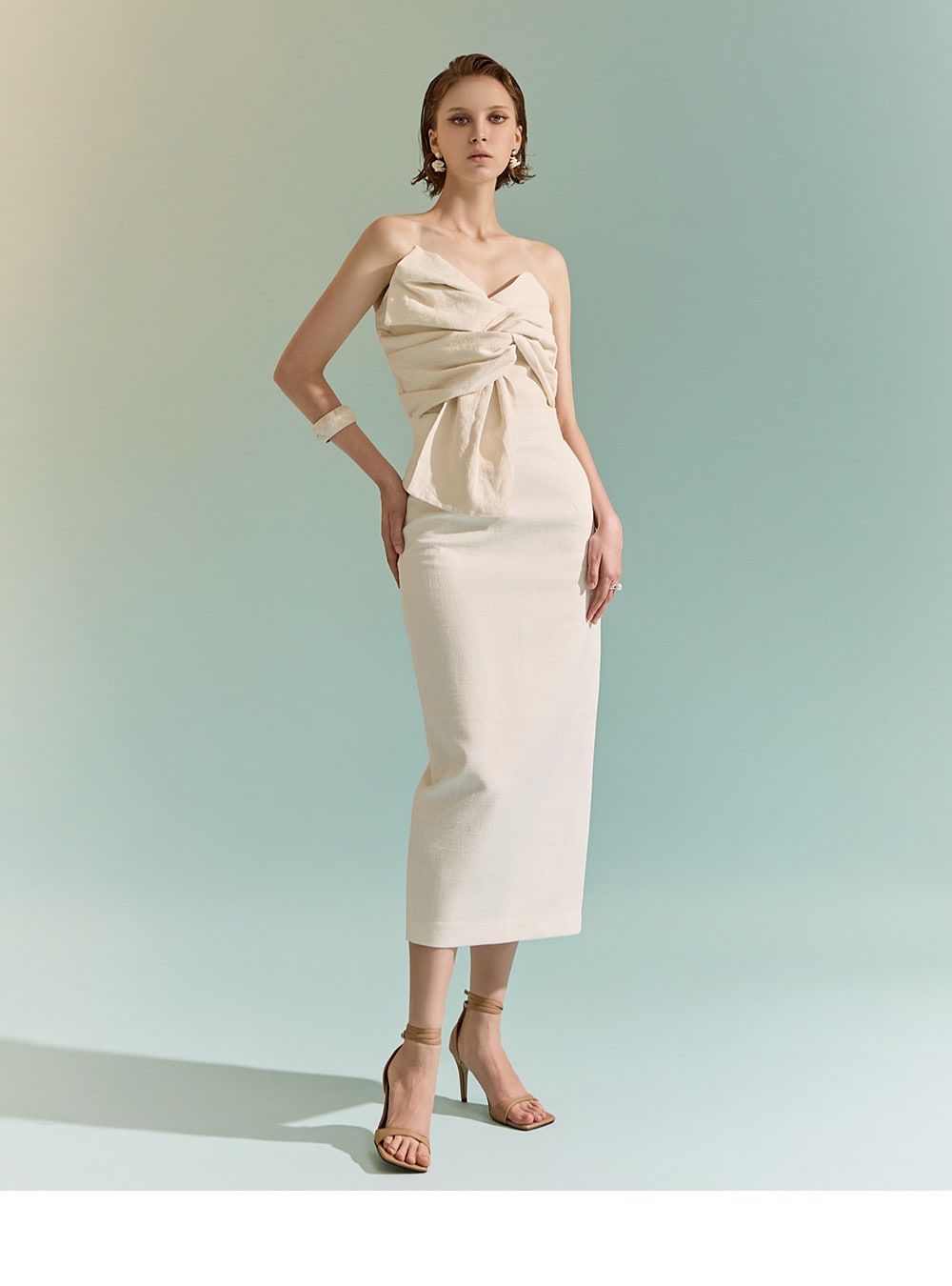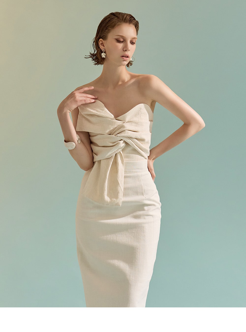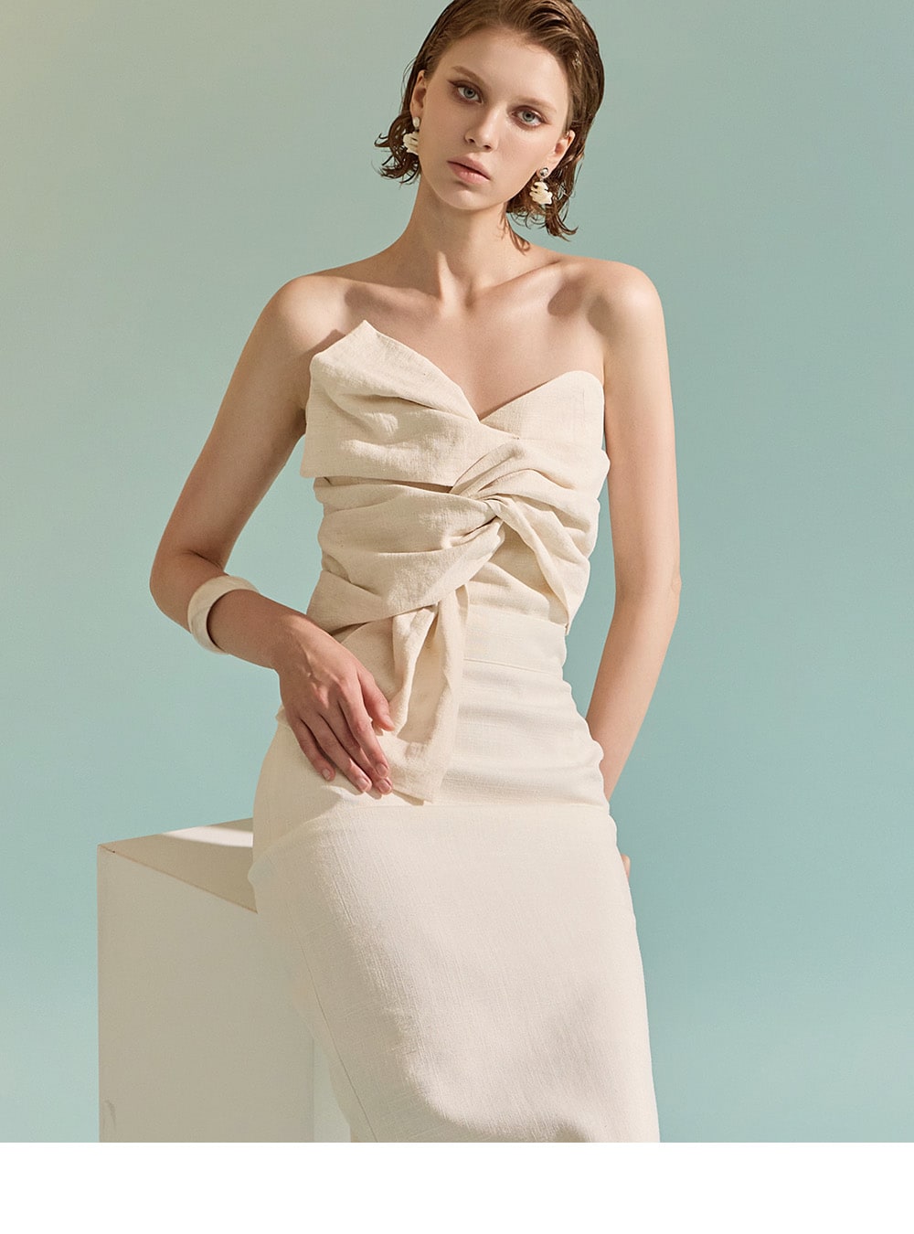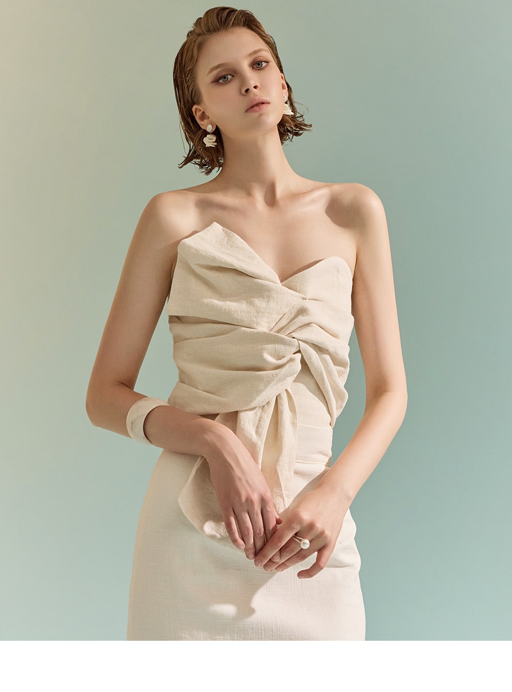 リボンチューブトップデザインが繊細なシルエットを演出します。