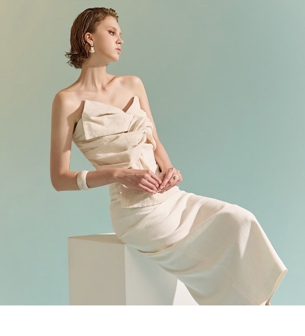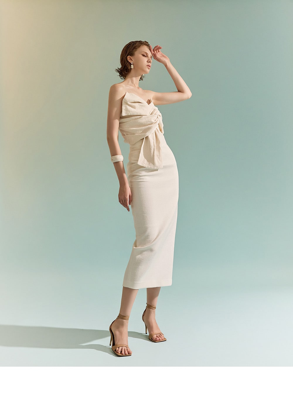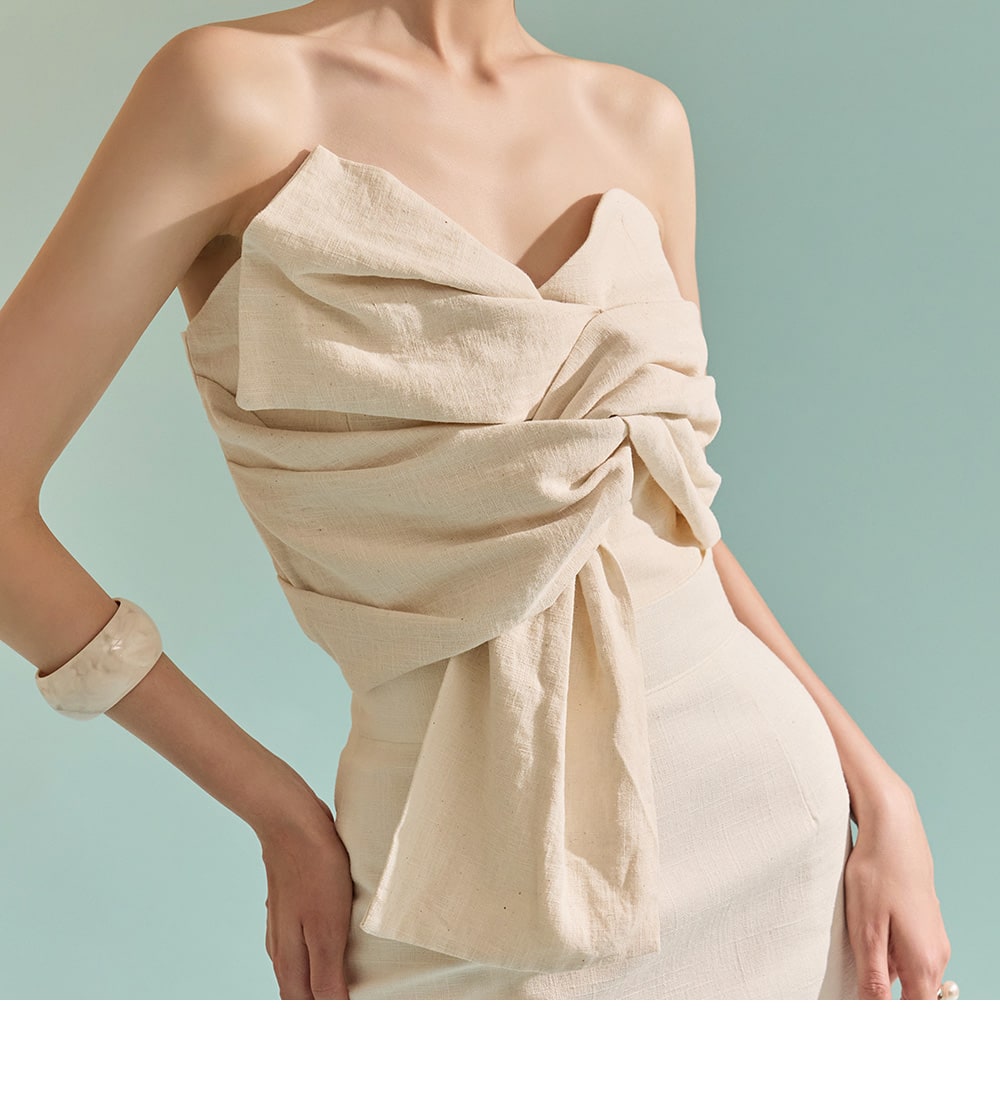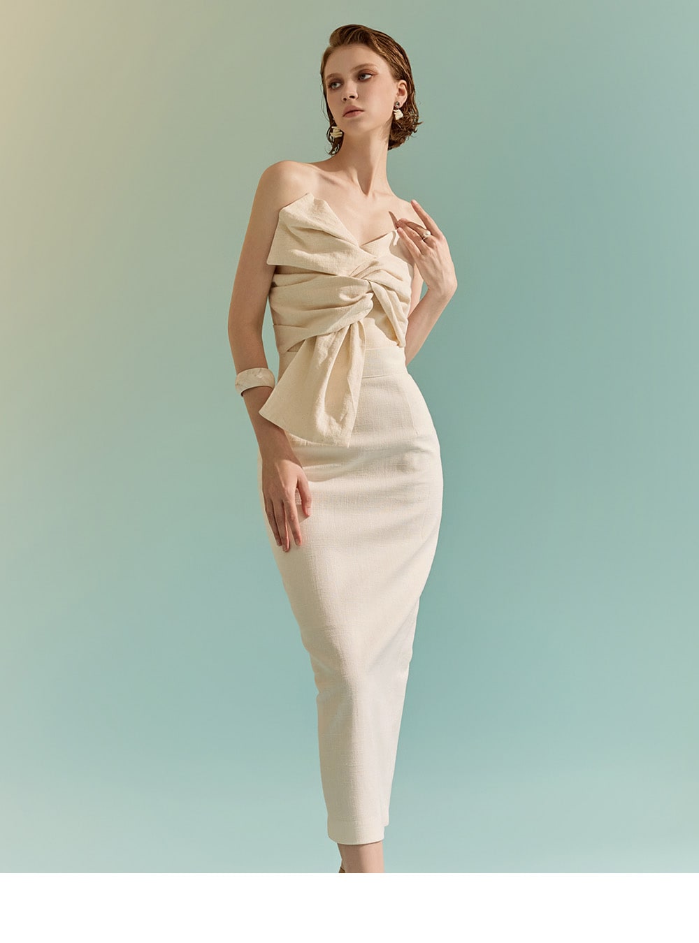 リボンチューブトップデザインが繊細なシルエットを演出します。