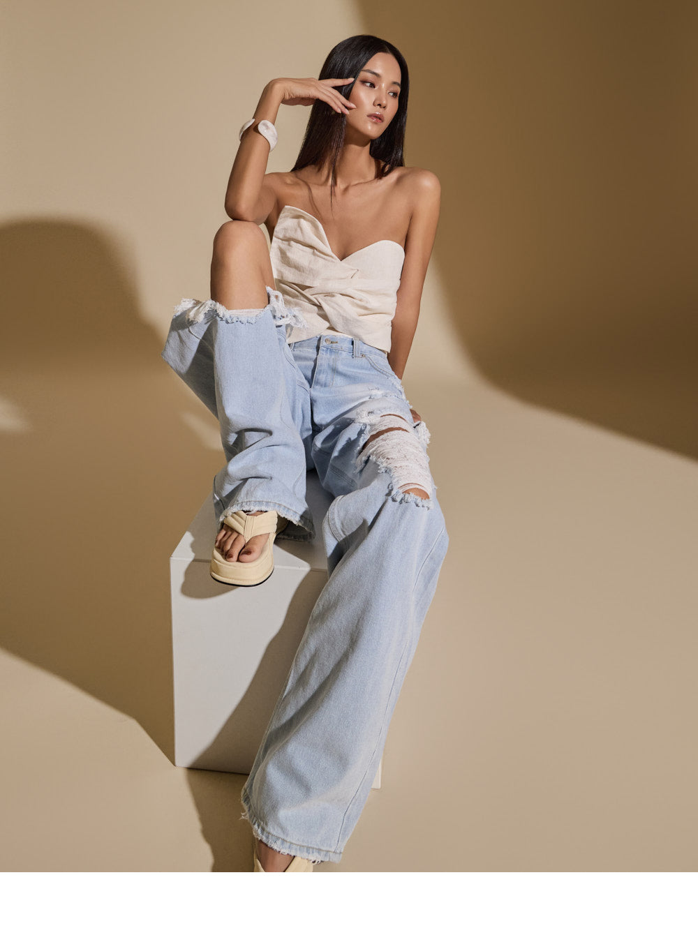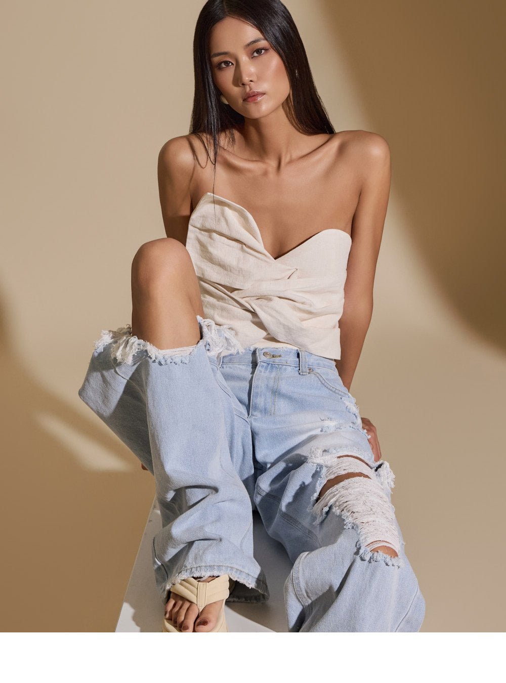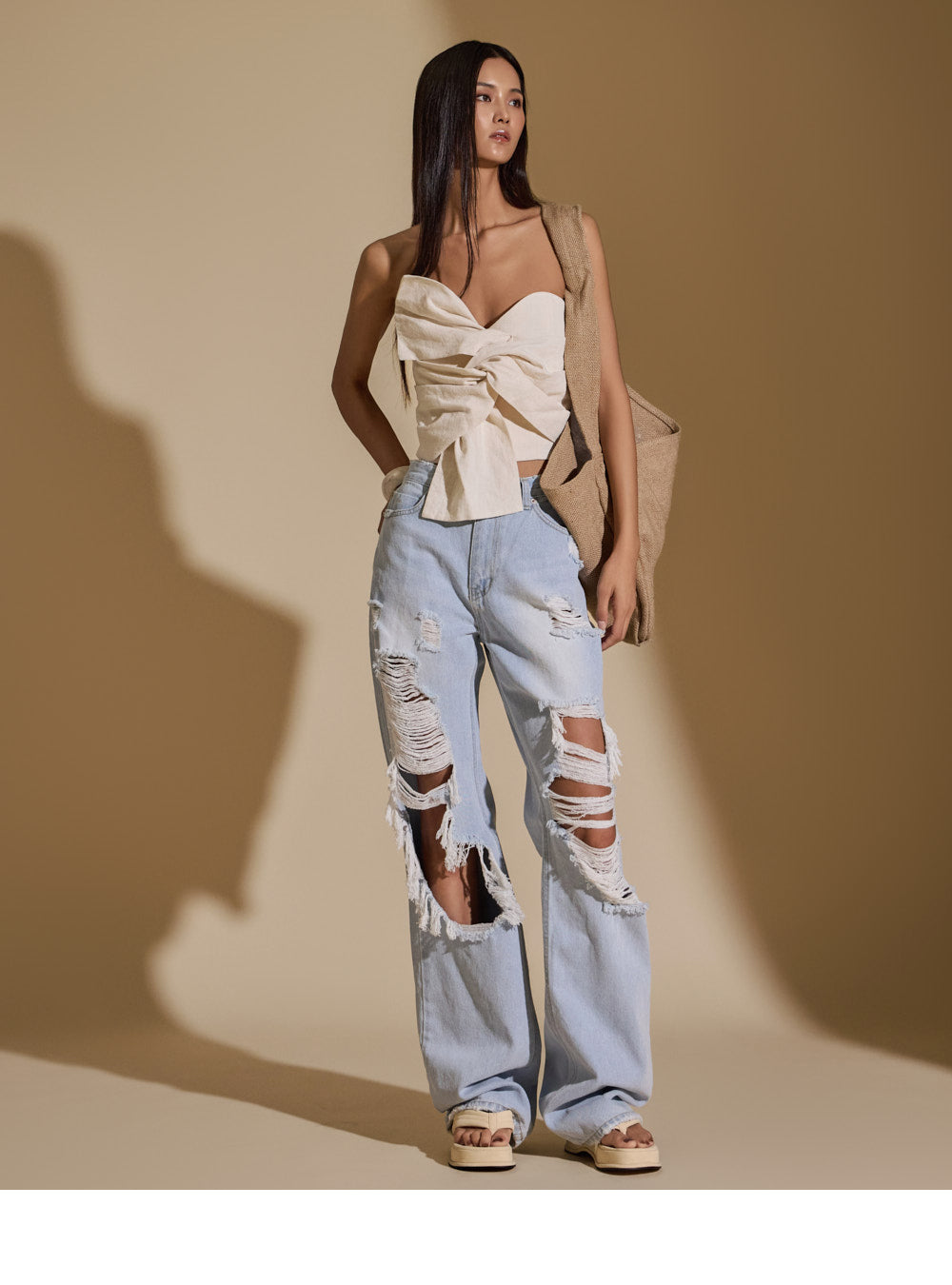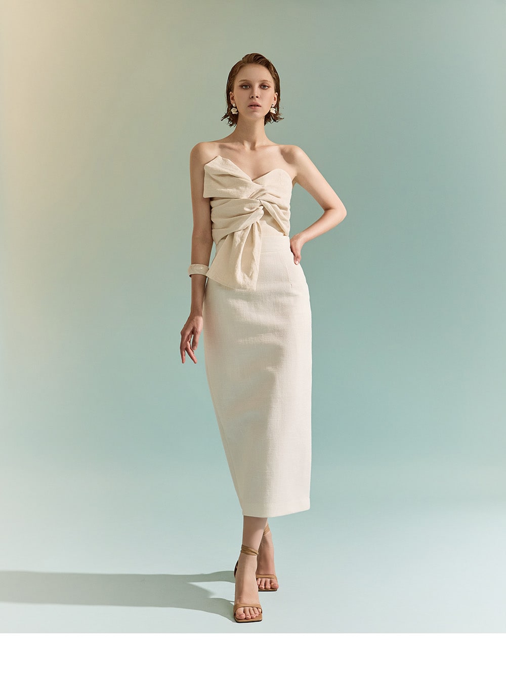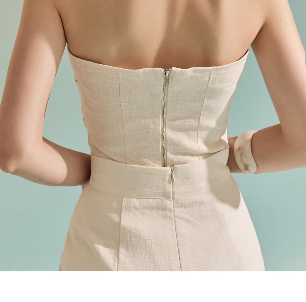 リボンチューブトップデザインが繊細なシルエットを演出します。
