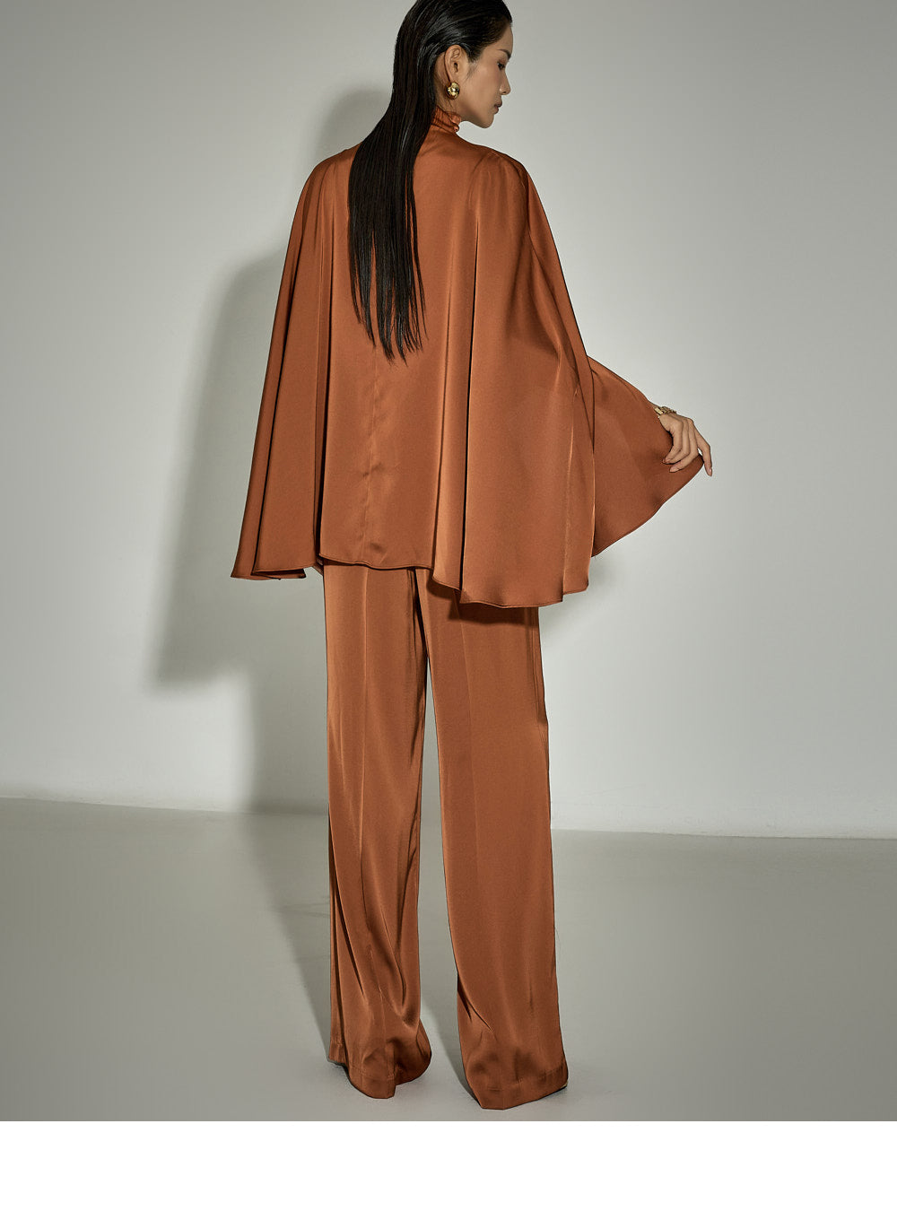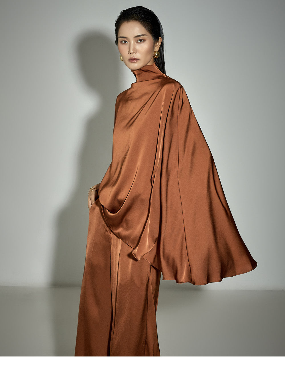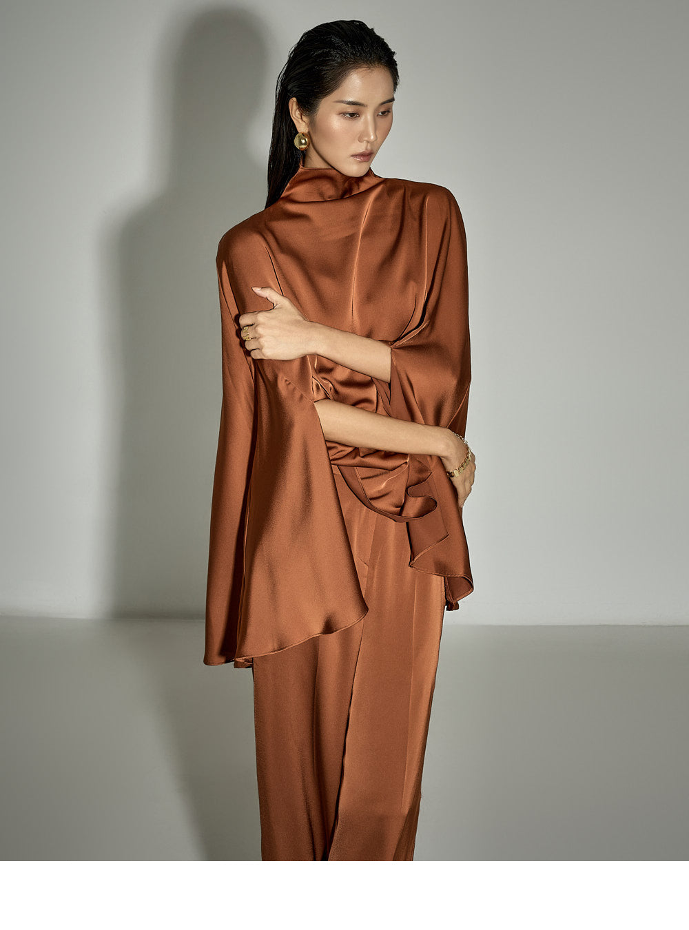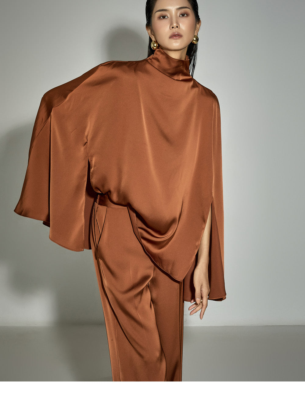 a high neckline for a sophisticated look, and a lightweight cape design.