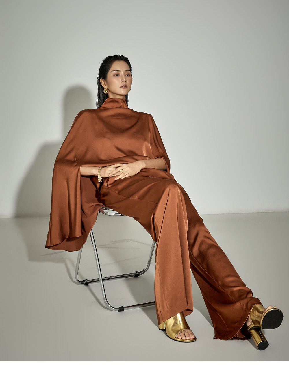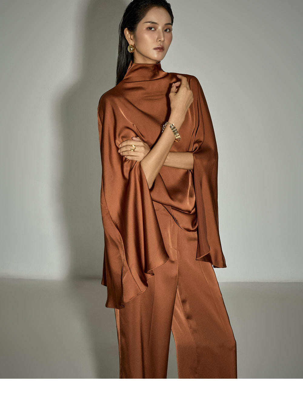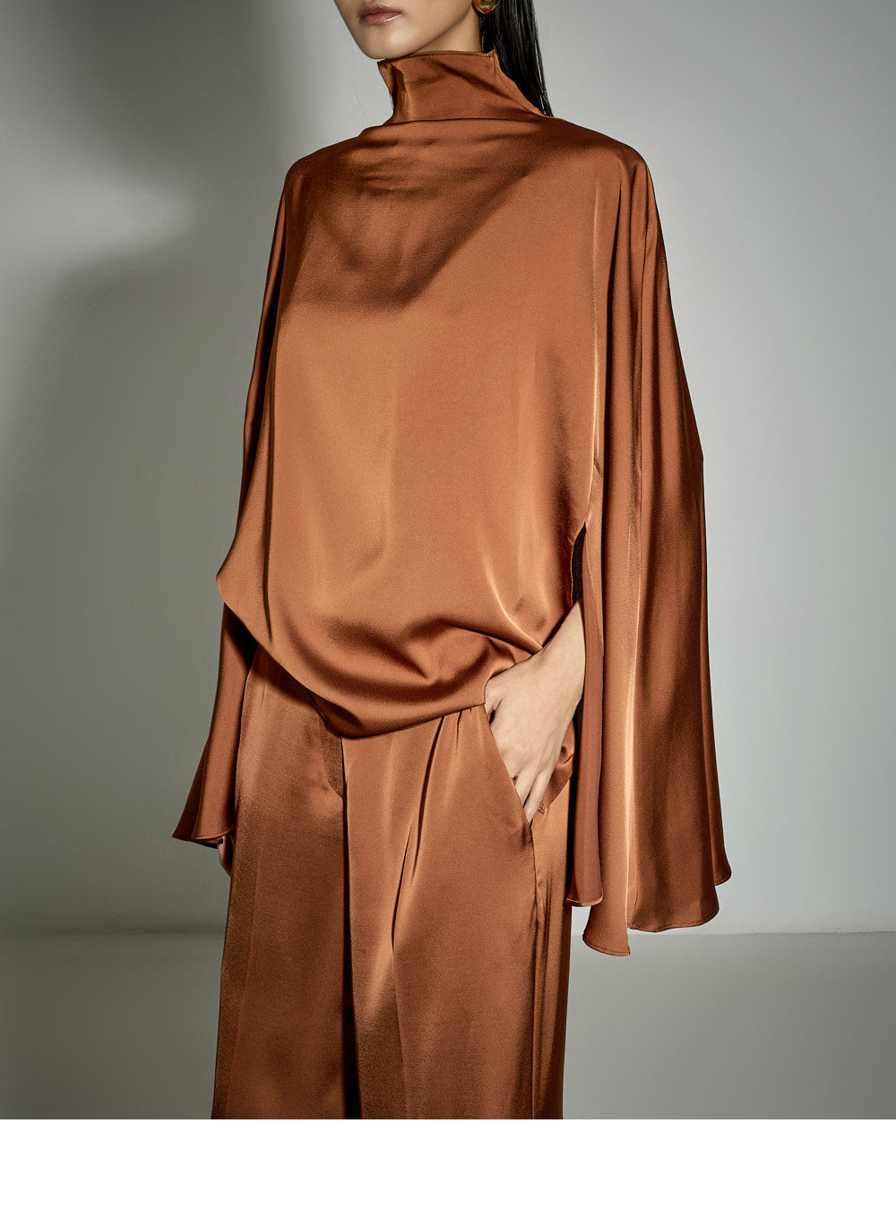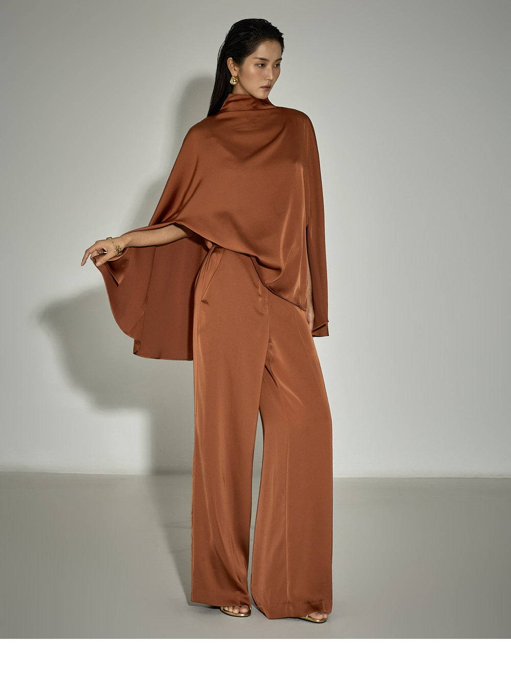a high neckline for a sophisticated look, and a lightweight cape design.