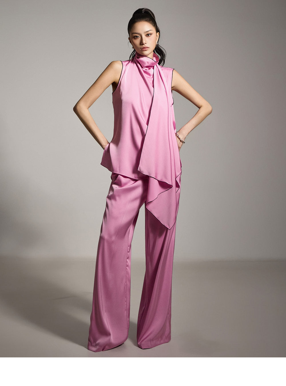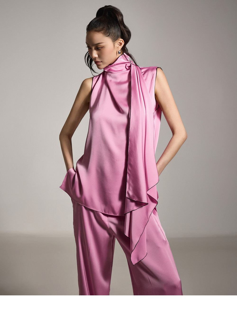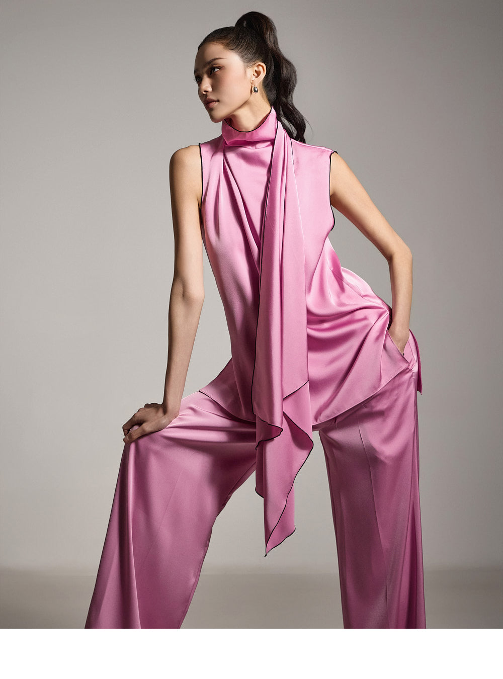 幅広のスカーフディテールがユニークで目を引くポイントを加えます。