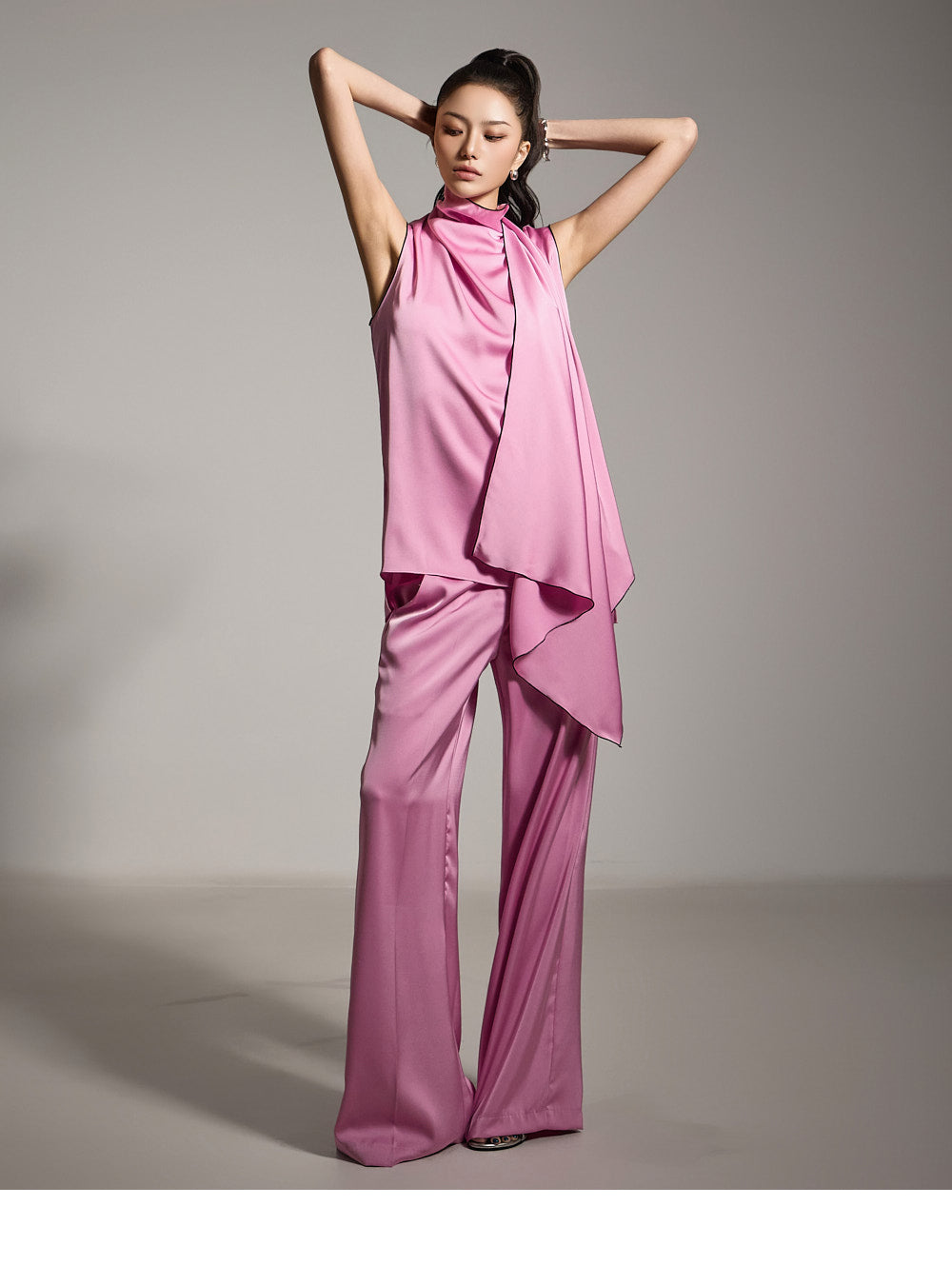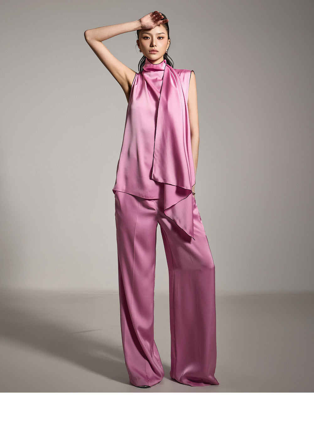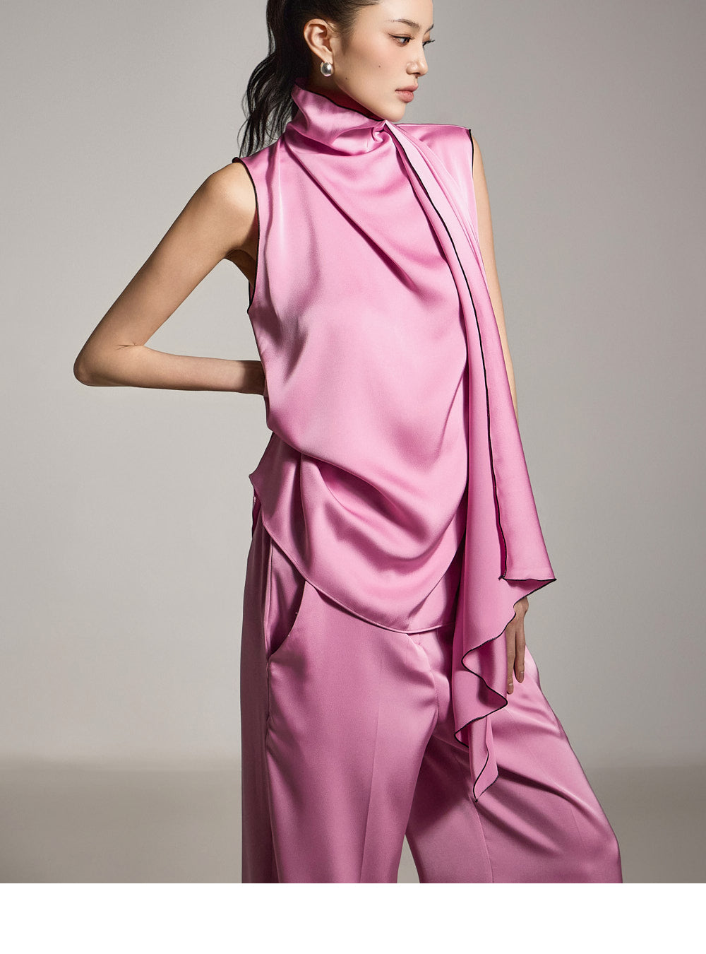幅広のスカーフディテールがユニークで目を引くポイントを加えます。