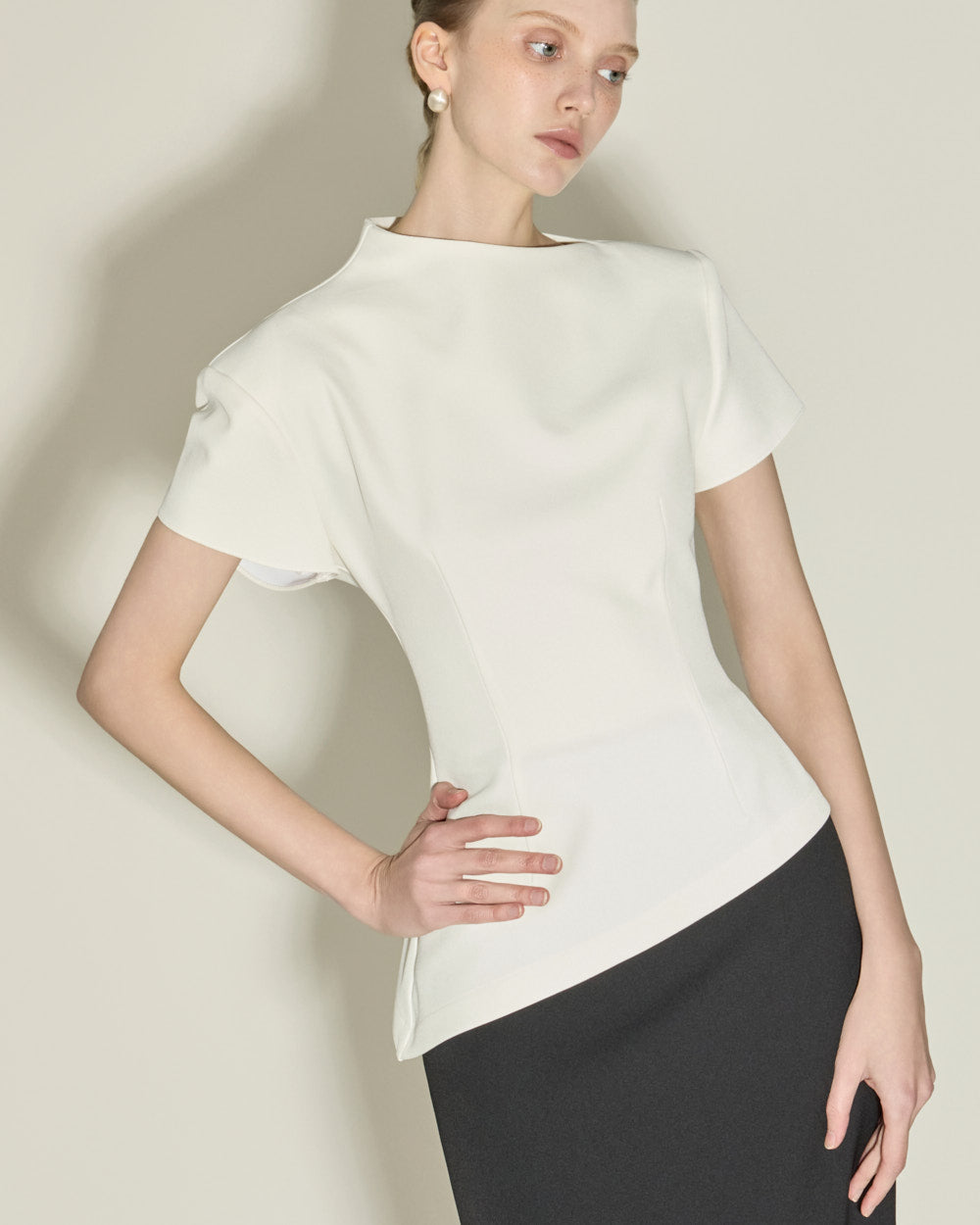 This uneven neck blouse exudes a sophisticated and feminine vibe.