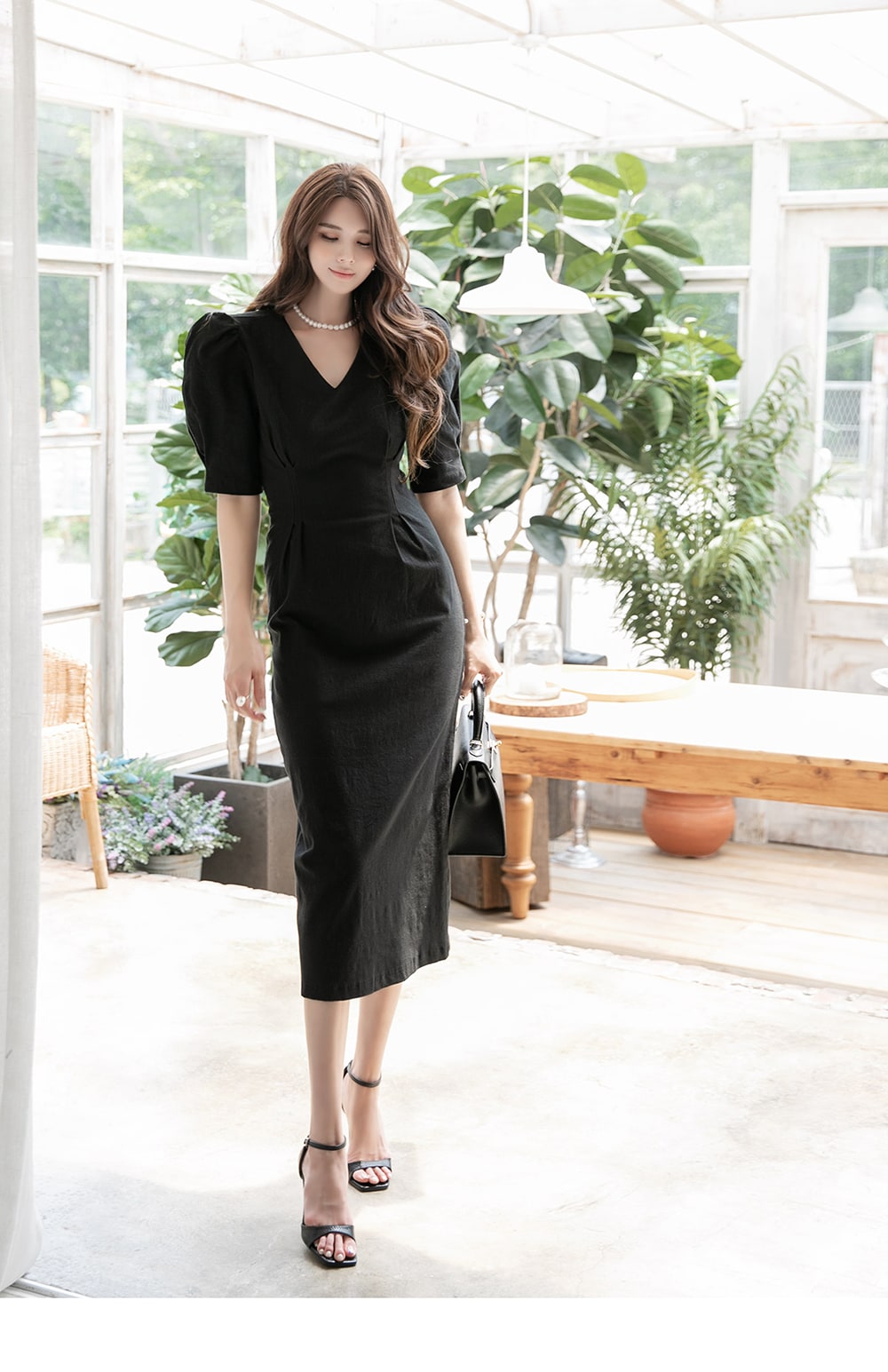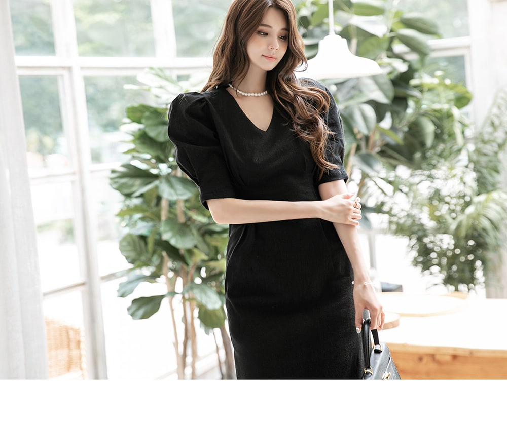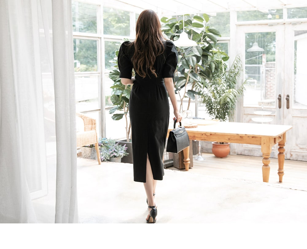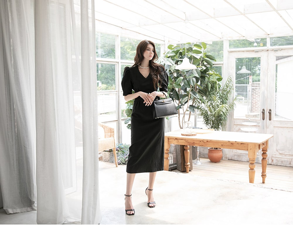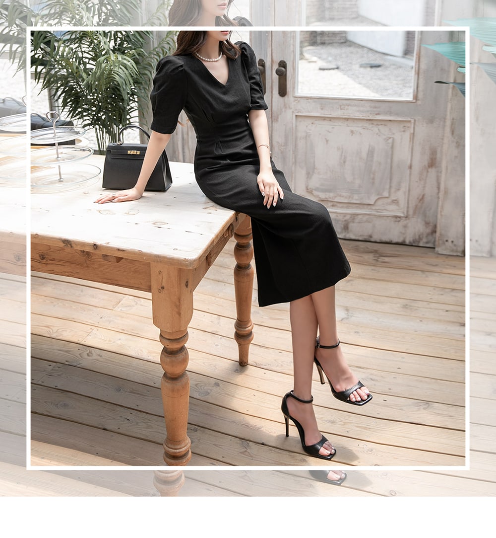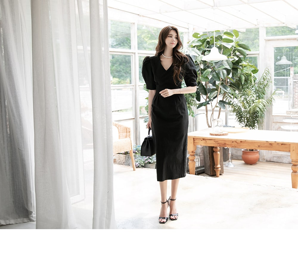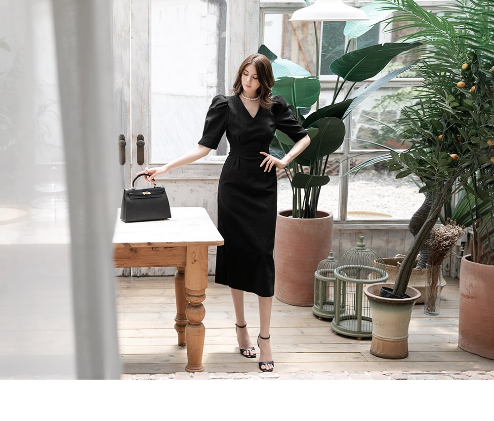 「リネンパフスリムミディドレス」を合わせて。
