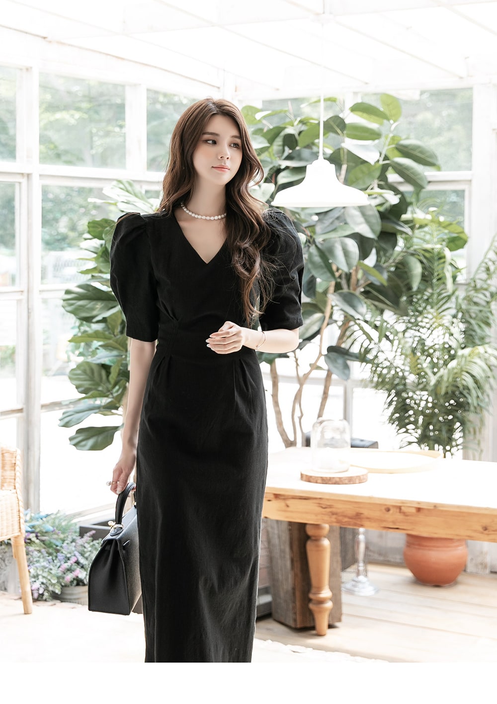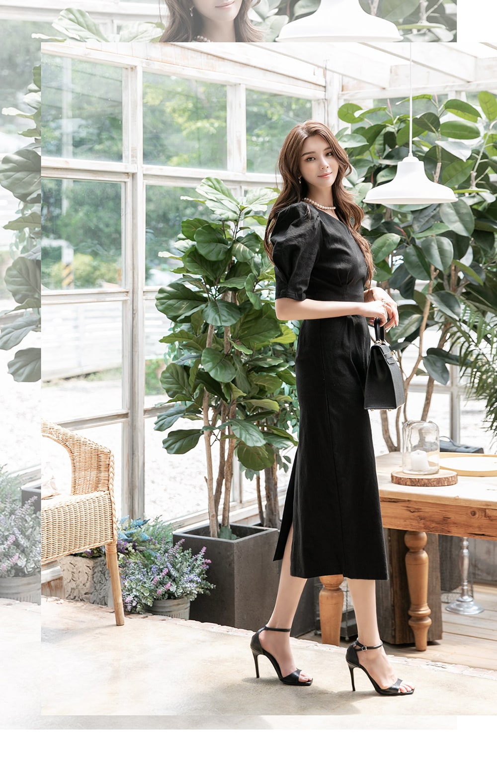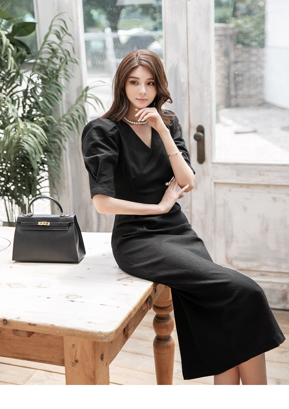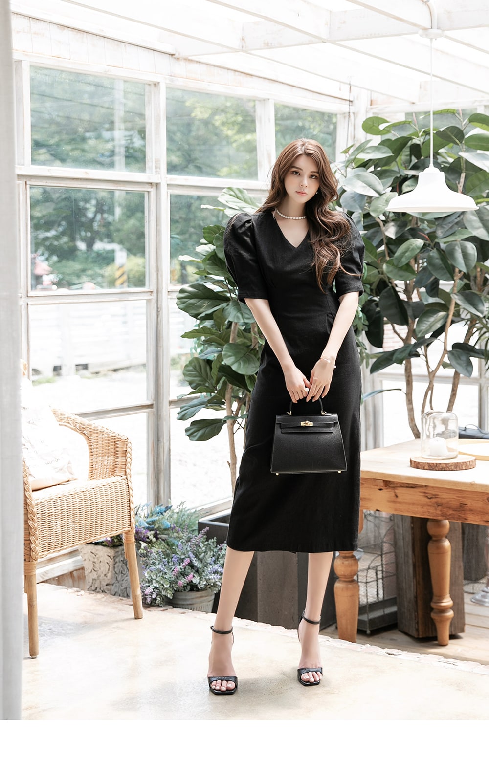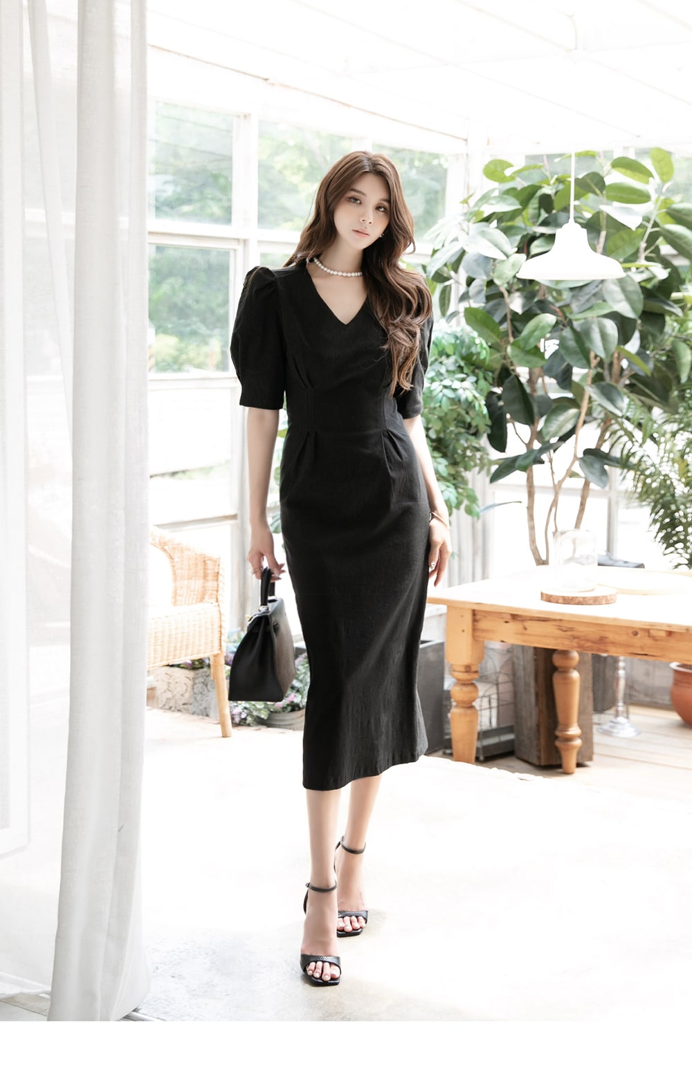 「リネンパフスリムミディドレス」を合わせて。