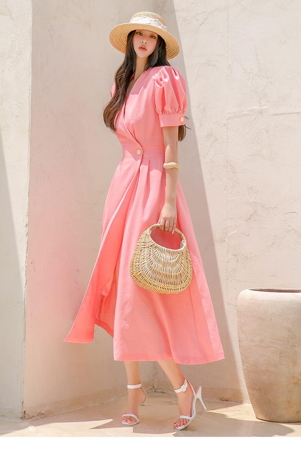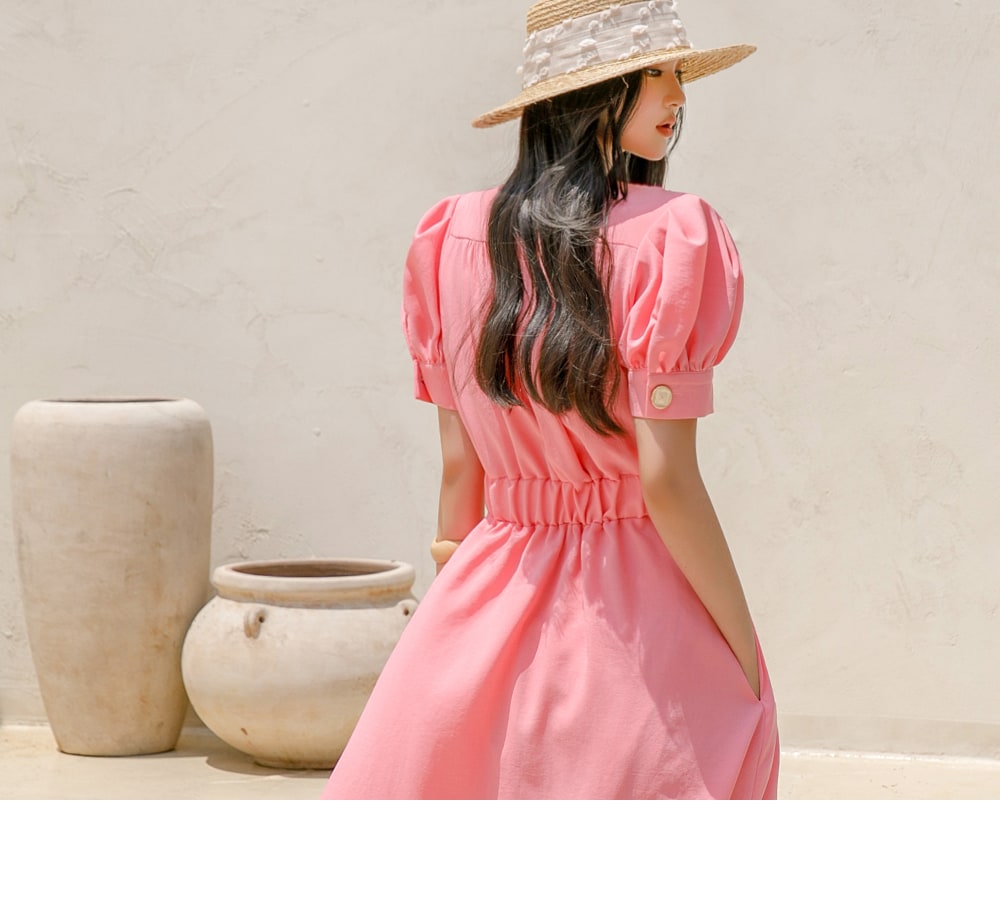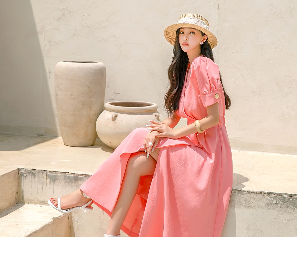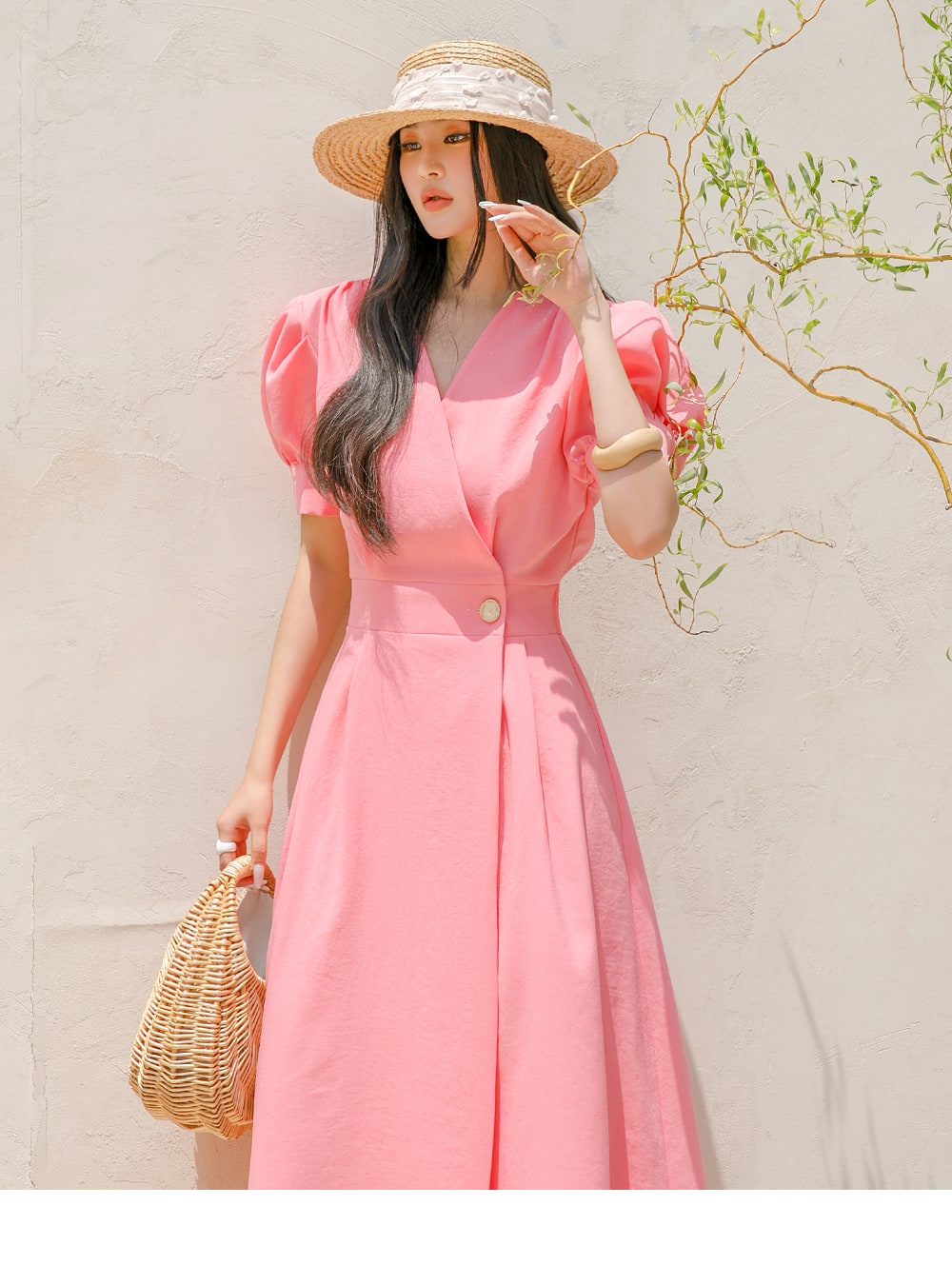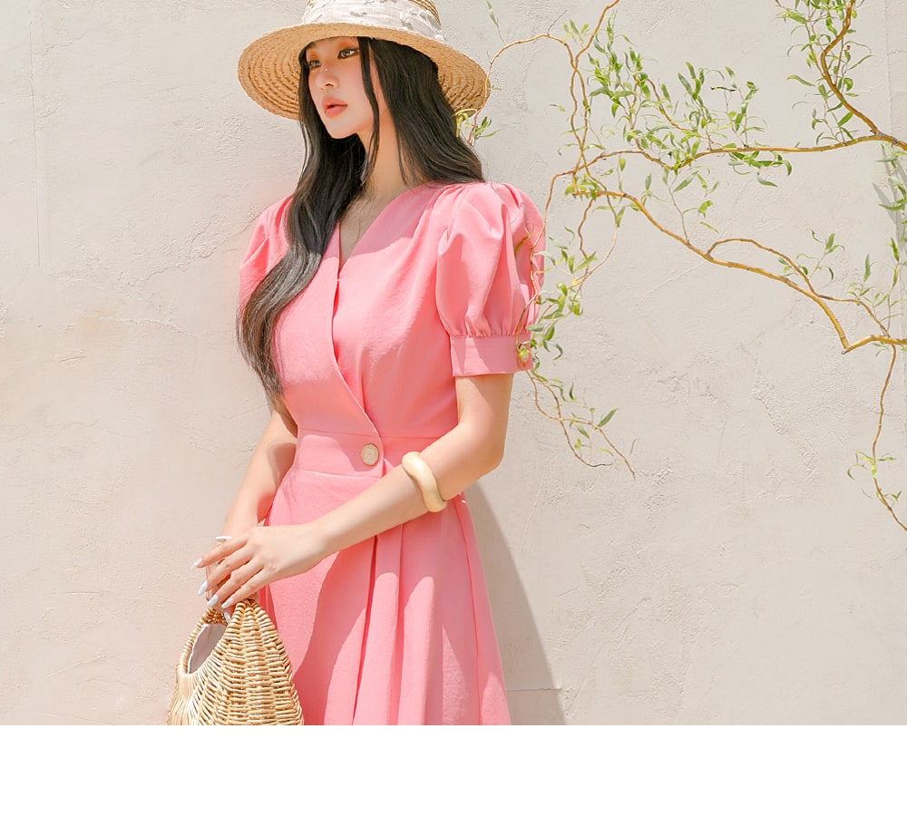 肩パッド付きのボリュームのあるパフスリーブが構造的なシルエットを作り出します。