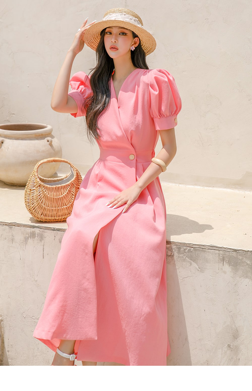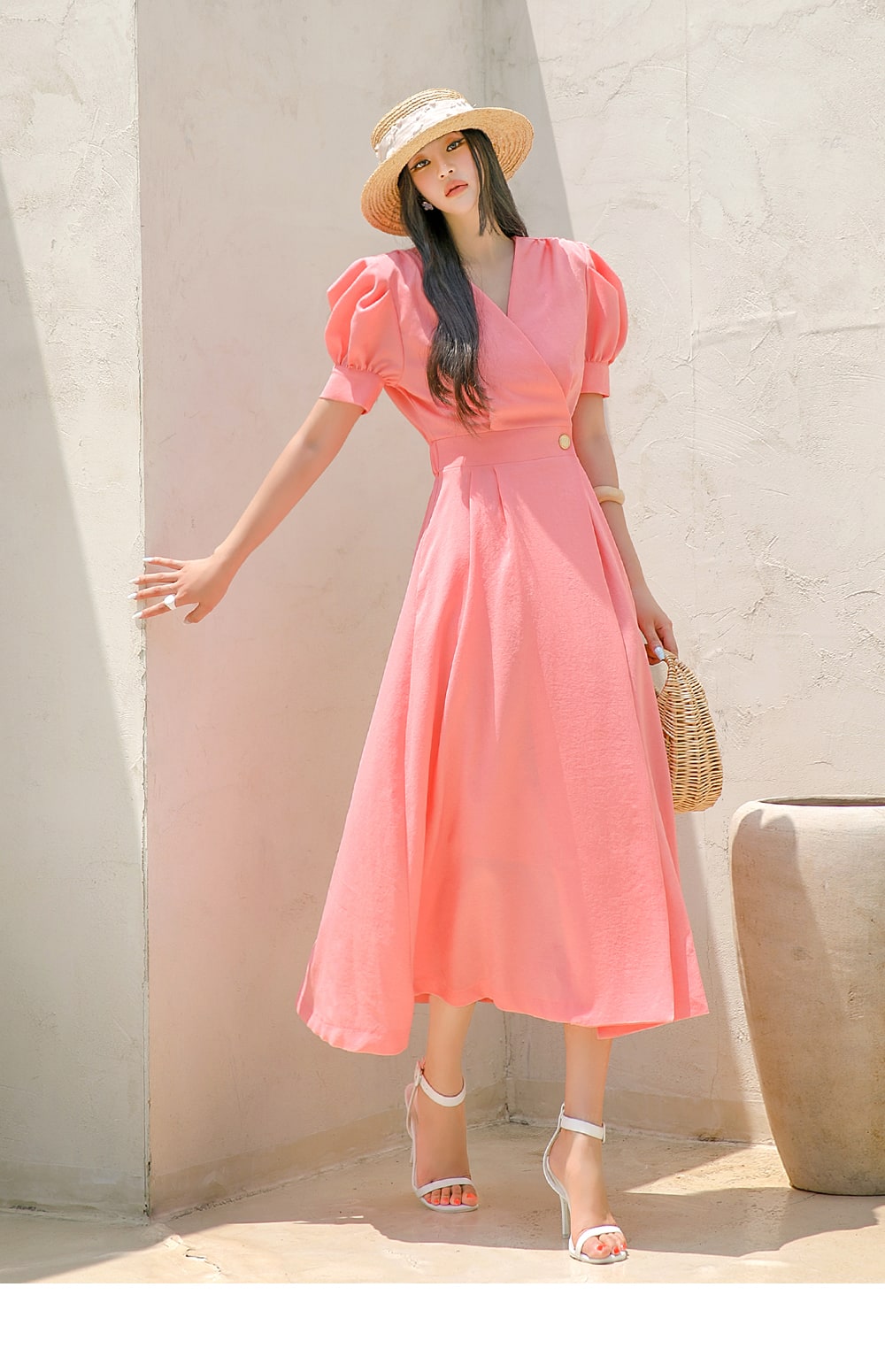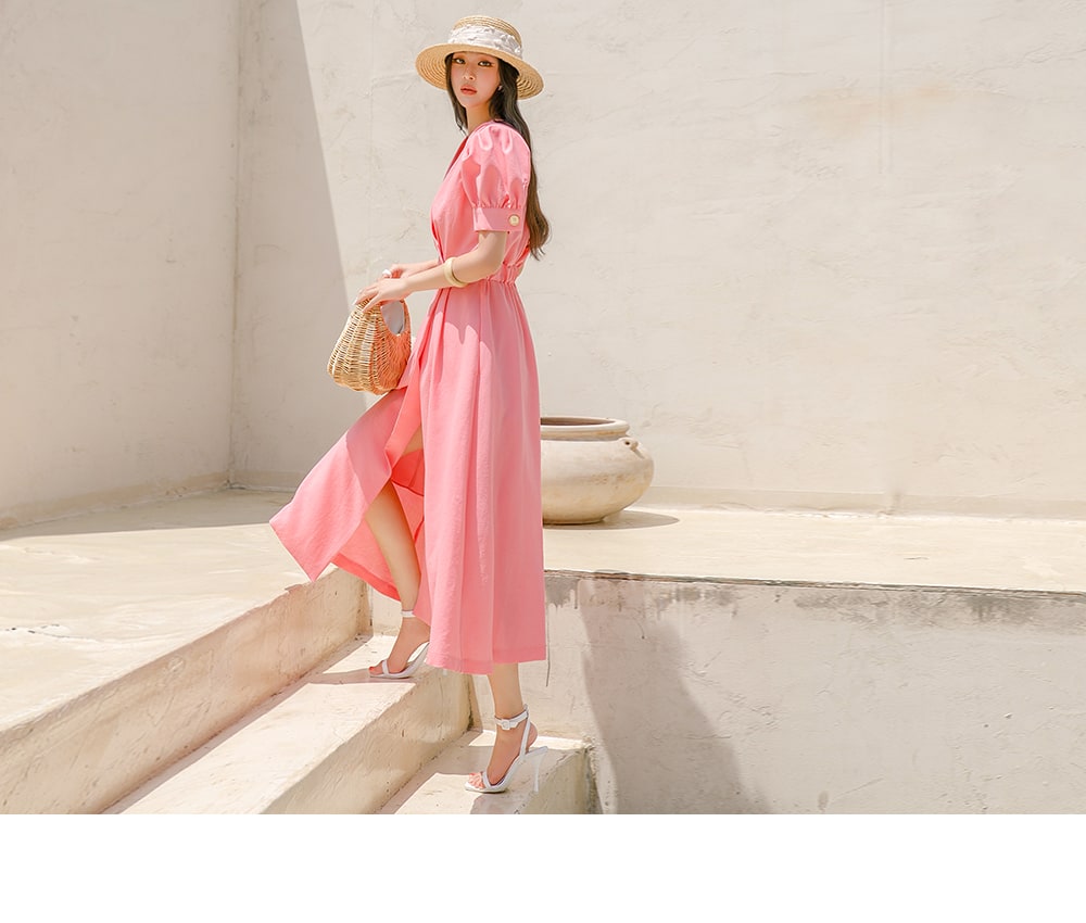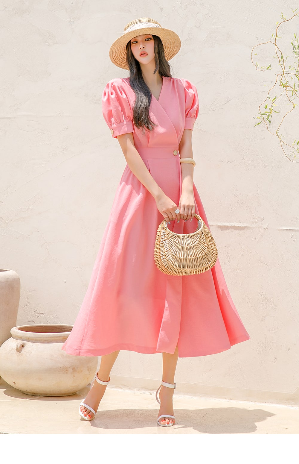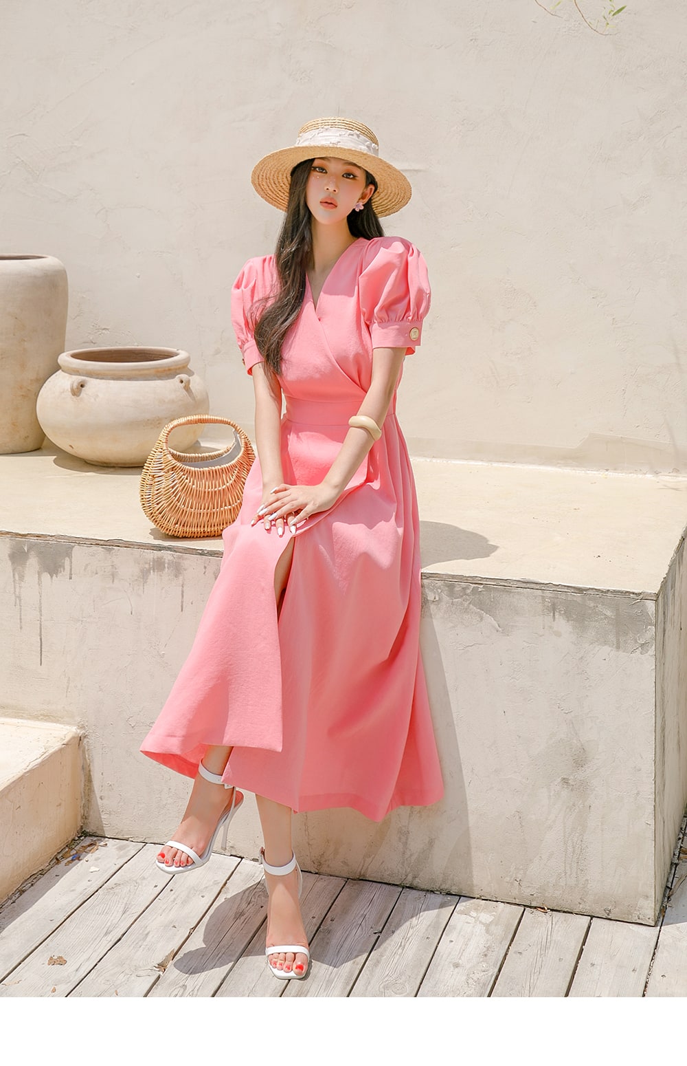 肩パッド付きのボリュームのあるパフスリーブが構造的なシルエットを作り出します。