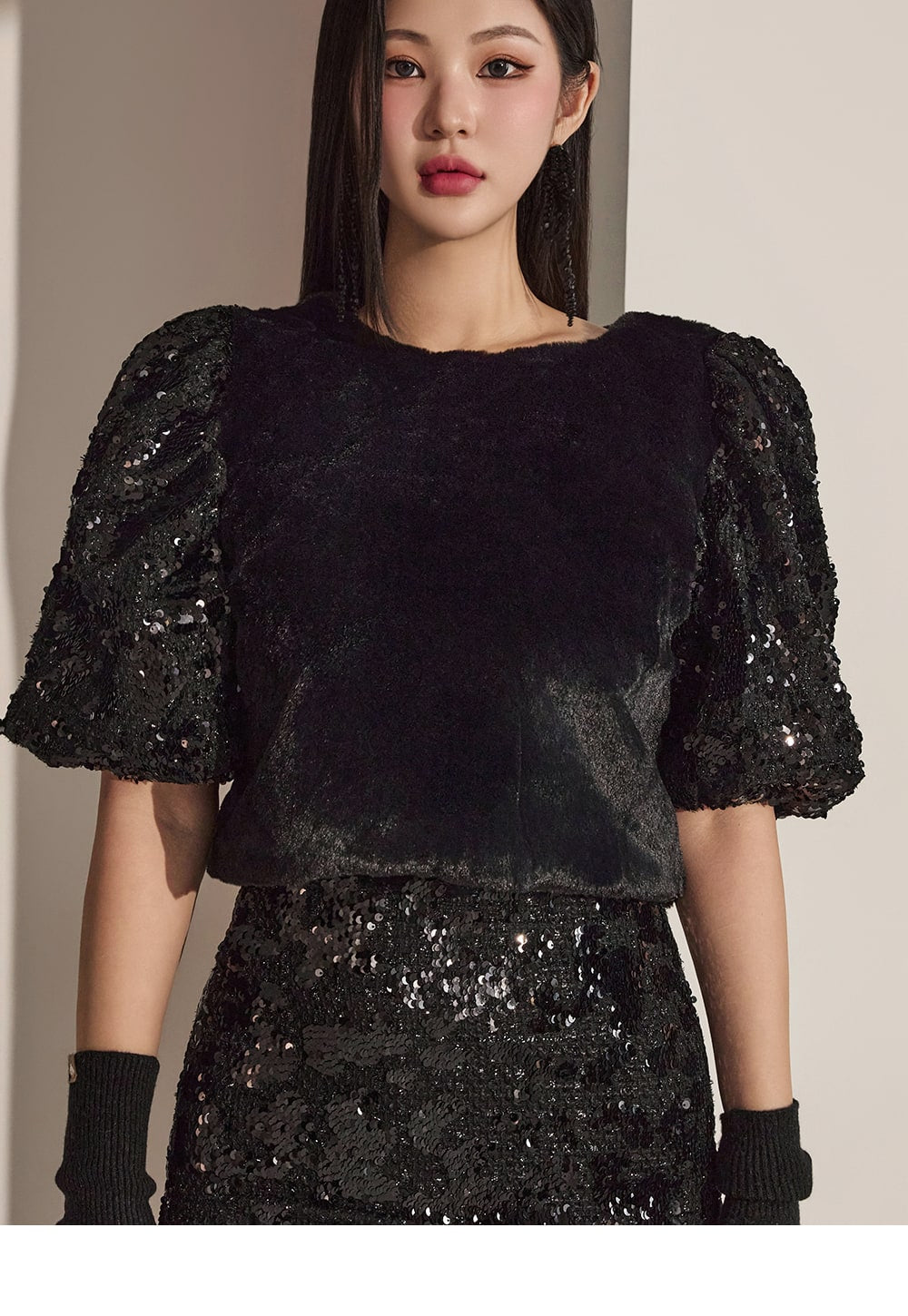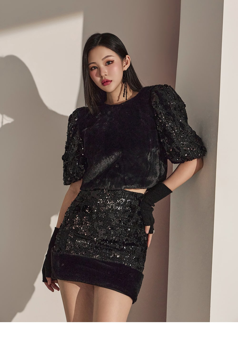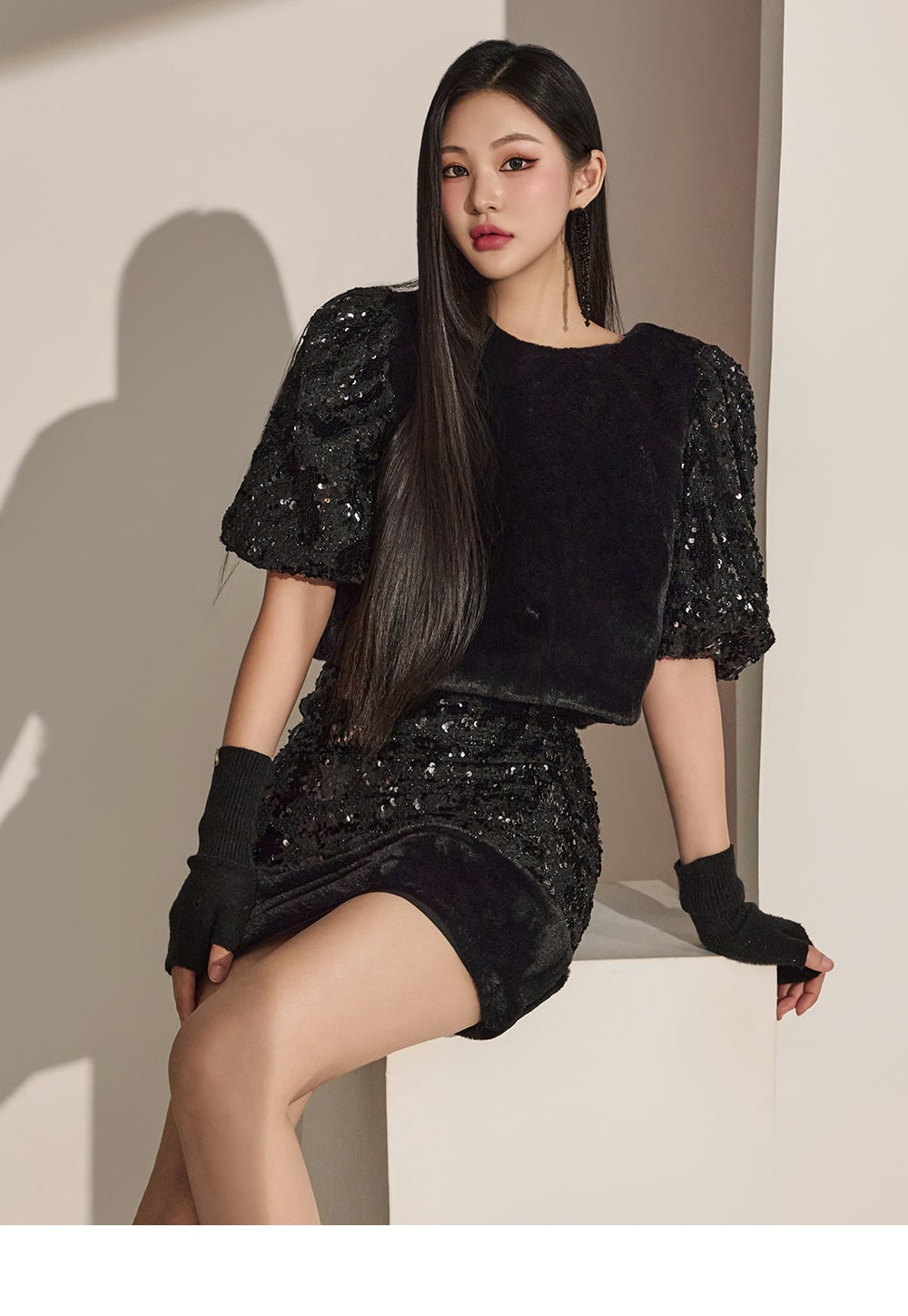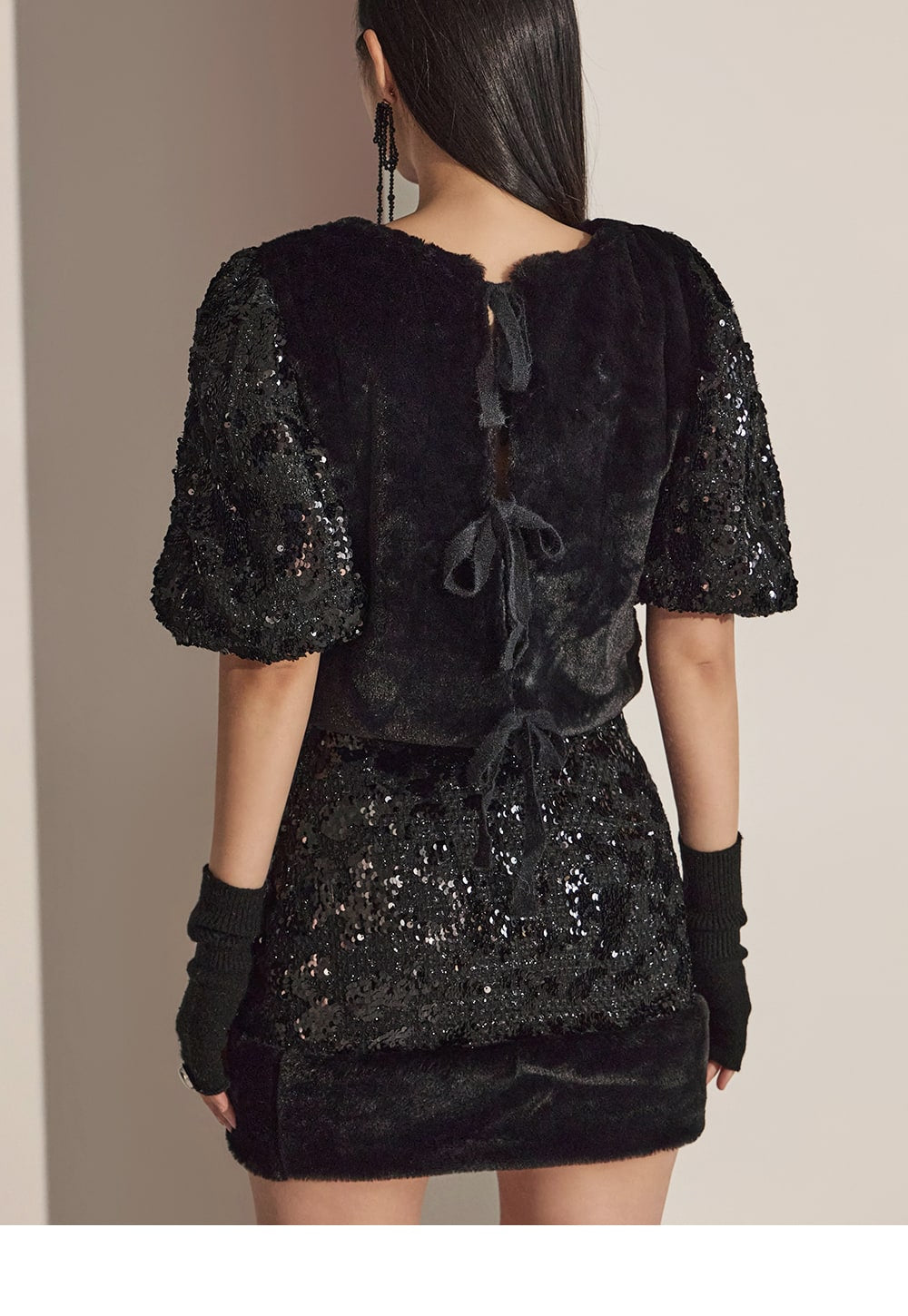 スパンコールの袖のディテールがユニークなタッチを加え、全体の雰囲気を高めます。